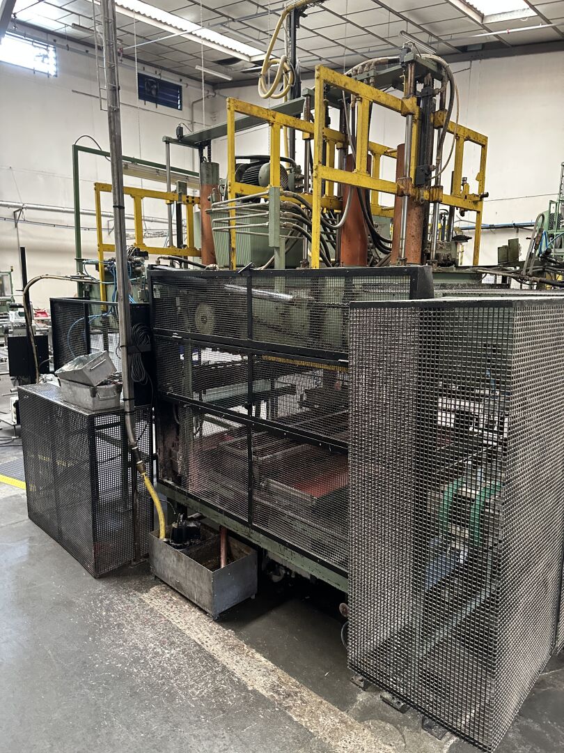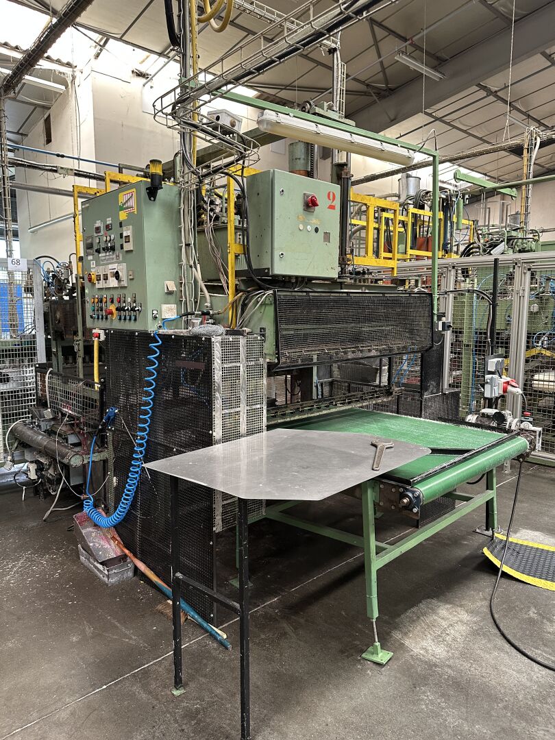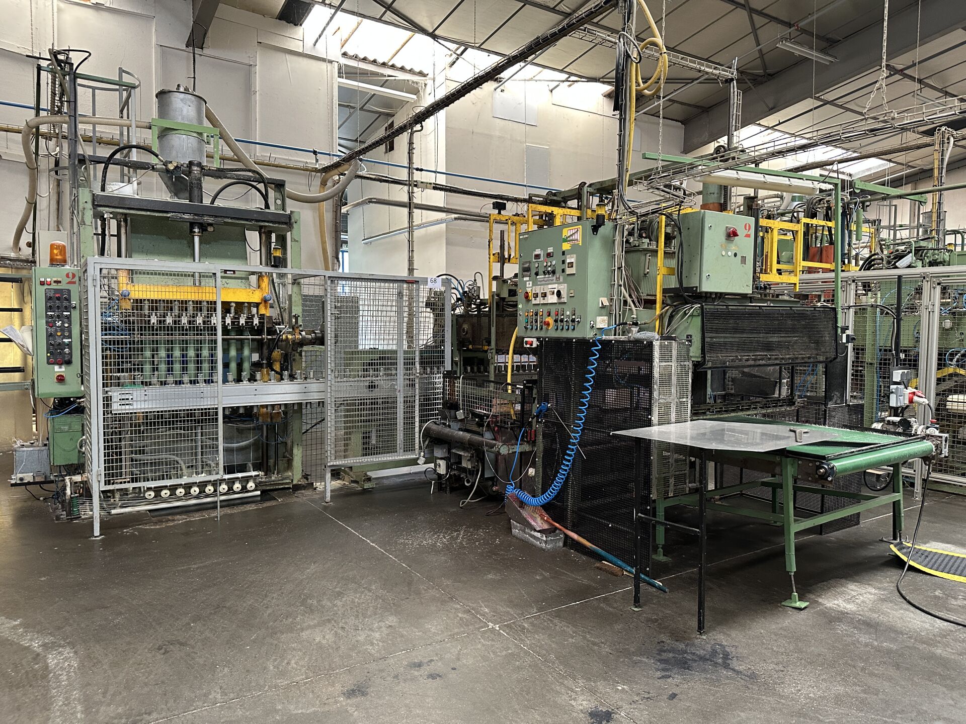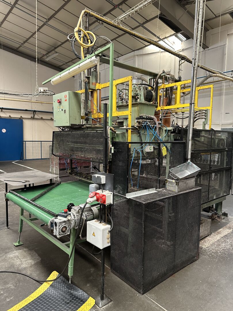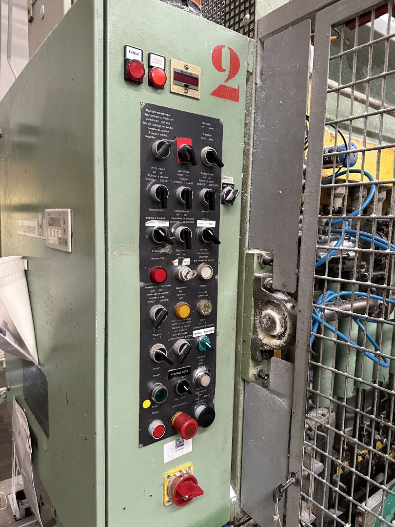 P2 : PRESSE DE FABRICATION DE BOUGIES COMPRENANT : -1 rouleau à poudre 3000 x diam 2000 mm équipé d'un bac de pulvérisation bain d'huile et d'un bac de stockage de poudre inox 1200 x 1100 x 1000 mm mobile ( dans un espace cloisonné bois à démonter) alimentant : -1 presse GUNST GMBH 22985 de 1987 rétrofitée par HERRHAMMER -8 moules diam 48 mm -module d'insertion de mèches -1 chaine à taquets longueur 450 cm -1 module de trempage FTM 19/430 253 -1 lot de moules -1 convoyeur à bande 1300 x 1500 mm (frais de mise à disposition 150 € TTC)