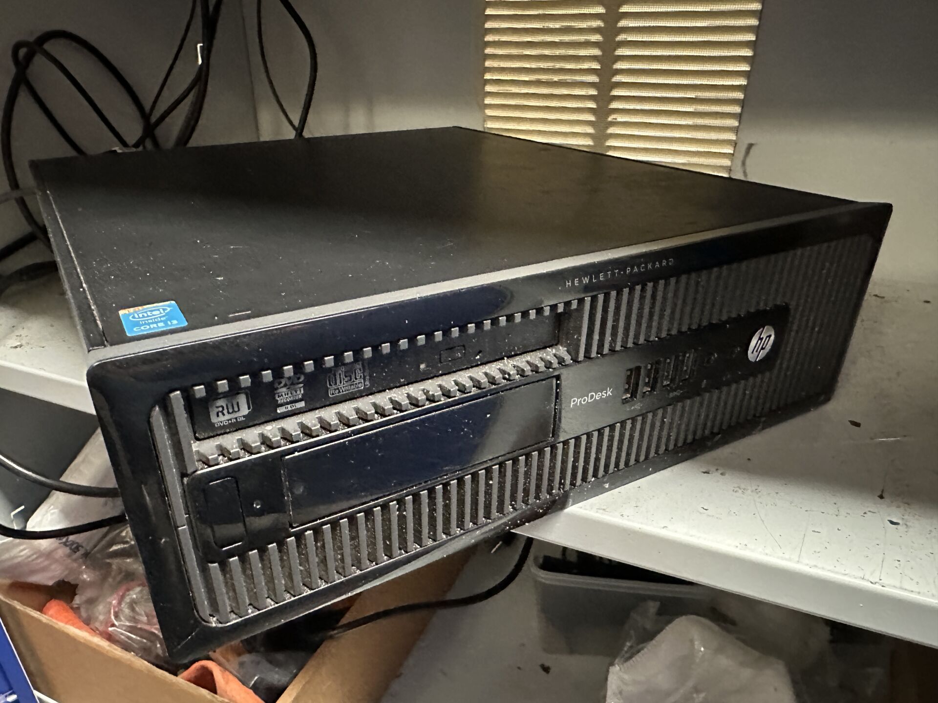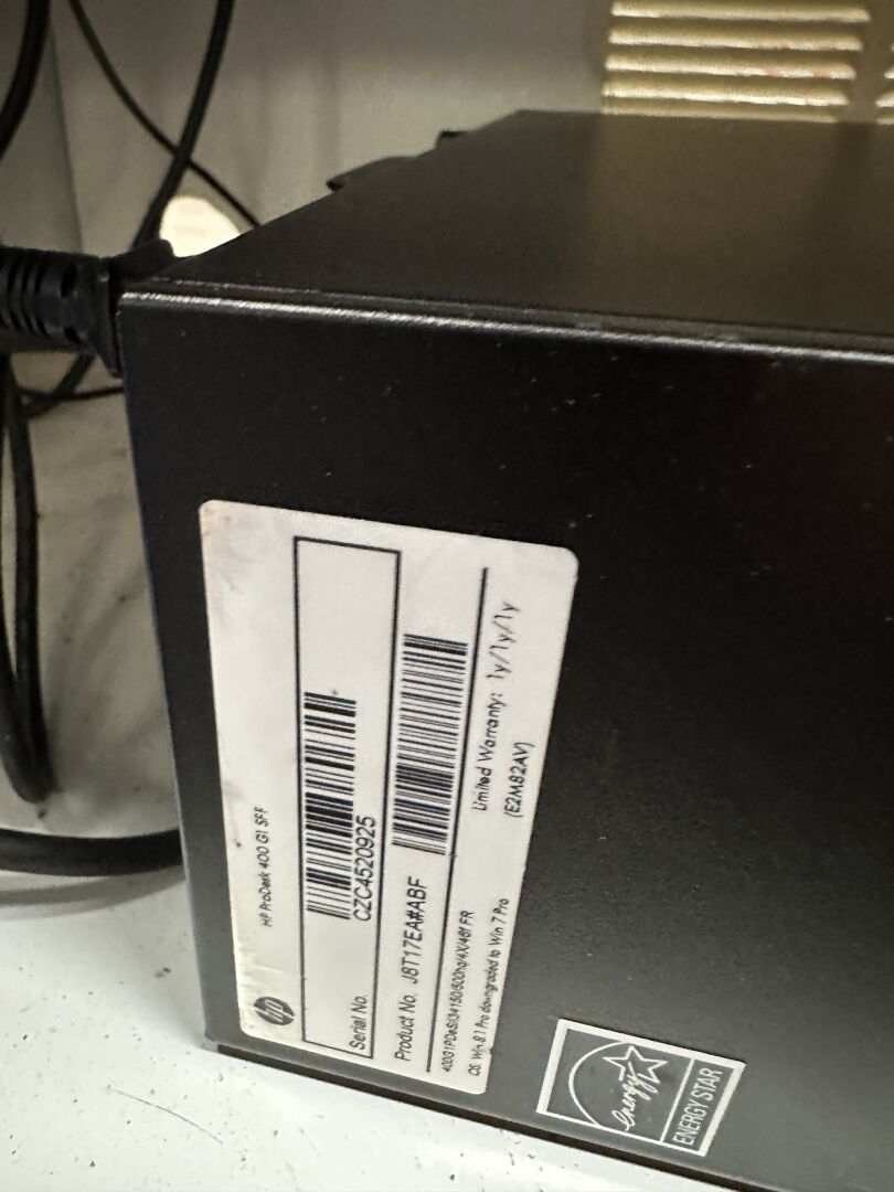 1 pupitre 97 x 46 x 151 cm métal bleu et gris 2 portes basses avec configuration informatique : UC H P PRODESK G1 SFG , écran, clavier, souris, douchette (frais de mise à disposition 10 € TTC)