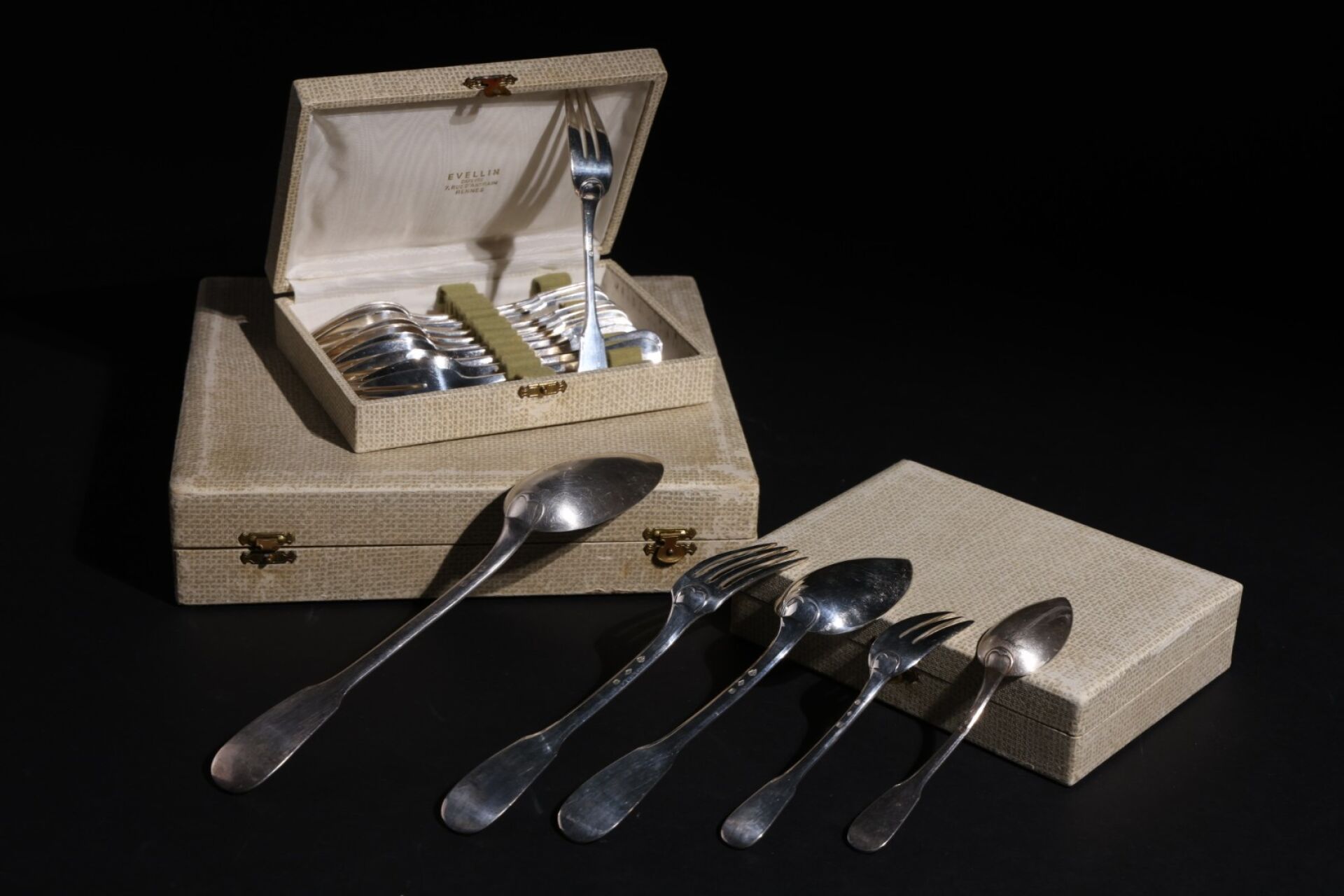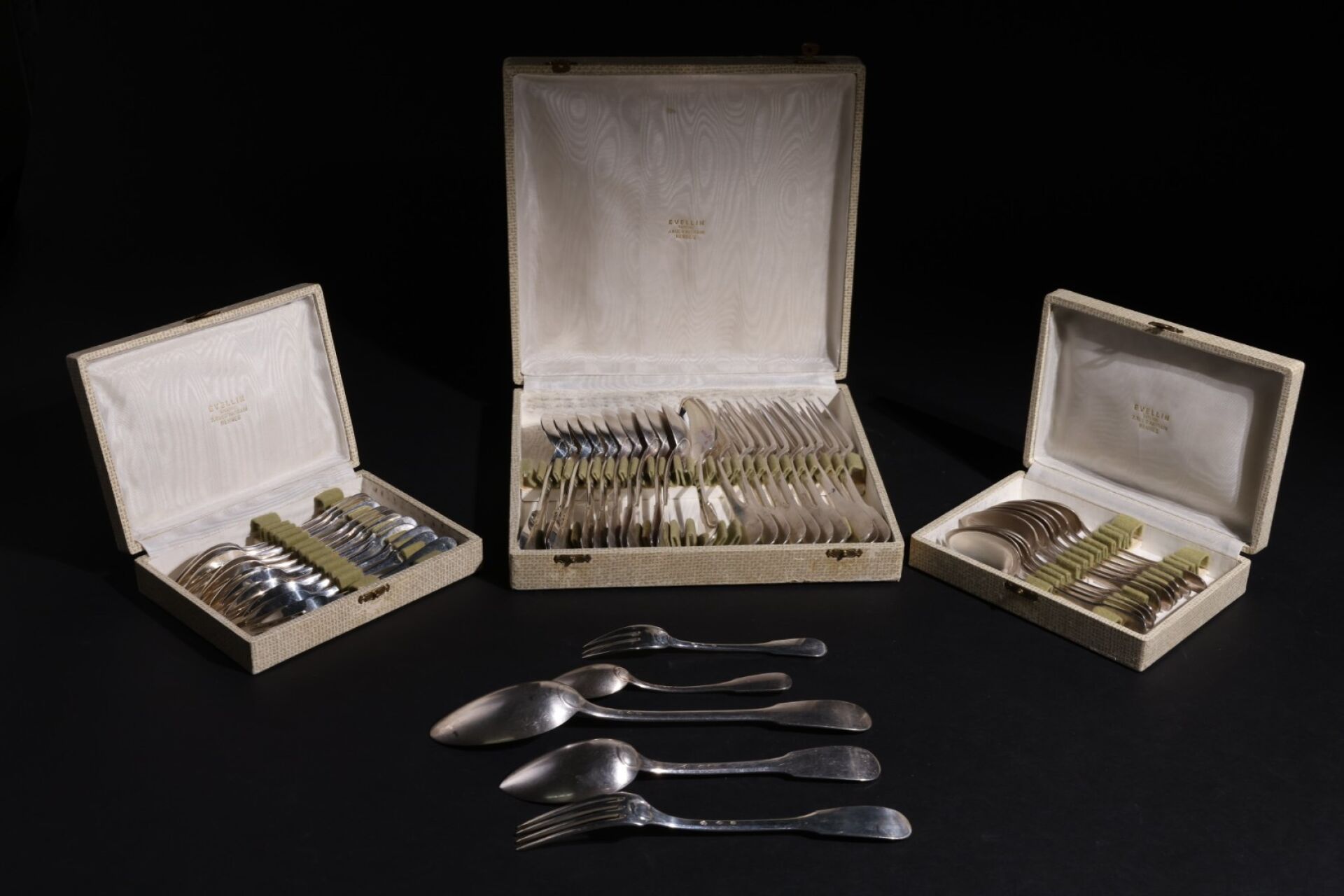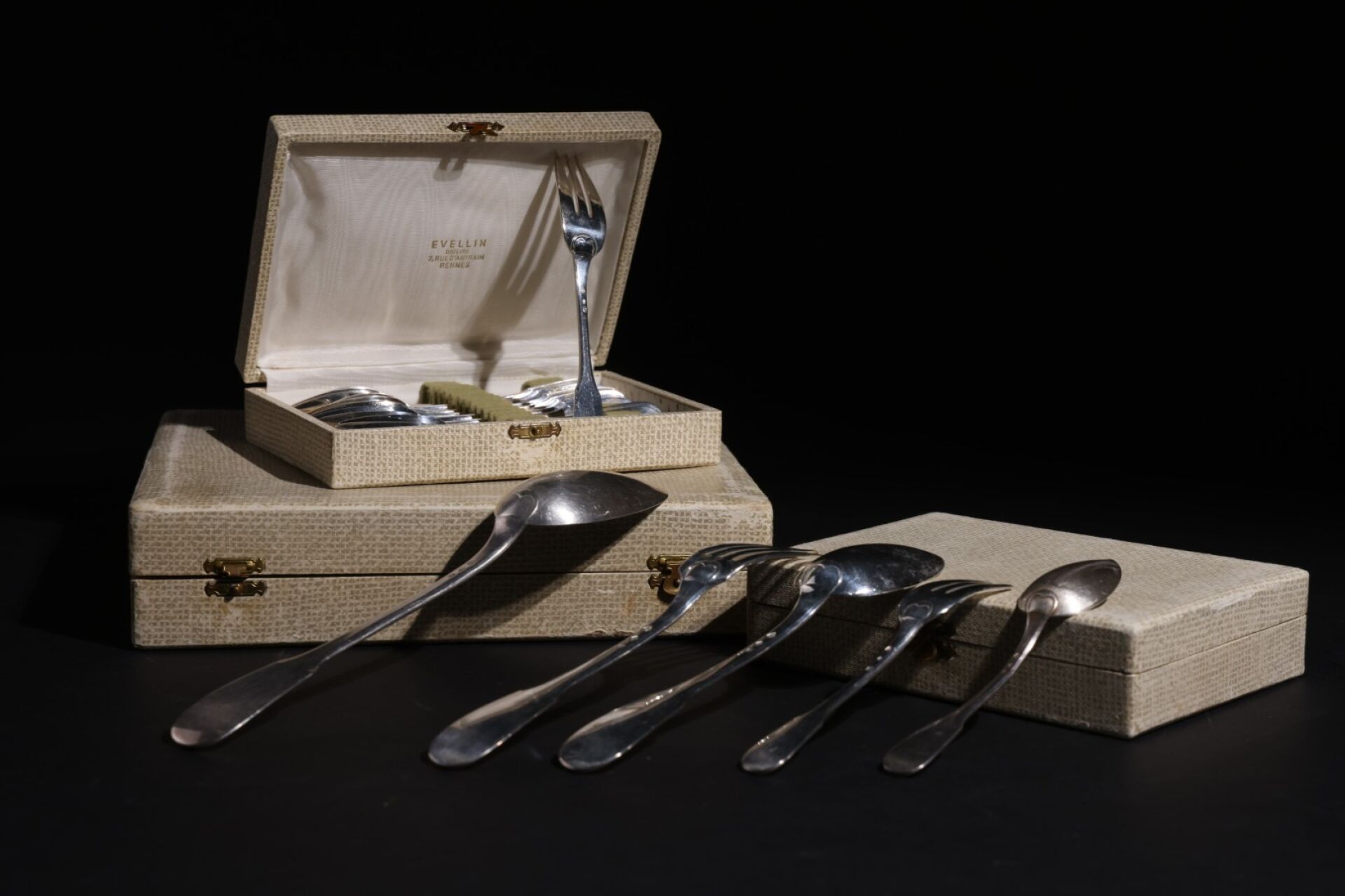 Partie de ménagère en argent modèle uniplat comprenant : - Douze couverts (manque une fourchette) - Onze cuillères à dessert -Douze fourchettes à dessert Poinçon Minerve Orfèvre : HENIN & Cie Poids. : 2 374, 63 g Écrins de la maison EVELIN à Rennes. On joint : cuillère de service en argent uniplat Poinçon Minerve Orfèvre ; Tétard frères Poids. : 116.88 g