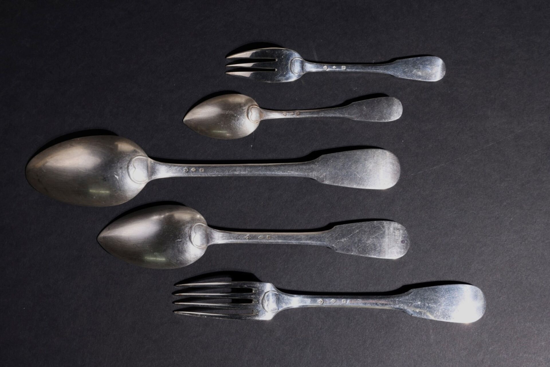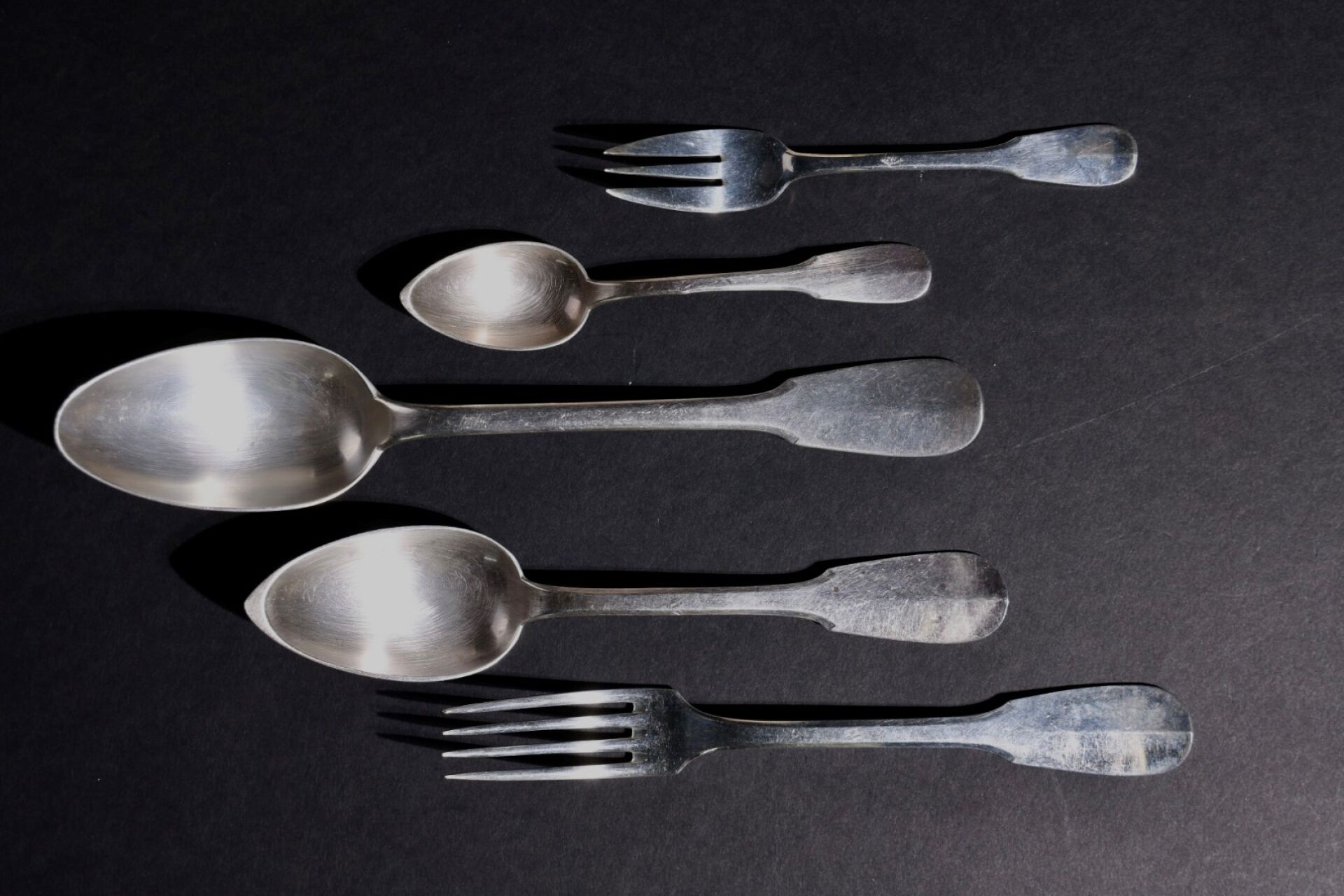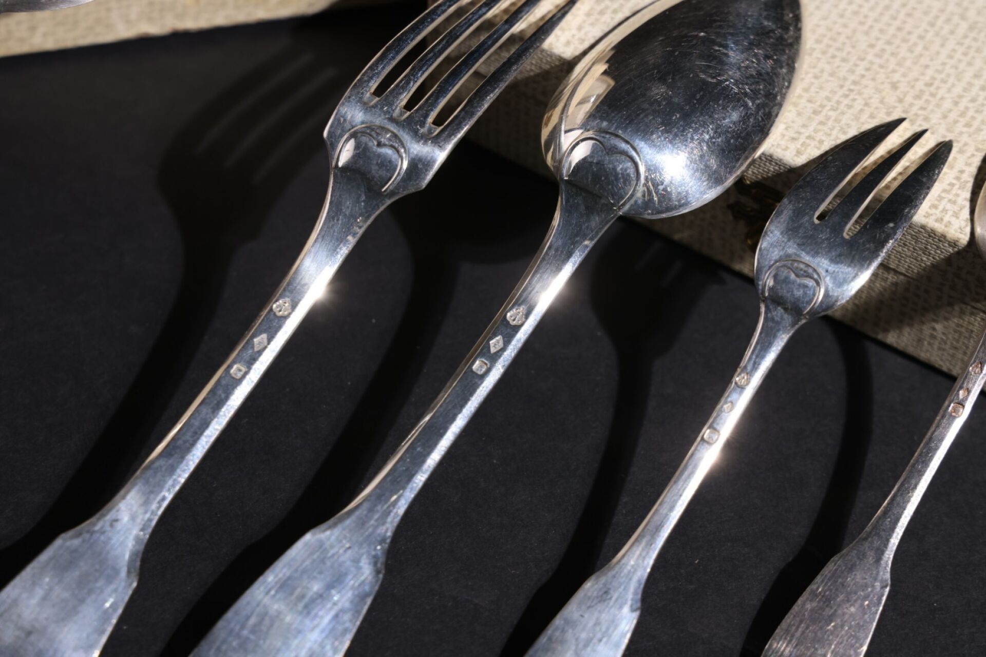 Partie de ménagère en argent modèle uniplat comprenant : - Douze couverts (manque une fourchette) - Onze cuillères à dessert -Douze fourchettes à dessert Poinçon Minerve Orfèvre : HENIN & Cie Poids. : 2 374, 63 g Écrins de la maison EVELIN à Rennes. On joint : cuillère de service en argent uniplat Poinçon Minerve Orfèvre ; Tétard frères Poids. : 116.88 g