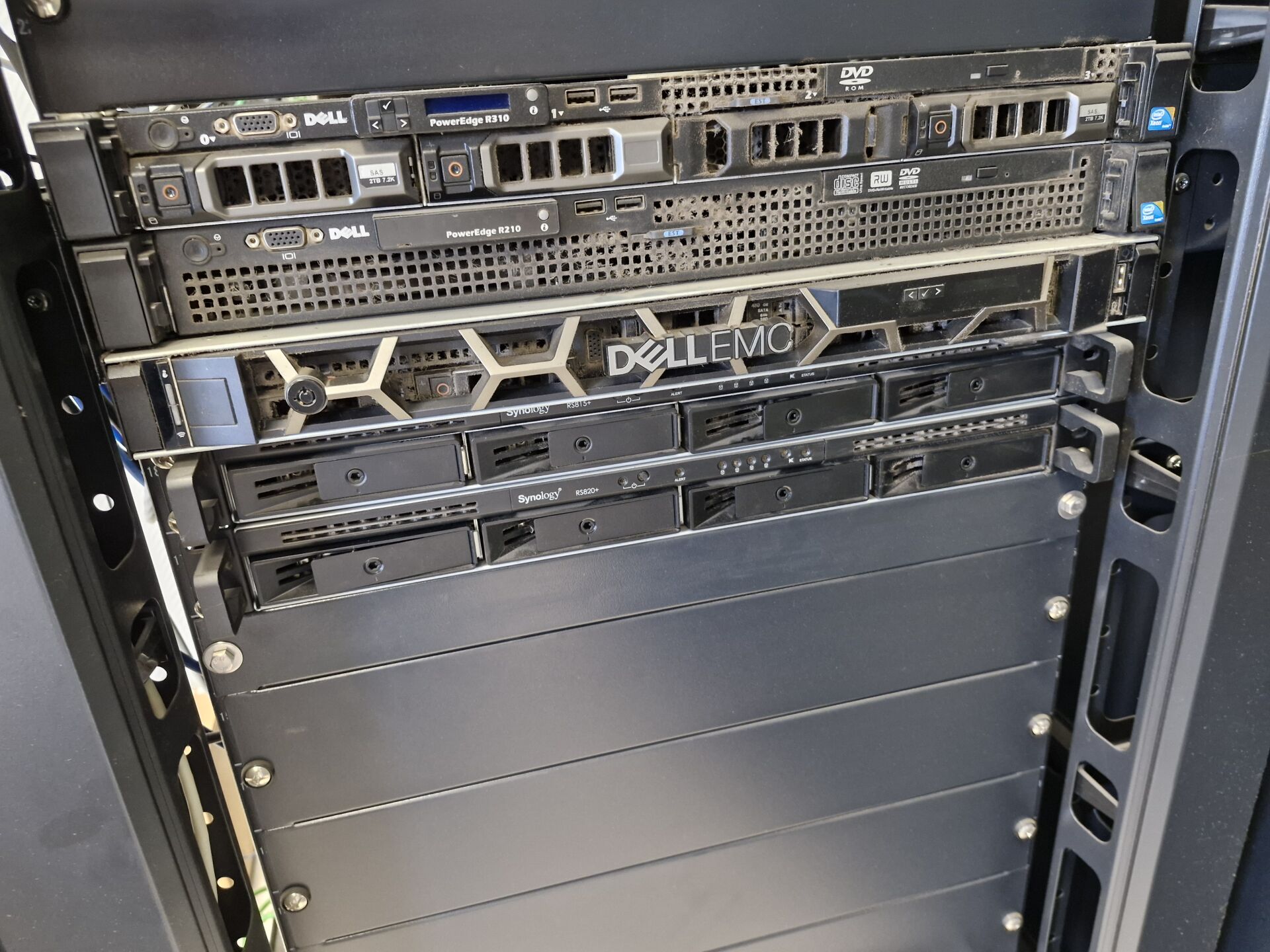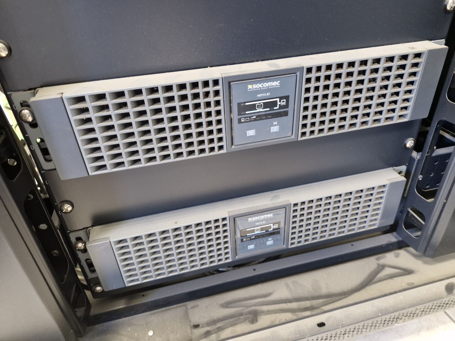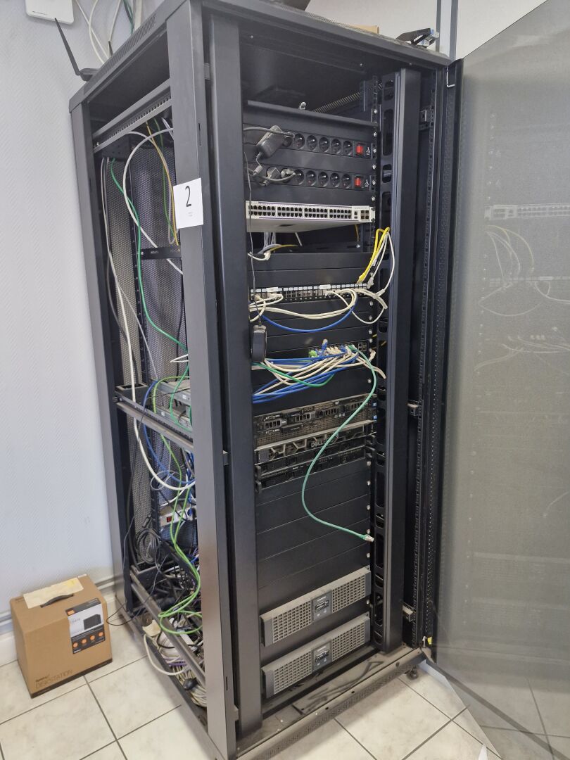 Armoire informatique mobile PLATINE RESEAUK, 1 porte vitrée contenant : - routeur CISCO SG-200-26P - serveur DELL POWEREDGE R210 - serveur DELL POWEREDGE R310 avec 2 disques durs 2 To - serveur DELL EMC - NAS SYNOLOGY R815+ - NAS SYNOLOGY R820+ - routeur wifi SYNOLOGY et 2 onduleurs SOCOMEC (batteries hors service à remplacer) à démonter proprement en respectant les normes de sécurité