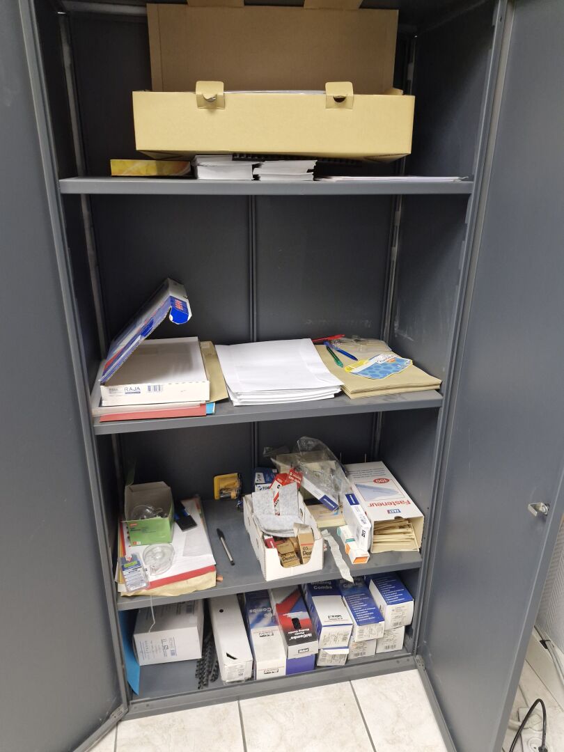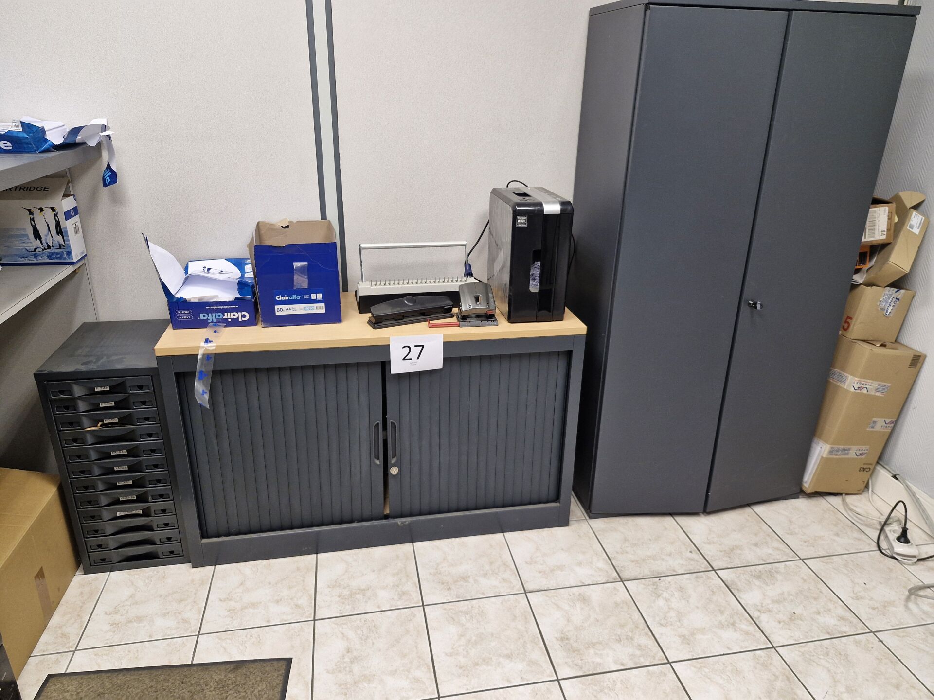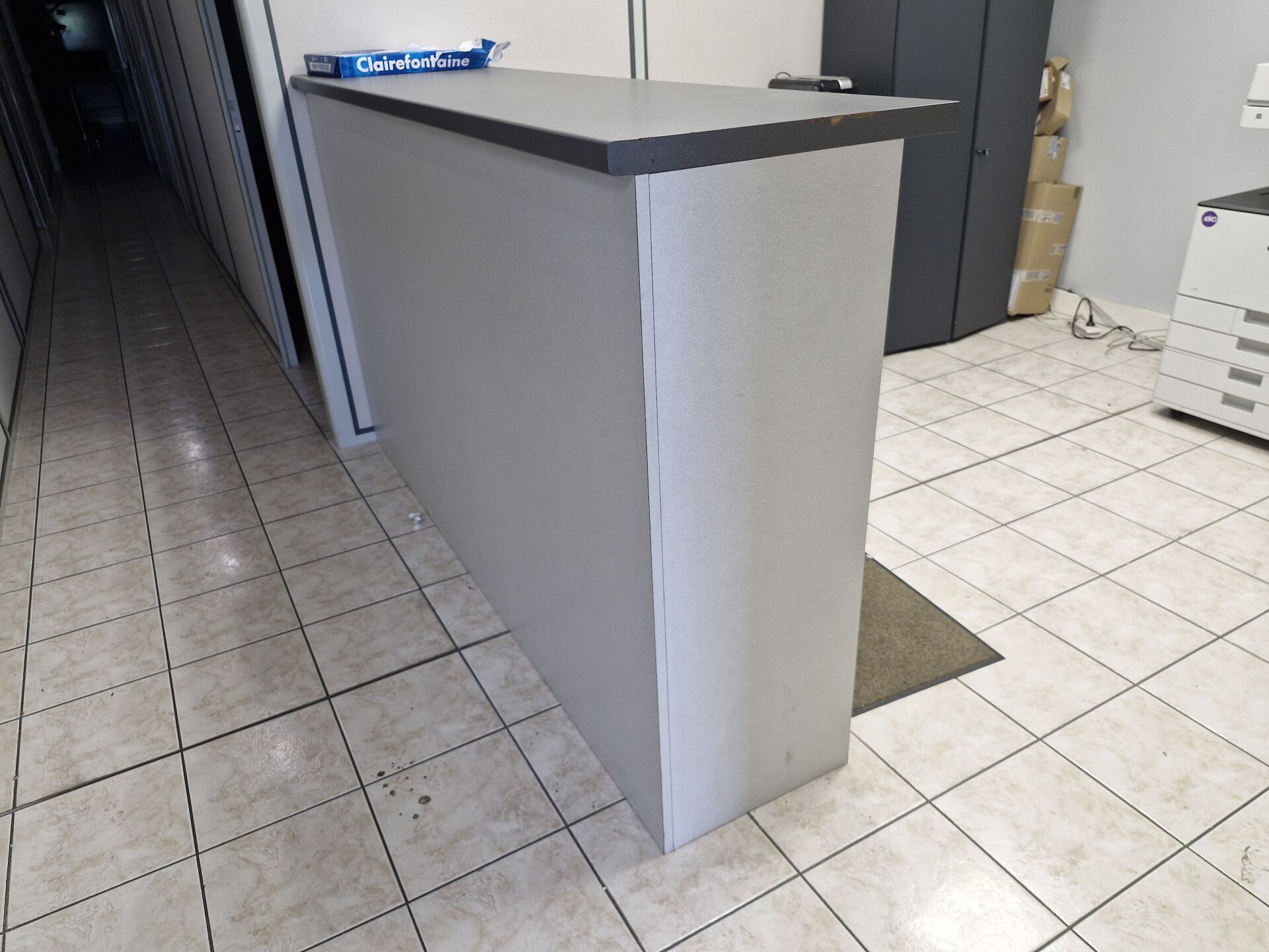 Comptoir d'accueil mélaminé gris 210 x 55 cm Armoire métallique à 2 portes 80 x 40 x 160 cm Meuble bas métallique à rideaux, dessus en mélaminé bois 120 x 44 x 73 cm Classeur plastique 12 à tiroirs Relieuse FELLOWES Destructeur FELLOWES DS-500C Accessoires de bureau et consommables