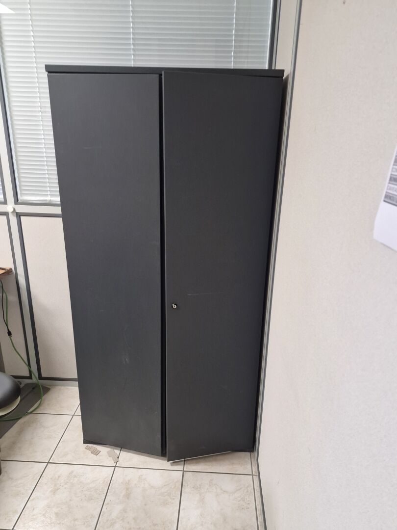 Bureau d'angle en métal et mélaminé bois à retour sur caisson métallique à rideaux 200 x 180 cm Caisson mélaminé bois mobile Armoire métallique à rideaux grise 90 x 44 x180 cm Armoire métallique à 2 portes grises 80 x42 x 160 cm 2 sièges dactylo dont 1 mauvais état