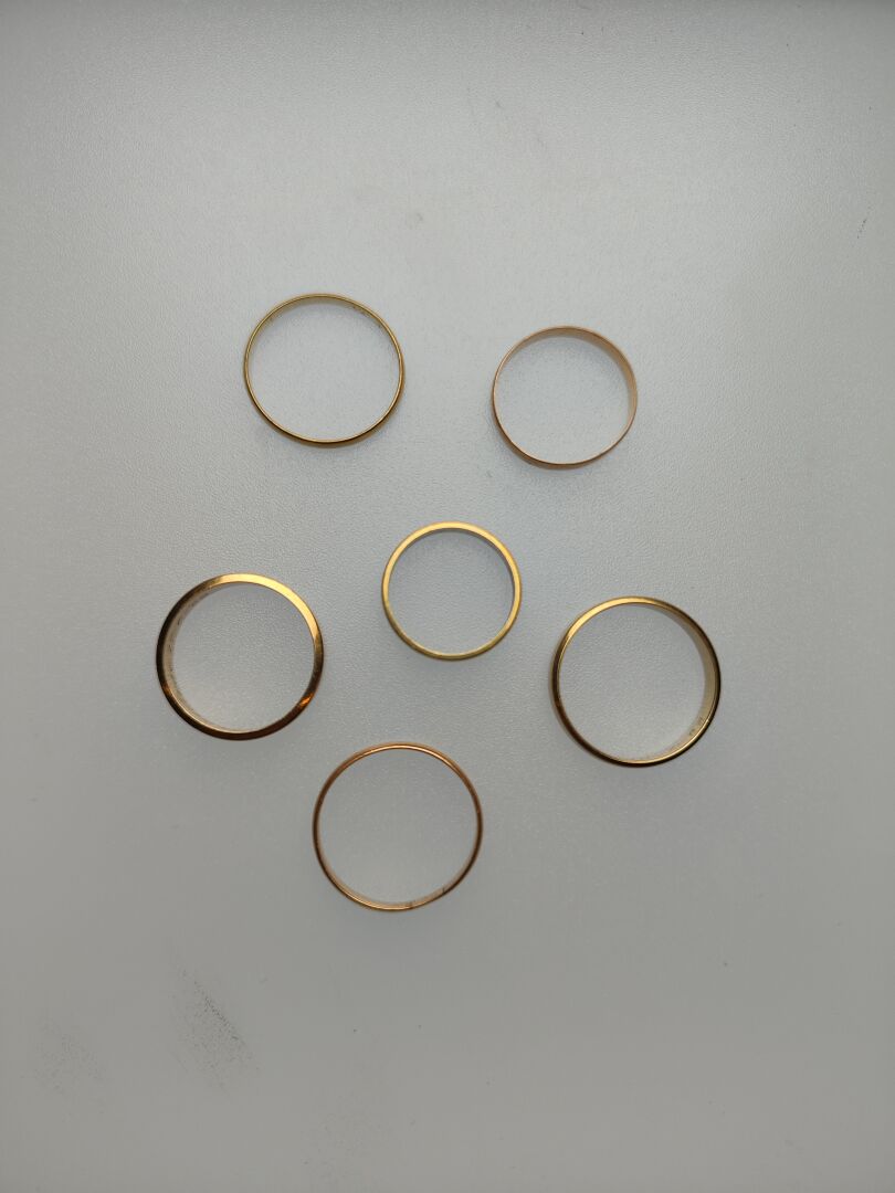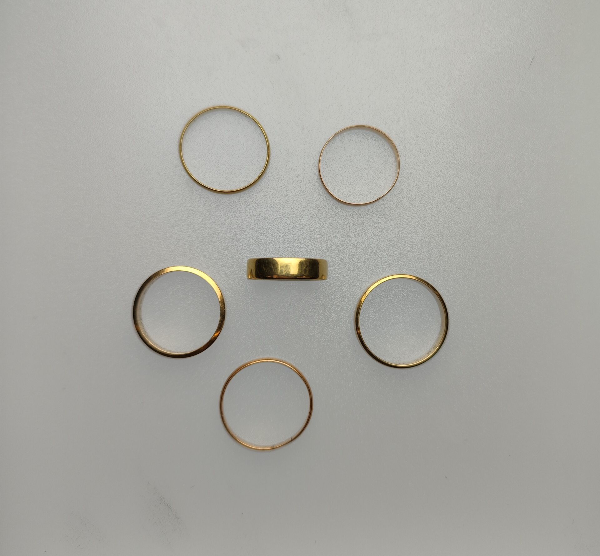 Ensemble composé de six alliances en or jaune 14k (585 millièmes). Poids : 17,72 gr