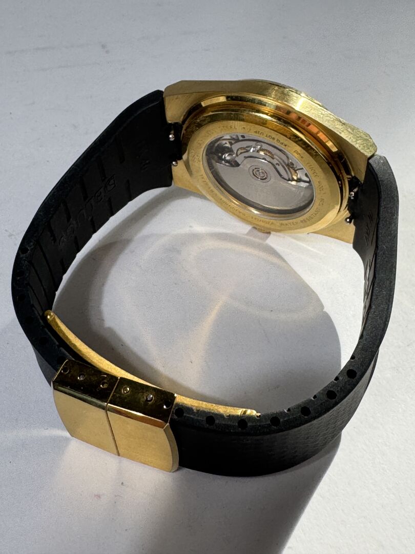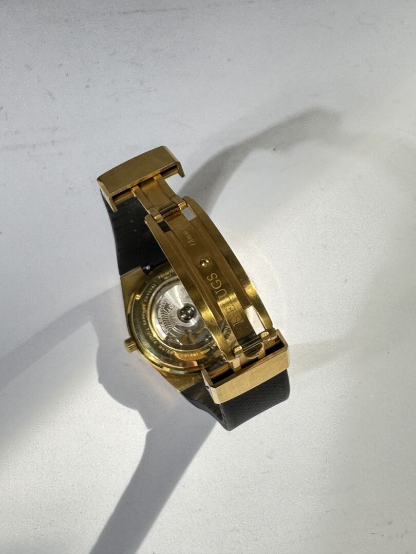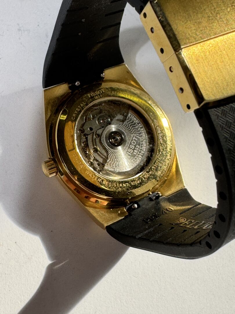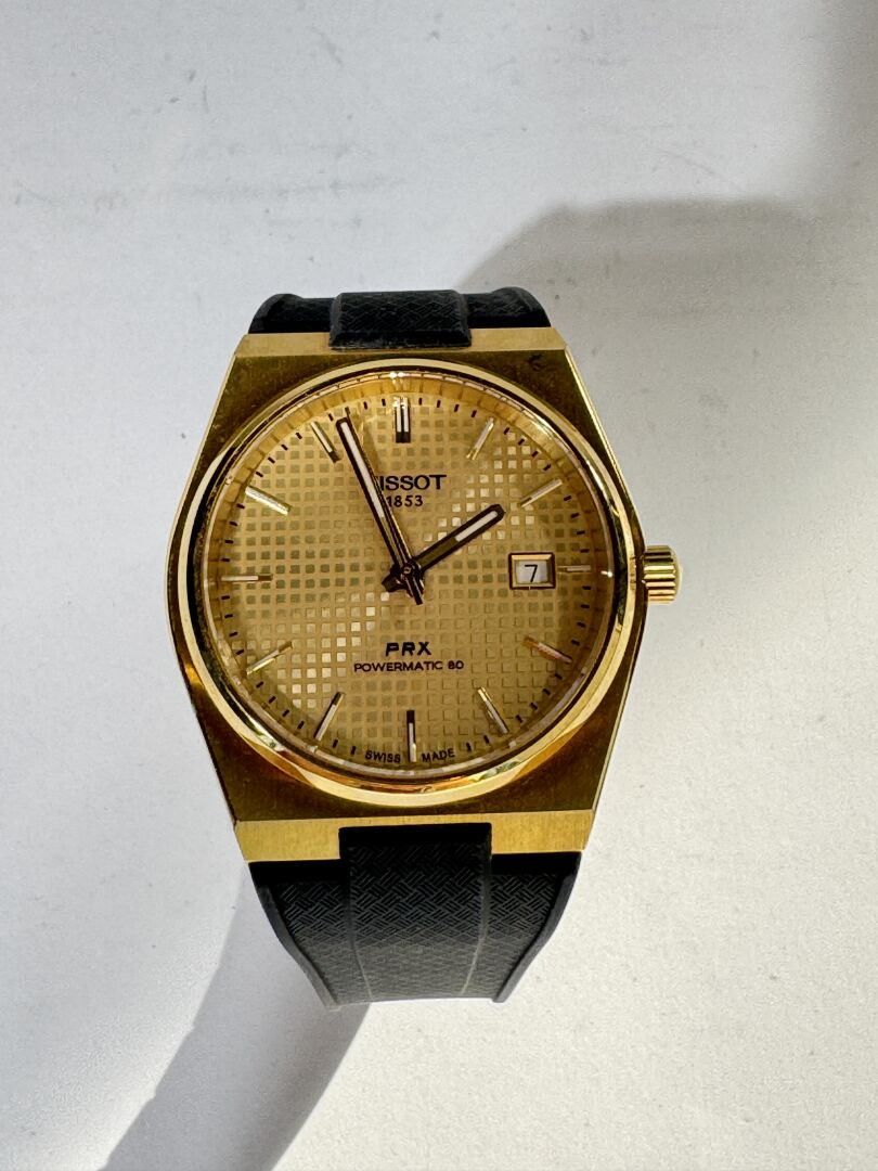 TISSOT PRX Powermatic 80 35 mm - Montre homme, cadran circulaire en acier doré avec revêtement PVD, fond doré guilloché et fond de boite transparent, index bâtons, mouvement automatique, date à 3h, bracelet caoutchouc noir, boucle déployante. Diam. : 35 mm (très légères rayures) Montre fonctionnant lors de l'expertise. Révision conseillée. Conditions de vente spécifiques : Veuillez noter que toutes les montres sont vendues en l'état. Aucune garantie n'est faite sur l'état de marche, une révision est donc conseillée. Certaines montres ont été ouvertes pour identifier le type et la qualité du mouvement, y compris les montres résistantes à l'eau, il est donc conseillé à l'acheteur de consulter un horloger pour revoir l'étanchéité de la montre.