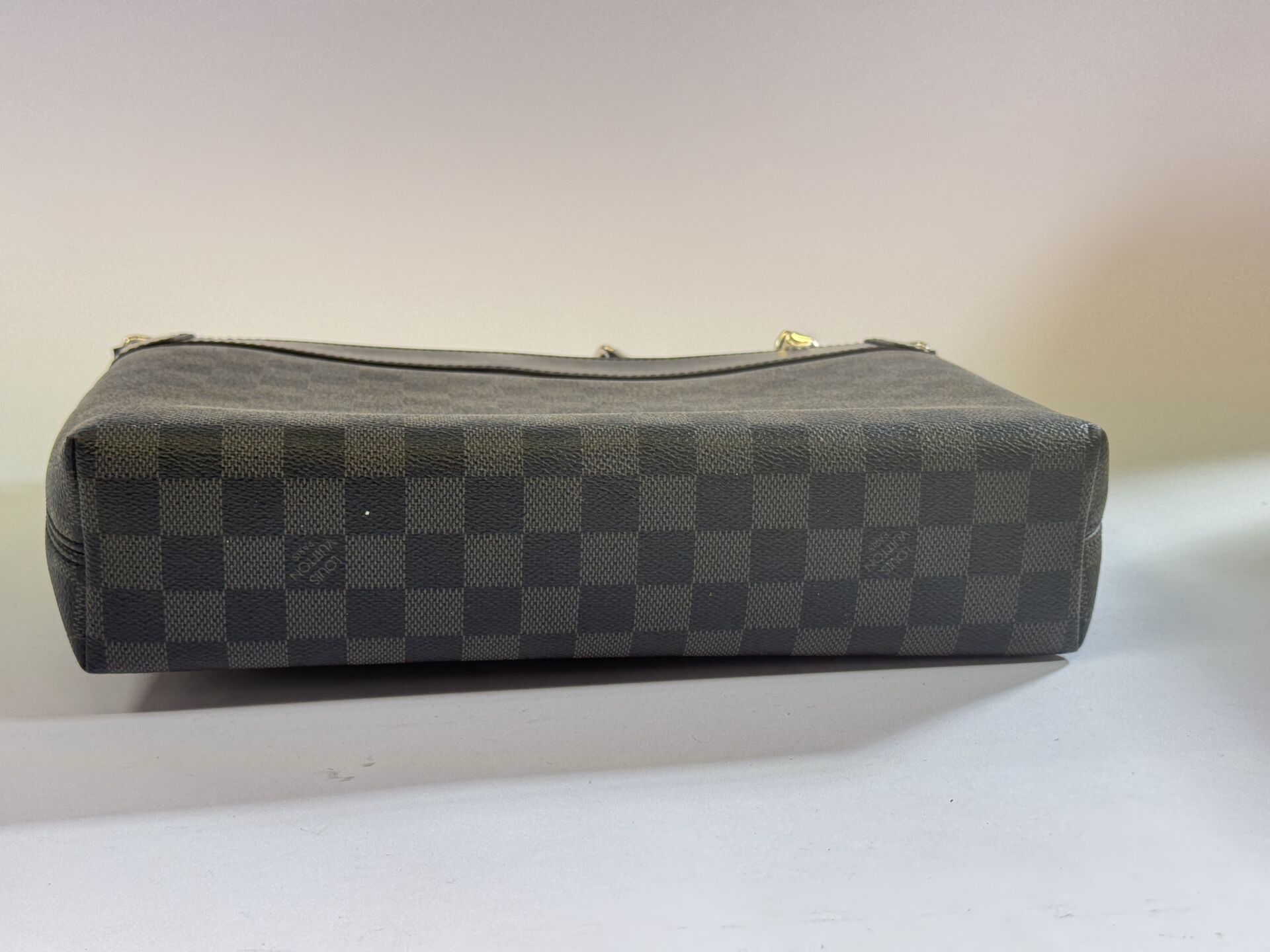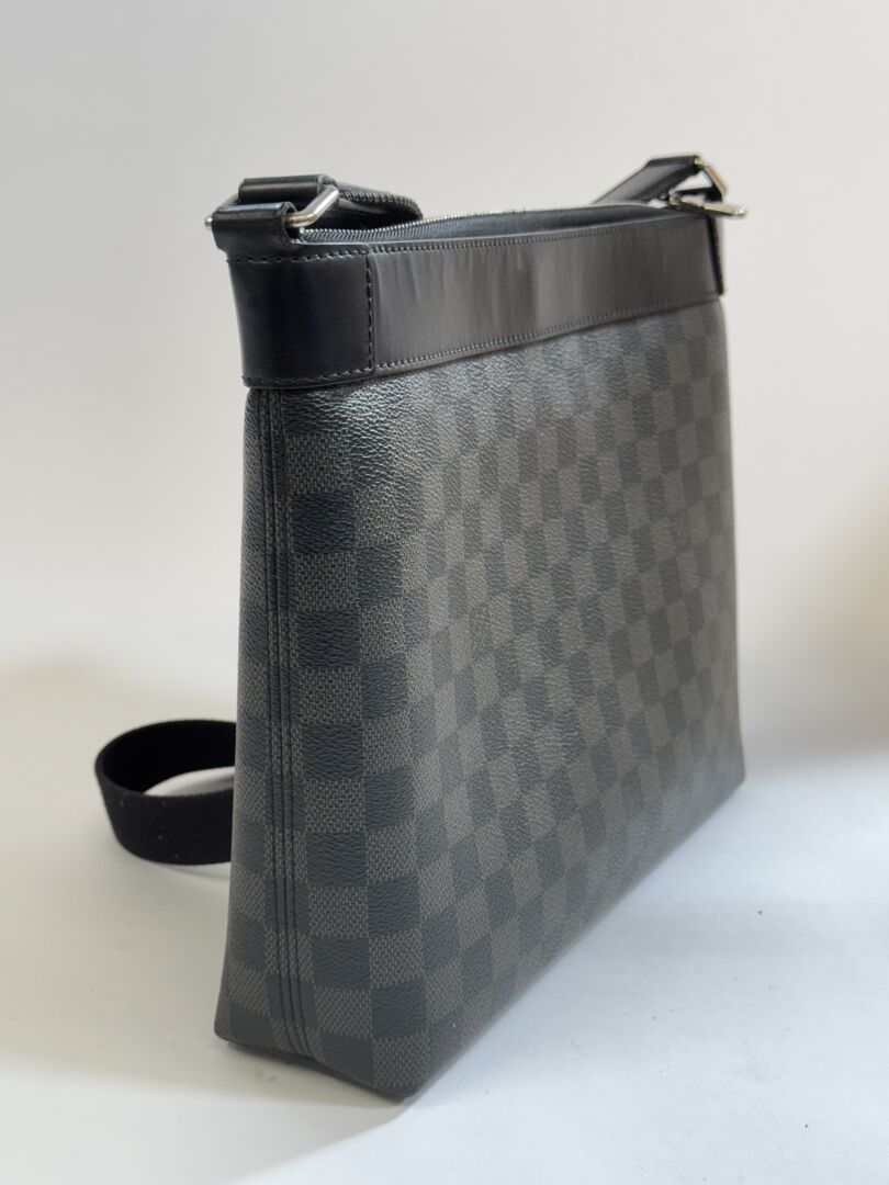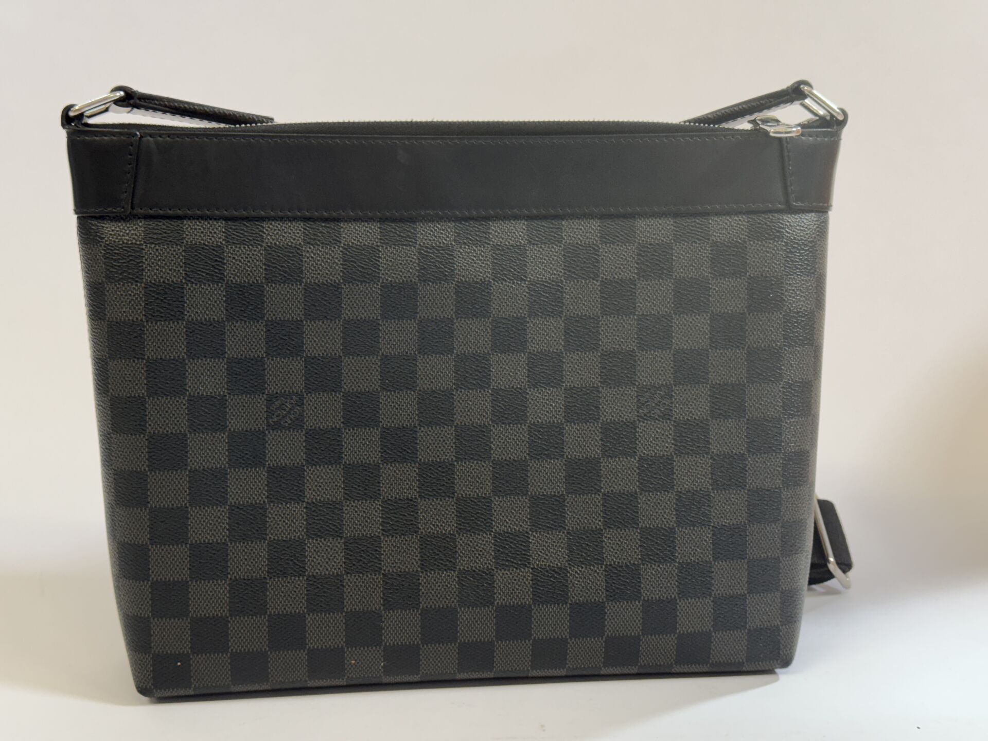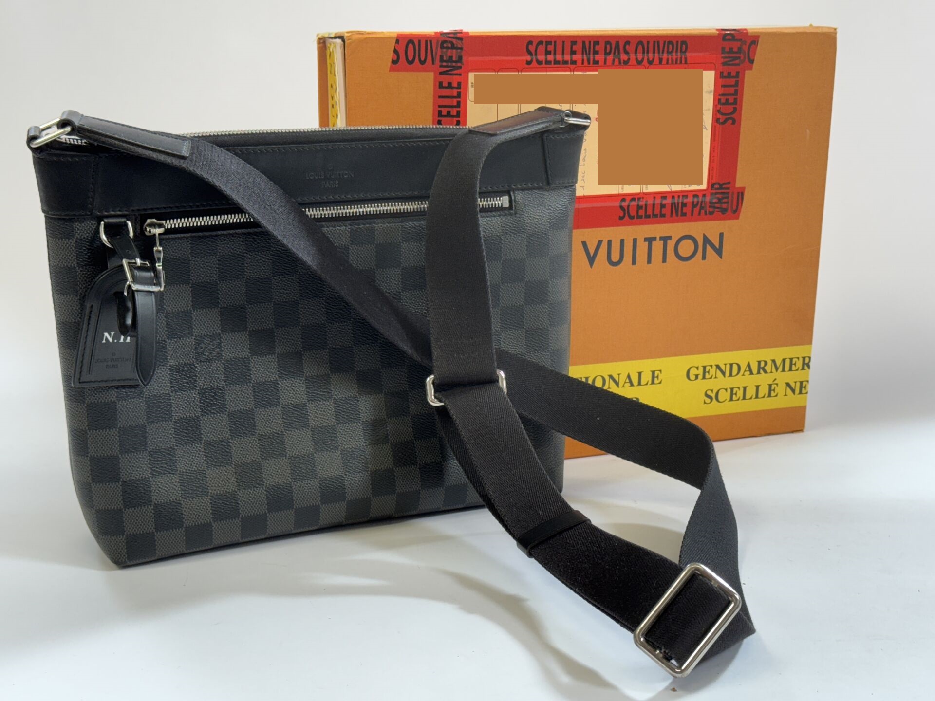 LOUIS VUITTON - Sac modèle "Mick", toile enduite damier graphite et cuir noir, fermeture zip, poche extérieure zippée, large anse bandoulière sangle noire, porte nom monogrammée "NH" en cuir noir. Dans sa boite. Long. : 29 cm (très bon état, boite abimée)