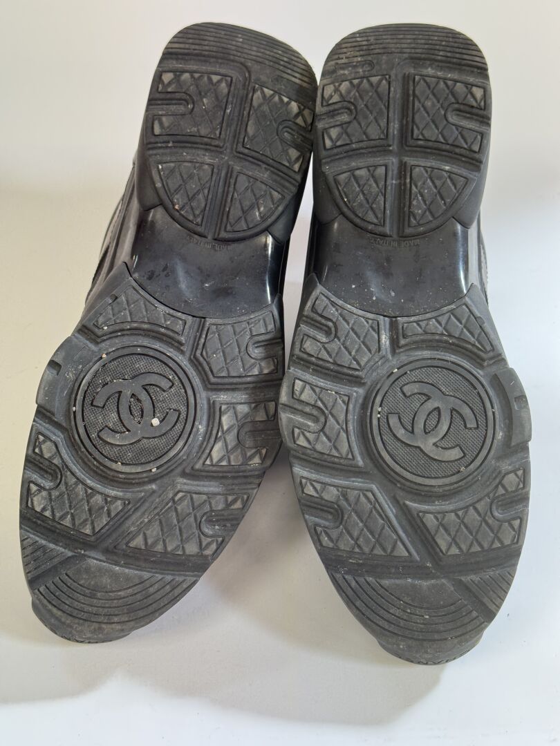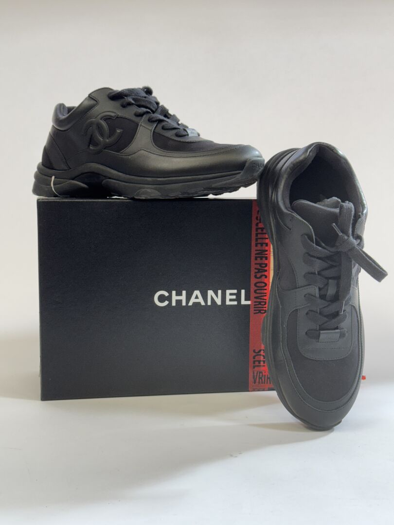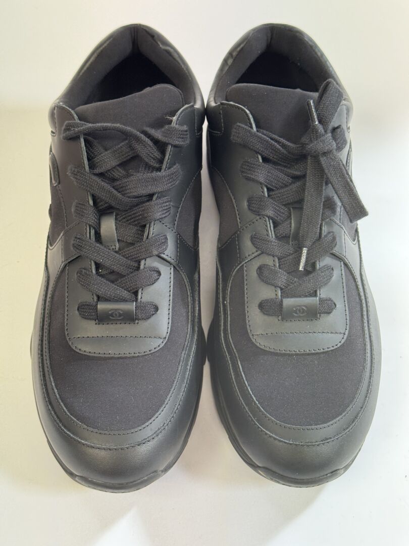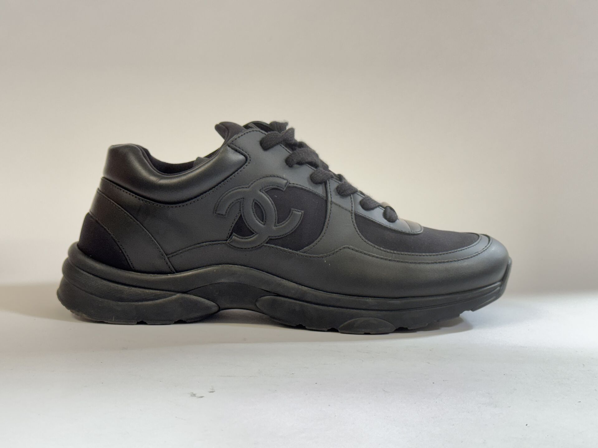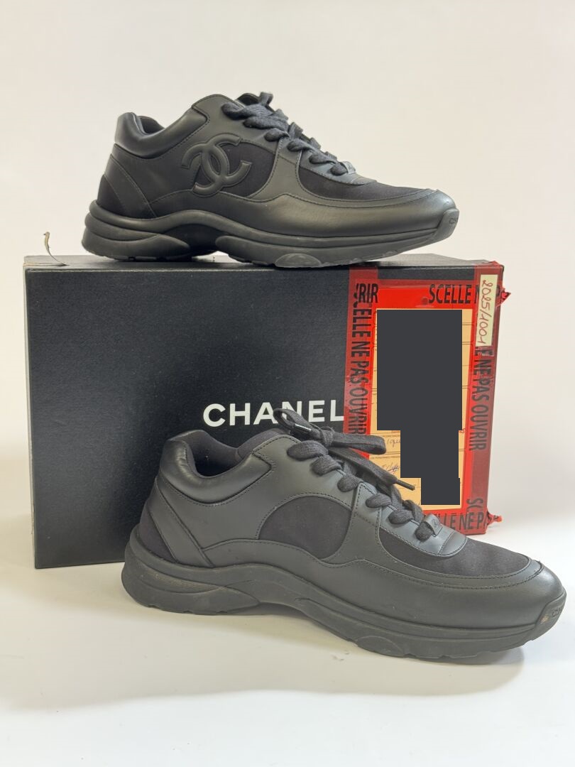CHANEL - Paire de baskets en toile et cuir noir, monogramme CC. Dans leur boite. Réf : W U03846 Pointure 46 (bon état général, boite abimée)