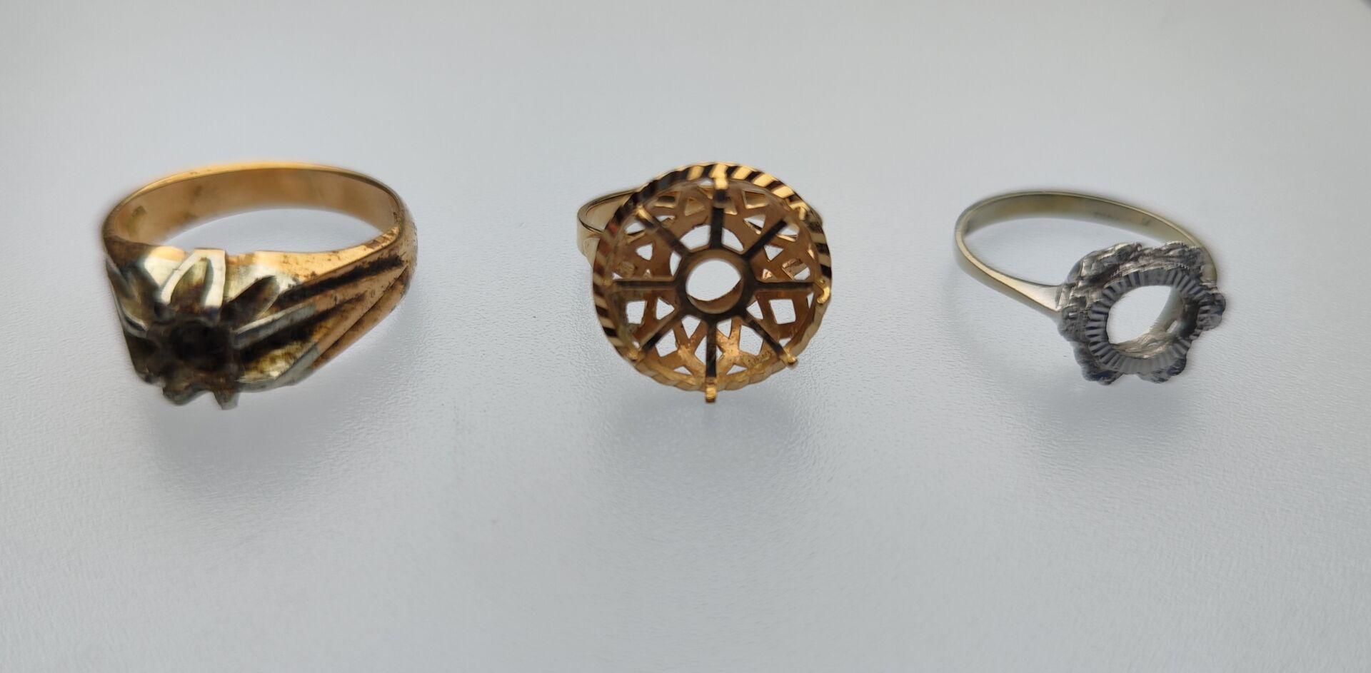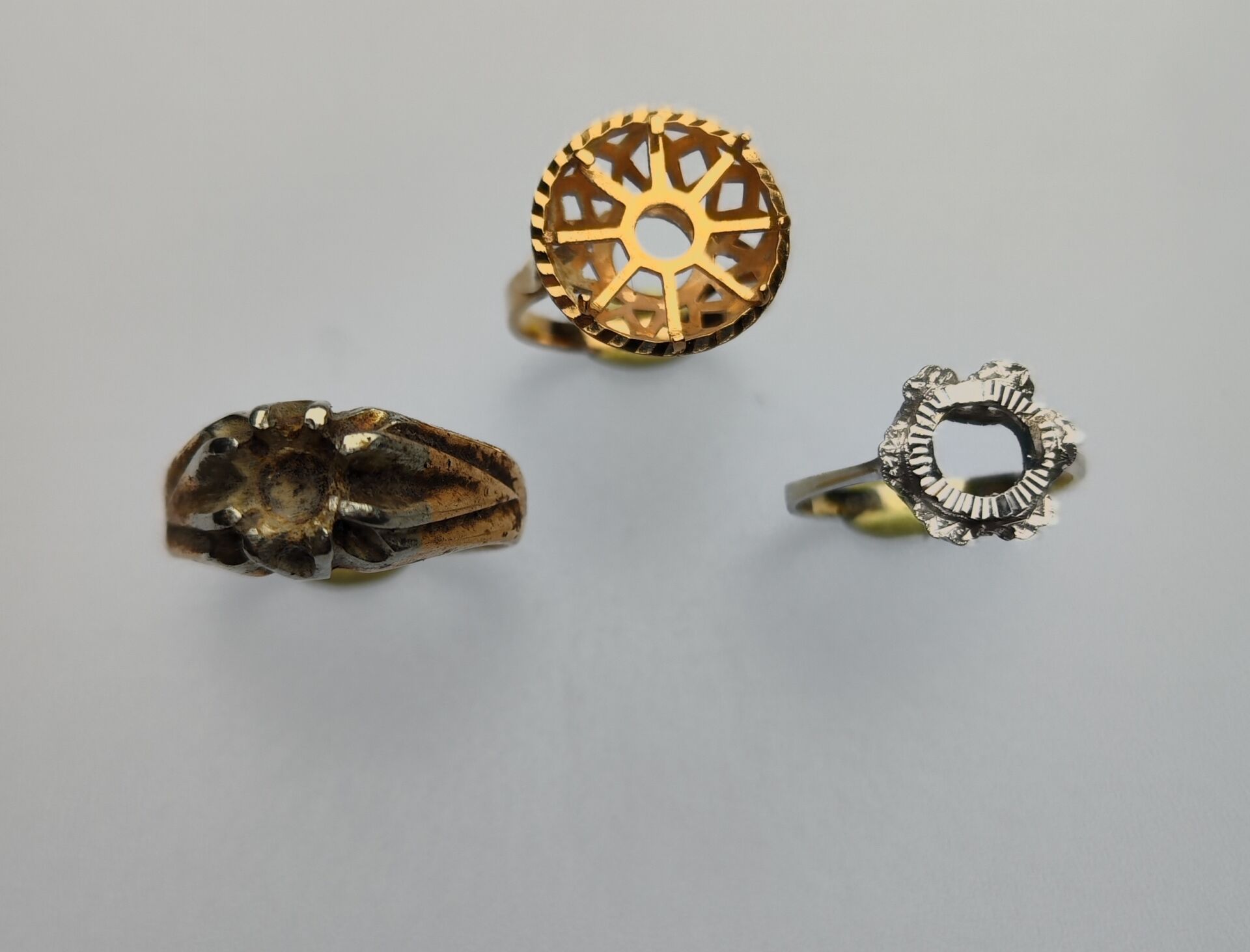 Ensemble composé de trois montures de bague en or jaune et or gris 18k (750 millièmes). Poids : 16,61 gr