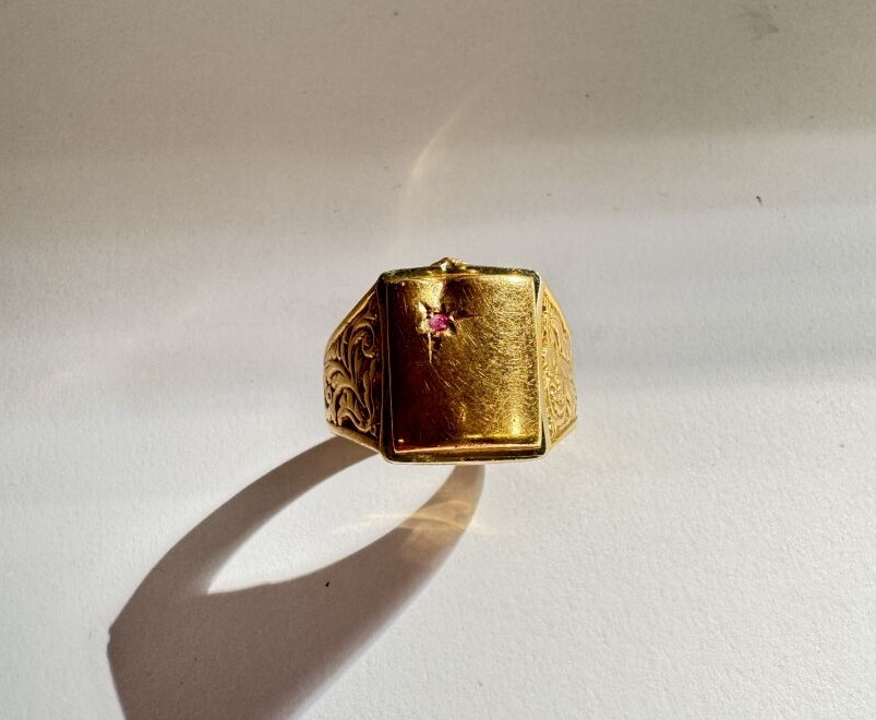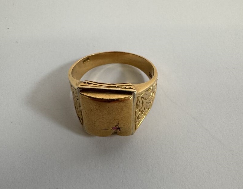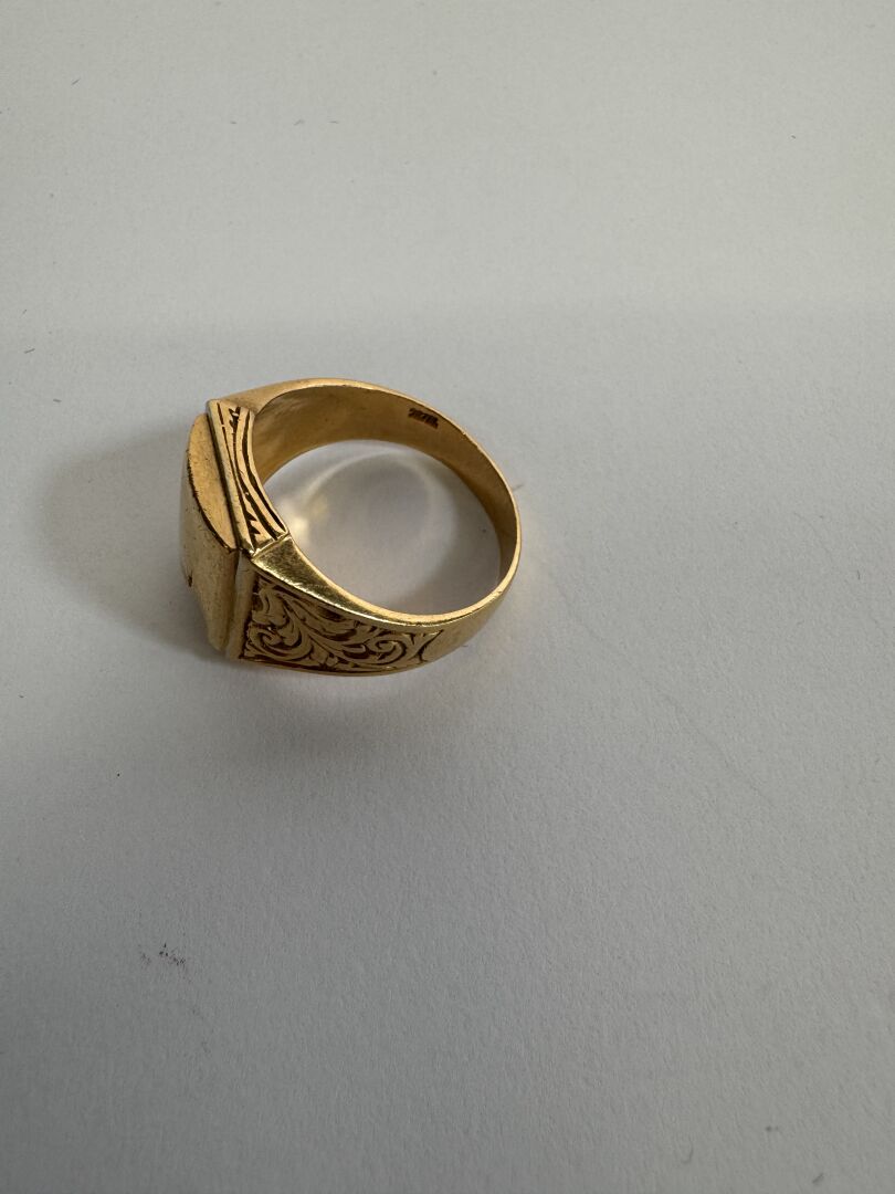 Bague chevalière en or jaune 18k (750 millièmes), plateau bombé incrusté d'une pierre rose (accidentée), décor ciselé sur les côtés. Poids brut : 9,59 gr - Tour de doigt 65