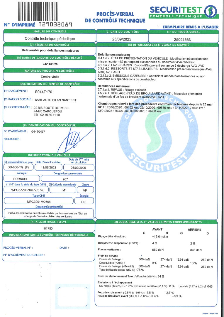 BVA- VITRES ET RETROS ELECT- REGULATEUR DE VITESSES- CLIM- RADIO- SIEGES AV ELECT- CONDUCTEUR AVEC 3 MEM- RADAR DE RECUL. SIEGES EN CUIR USES- PLASTIQUES RAYES ET TACHES- PAS D4AFFICHAGE SUR L'ECRAN CENTRAL. RAYURES D'USAGE- LEGER ENFONCEMENT SUR L'AILE ARG- FROTTEMENTS SUR LE COTE DES PORTES AV- JANTE AVG ET ARG RAYEES. DEFAILLANCES MAJEURES: MODIFICATION NECESSITANT UNE MISE EN CONFORMITE PAR RAPPORT AUX DONNEES DU DOCUMENT D'IDENTIFICATION (MODIFICATION DES SUPENSIONS ) - DEFAUT DU LAVE GLACE DES PHARES AVG ET AVD- MODIFICATION DES RESSORTS DE STABILISATEUR AVG, ARD, AVD ET ARG PRESENTANT UN RISQUE- DEFAUT DES EMISSIONS GAZEUSE. DEFAILLANCES MINEURES: RIPAGE EXCESSIF- MAUVAISE ORIENTATION DES FEUX DE BROUILLARD AVG ET AVD.