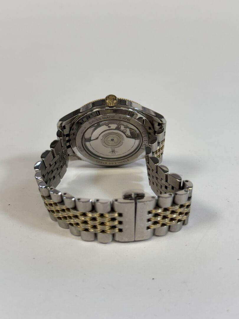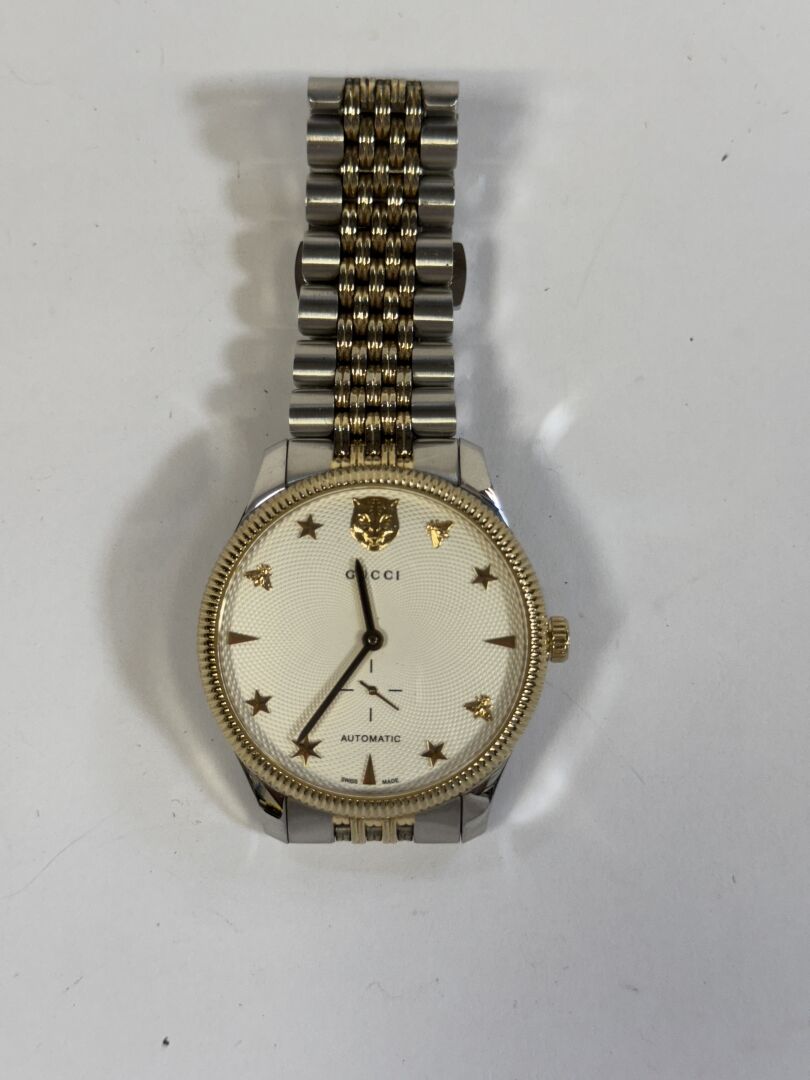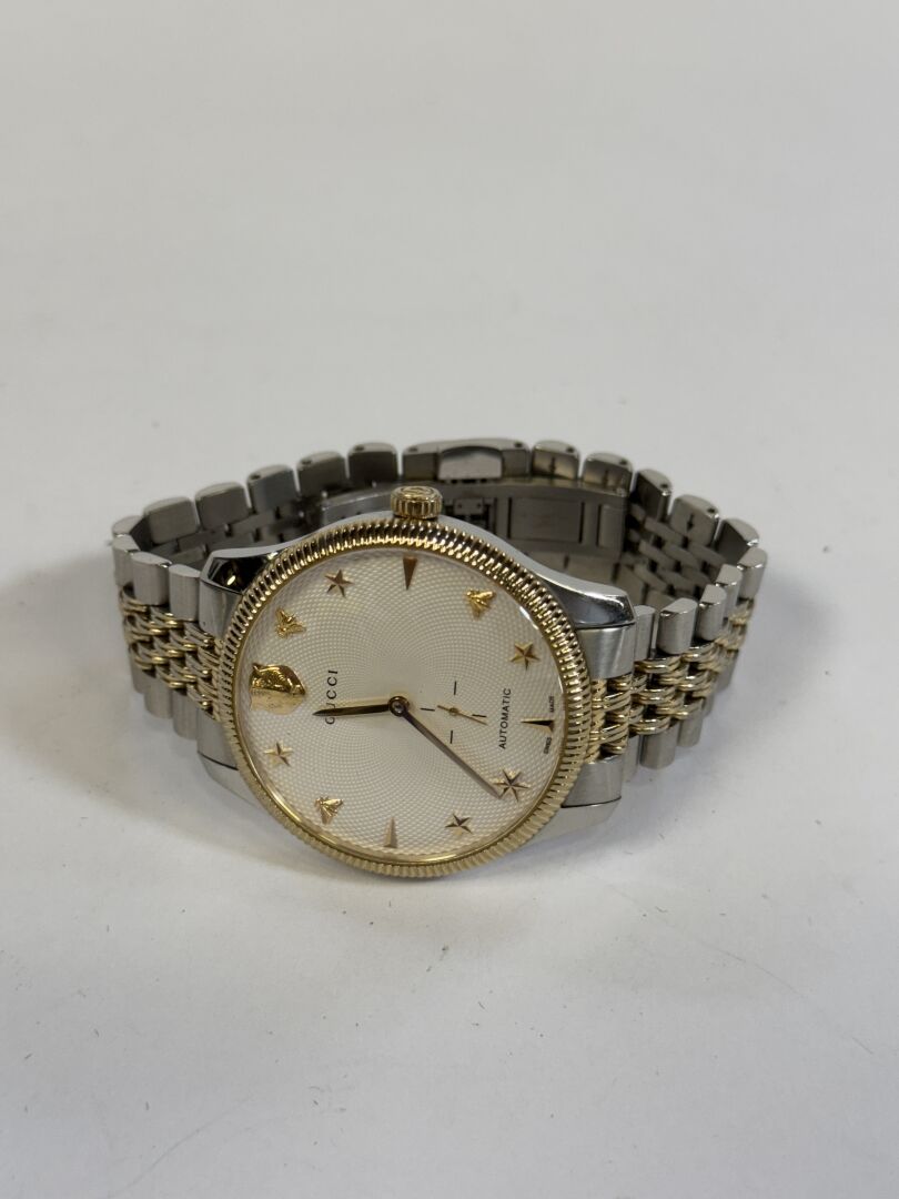GUCCI - Montre modèle "Le Marché des Merveilles", acier et métal doré, boitier rond, cadran guilloché champagne, index abeille, étoile et tête de félin, boucle déployante, mouvement automatique. Diam. : 3.9 cm Conditions de vente spécifiques : Veuillez noter que toutes les montres sont vendues en l'état. Aucune garantie n'est faite sur l'état de marche, une révision est donc conseillée. Certaines montres ont été ouvertes pour identifier le type et la qualité du mouvement, y compris les montres résistantes à l'eau, il est donc conseillé à l'acheteur de consulter un horloger pour revoir l'étanchéité de la montre.
