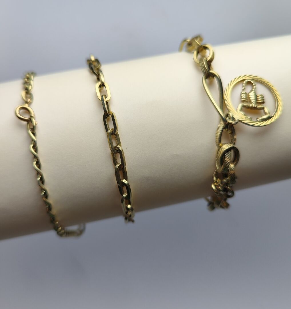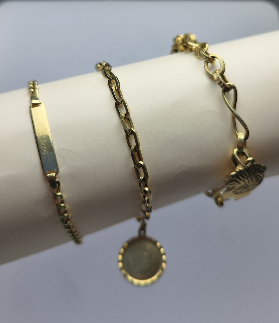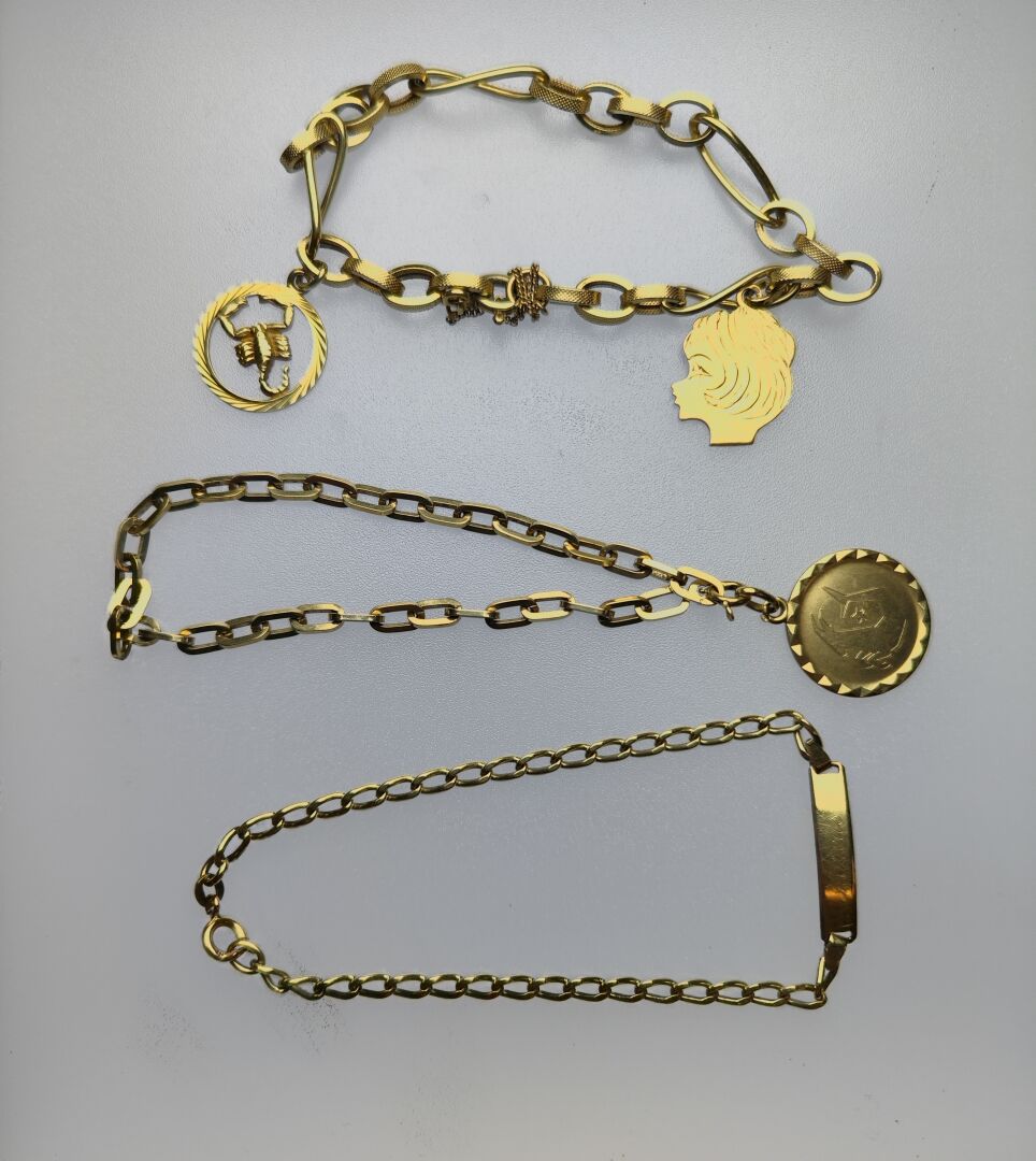 Ensemble composé de trois gourmettes en or jaune 14k (585 millièmes), une maille cheval gravée "Marcus", une maille forçat retenant une médaille ornée d'un bélier et une maille jaseron retenant un motif scorpion et un profil de jeune fille gravé "Ann". Poids : 28,46 gr - Long. : 19 à 21 cm