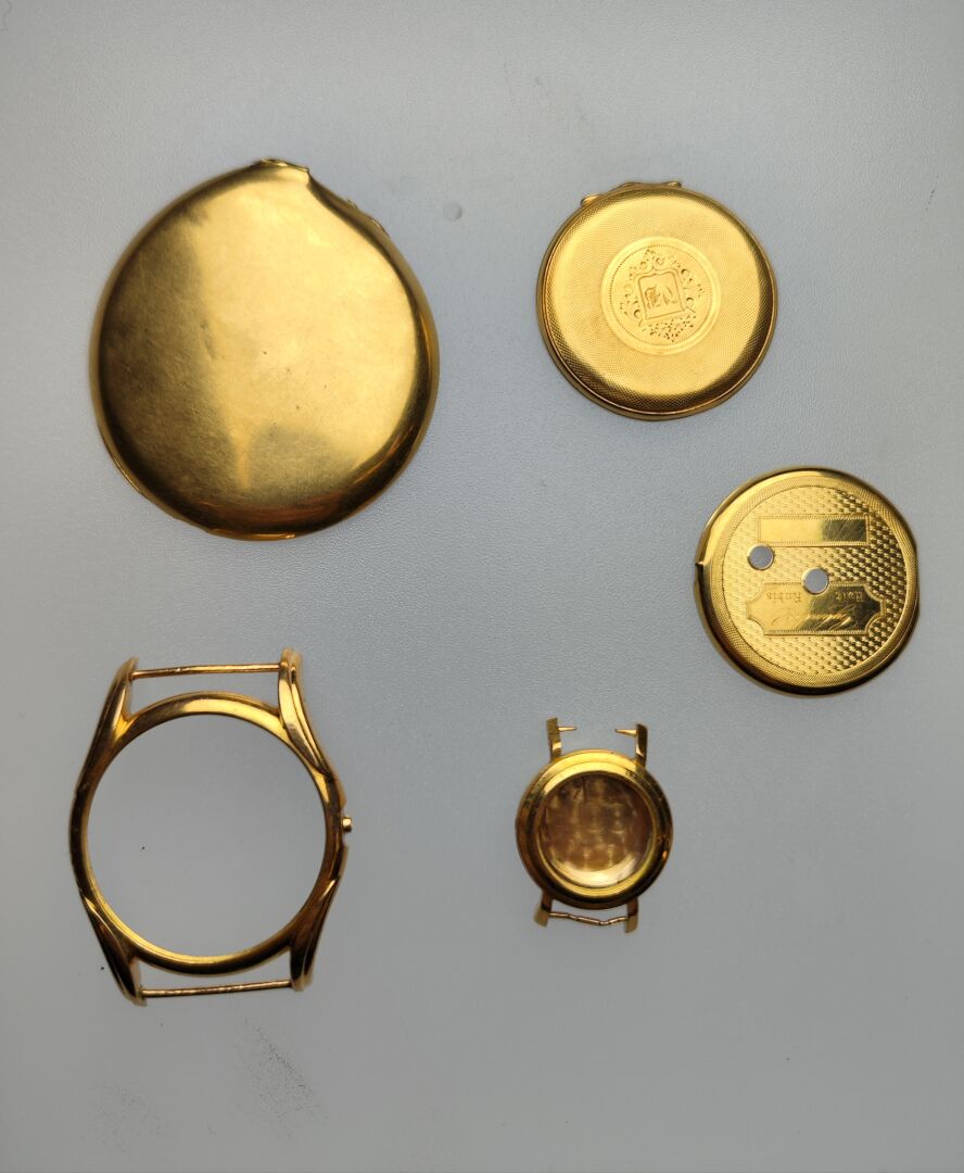 Ensemble de cinq boitiers de montres en or jaune 18k (750 millièmes). Poids : 22,80 gr
