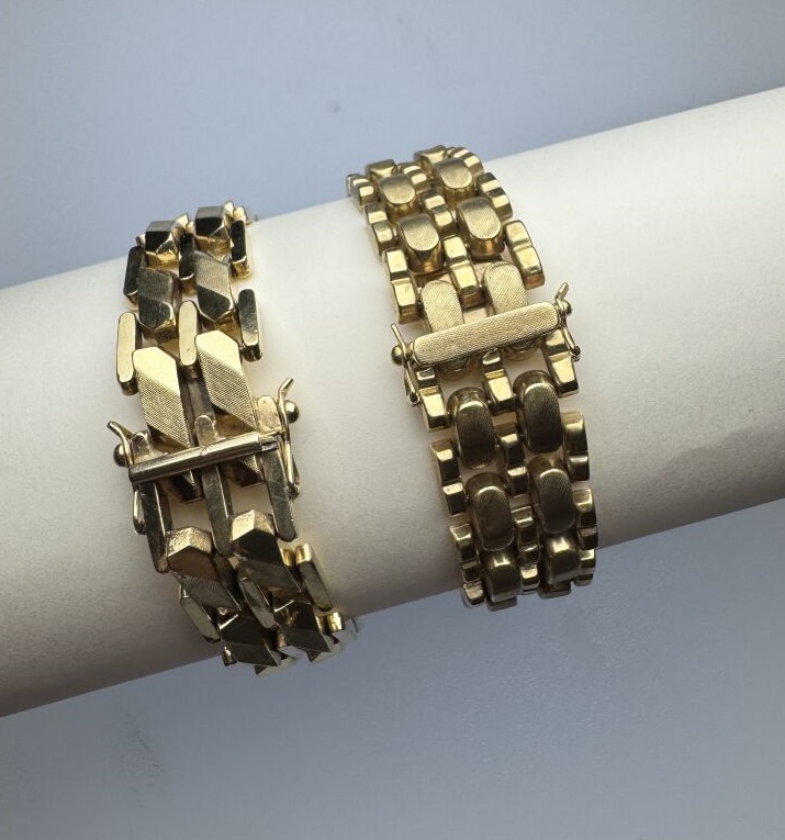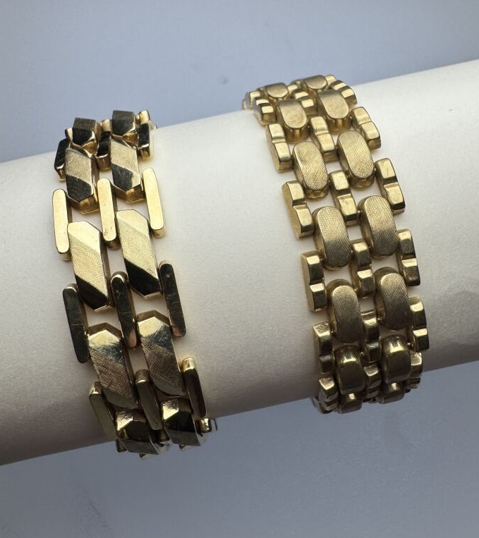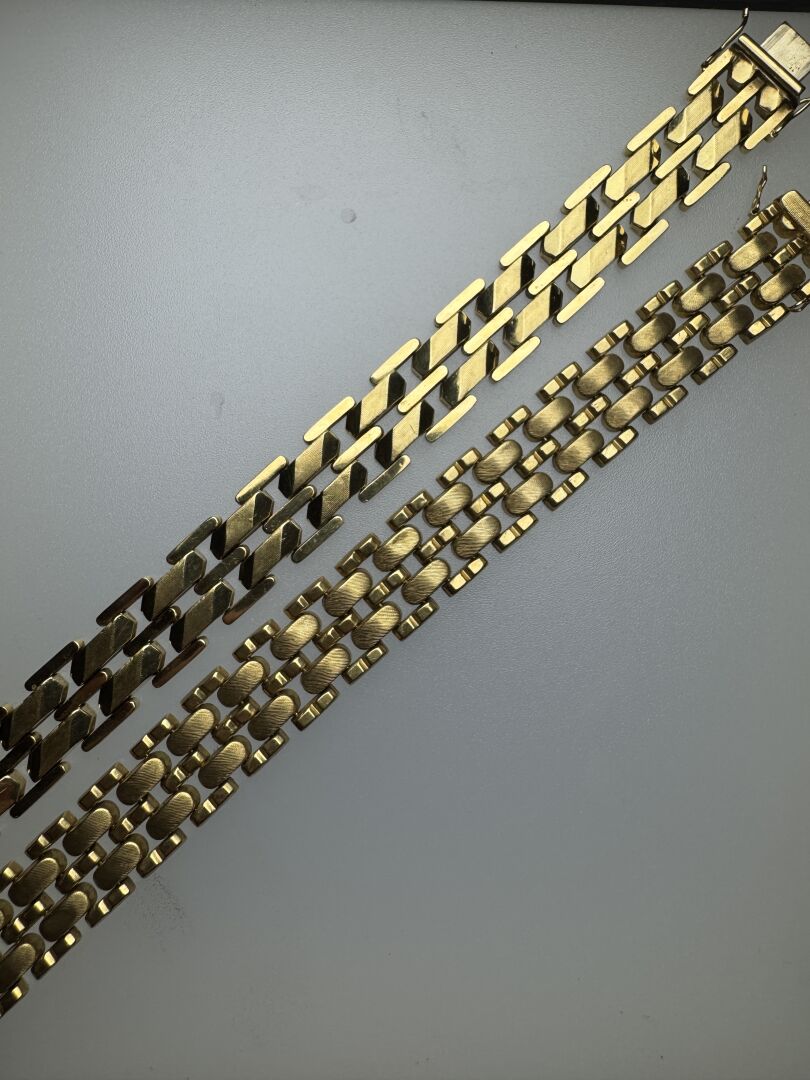 Ensemble composé de deux bracelets articulés en or jaune 14k (585 millièmes), maille grain de riz stylisé, huit de sécurité. Poids : 64,40 gr - Long. : 18,5 cm et 19 cm