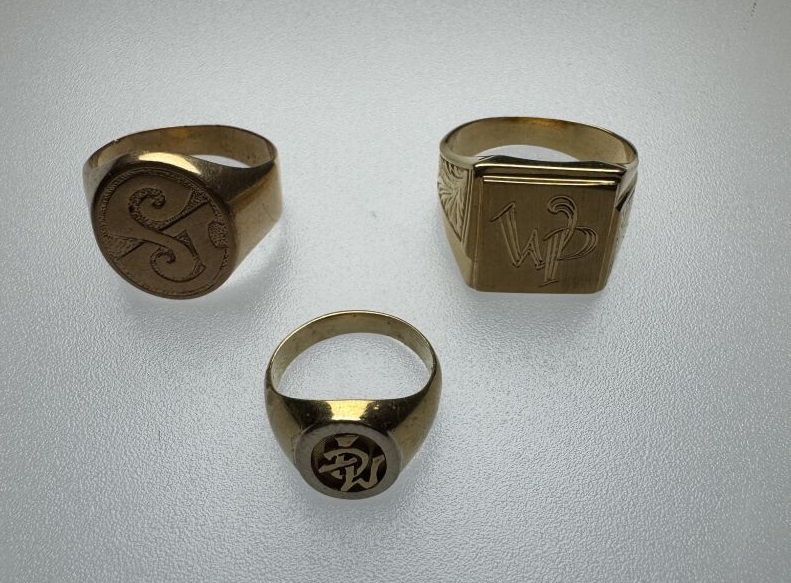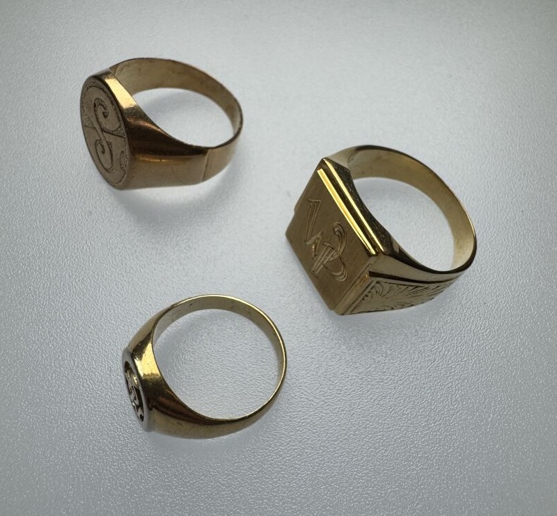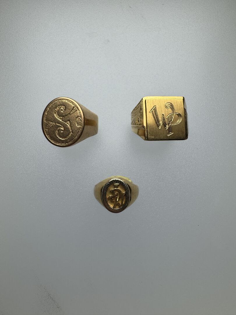 Lot comprenant trois chevalières en or jaune 18k (750 millièmes). Poids : 25 gr - Tours de doigt 60, 59 et 47