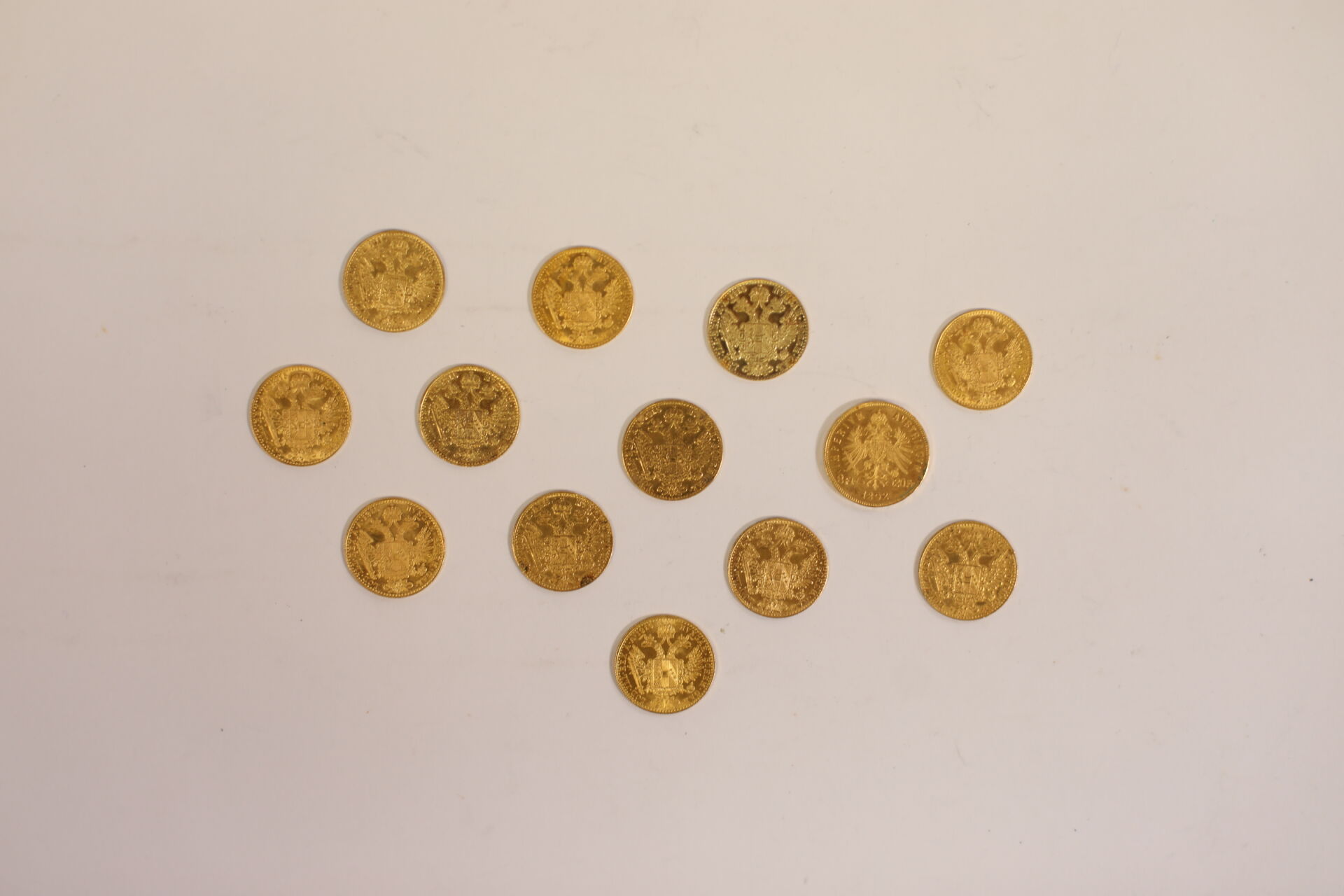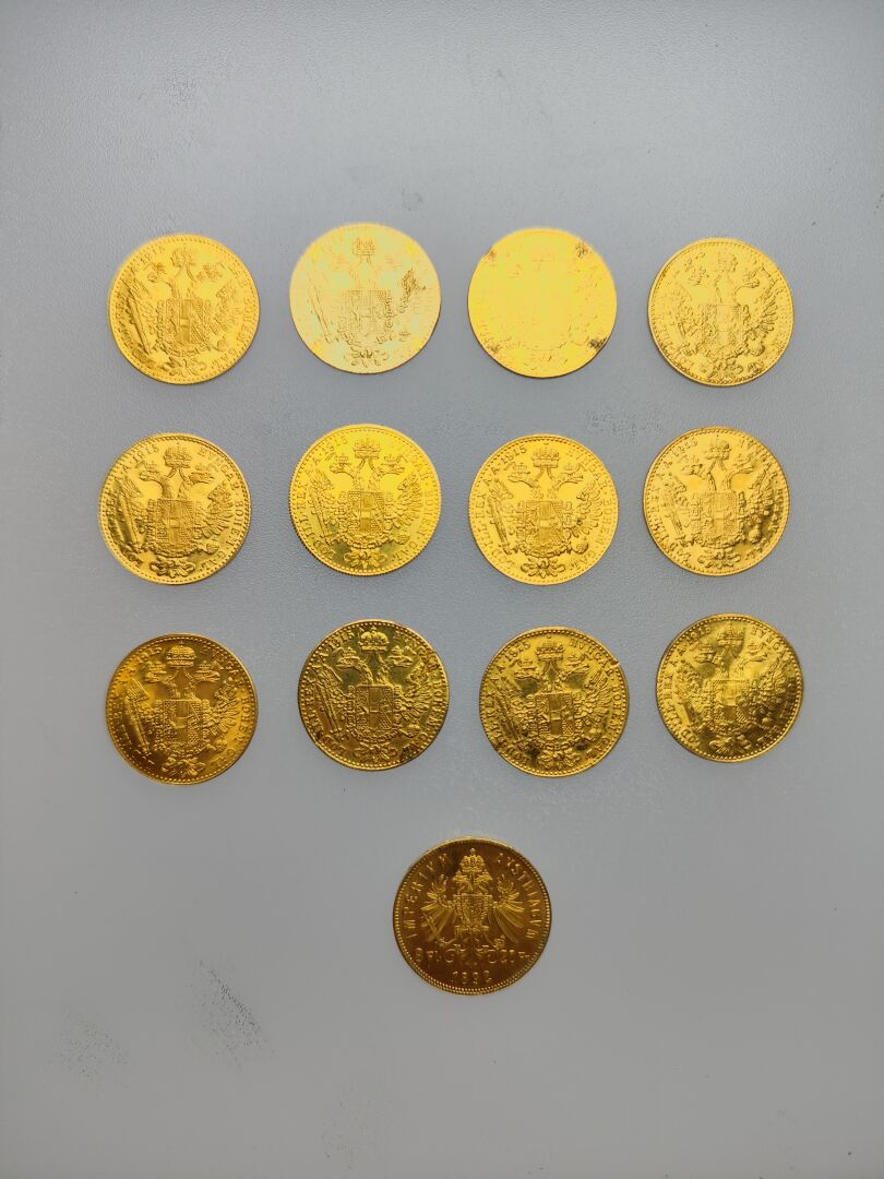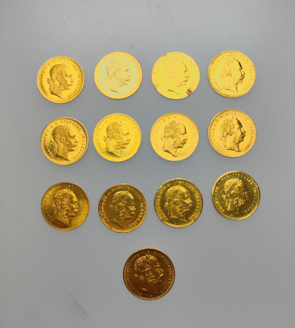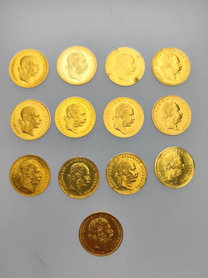 Lot composé de douze pièces en or, Autriche de un ducat François-Joseph, 1915. Nous joignons une pièce en or de 20 Francs 8 Florins François-Joseph Autriche 1892 Poids total : 44,91 gr