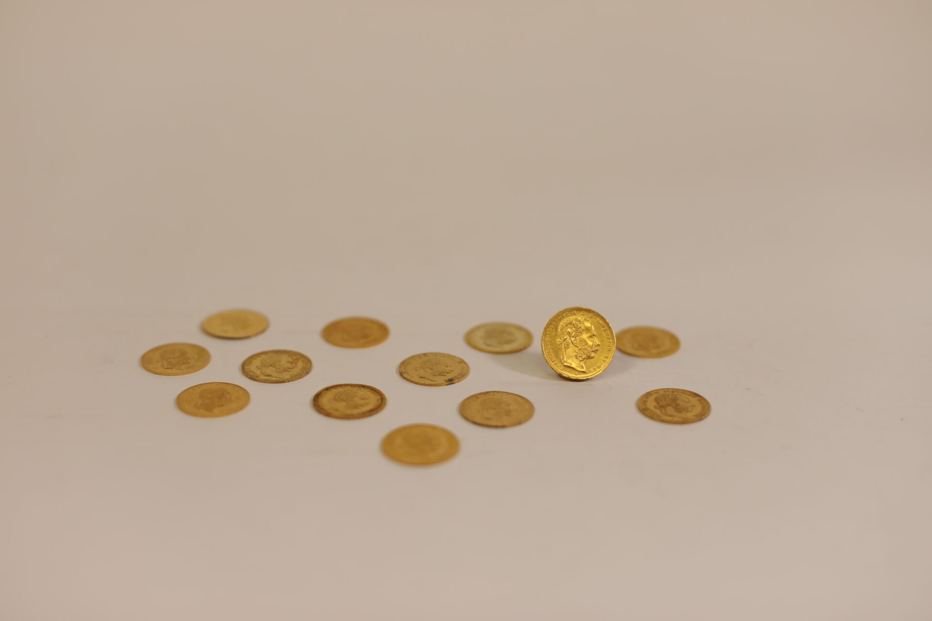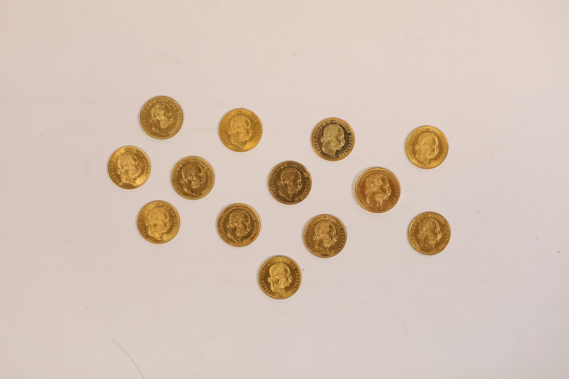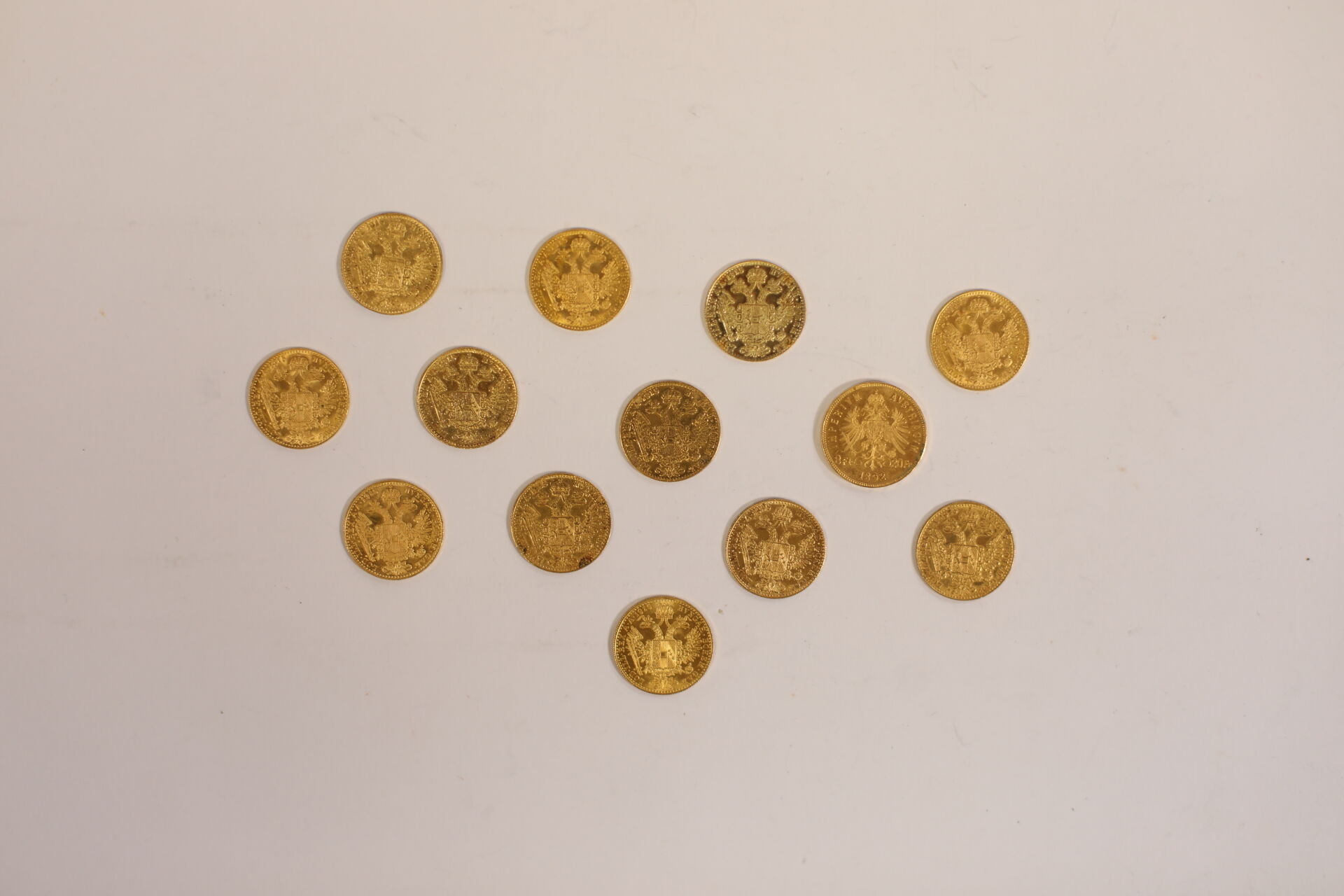 Lot composé de douze pièces en or, Autriche de un ducat François-Joseph, 1915. Nous joignons une pièce en or de 20 Francs 8 Florins François-Joseph Autriche 1892 Poids total : 44,91 gr