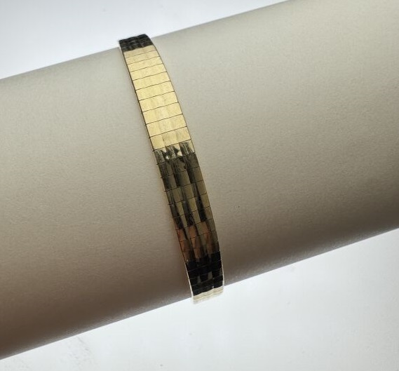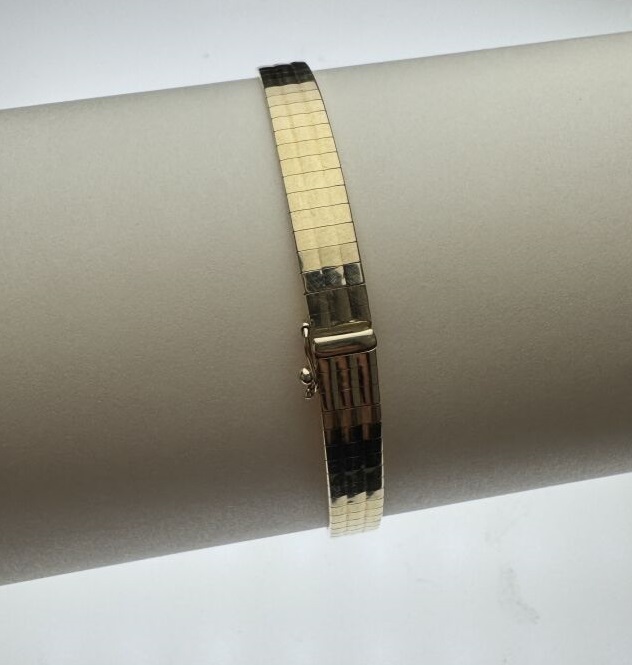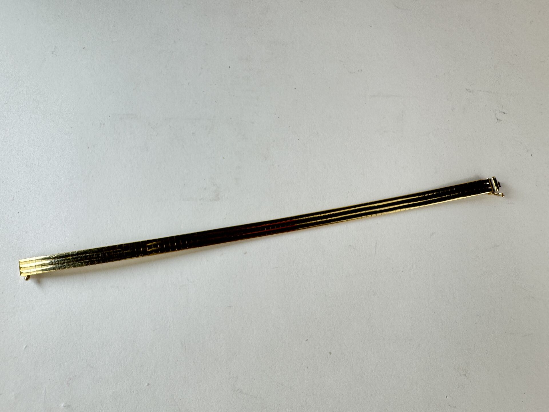 Bracelet fin articulé en or jaune 14k (585 millièmes), maille oméga, huit de sécurité. Poids : 13,63 gr - Long. : 19 cm