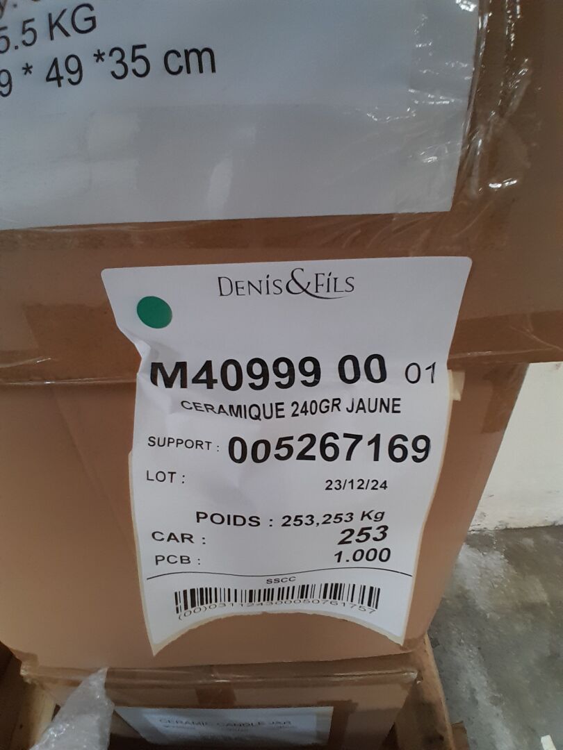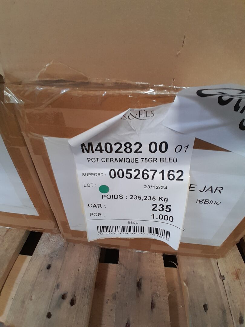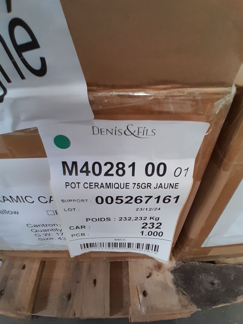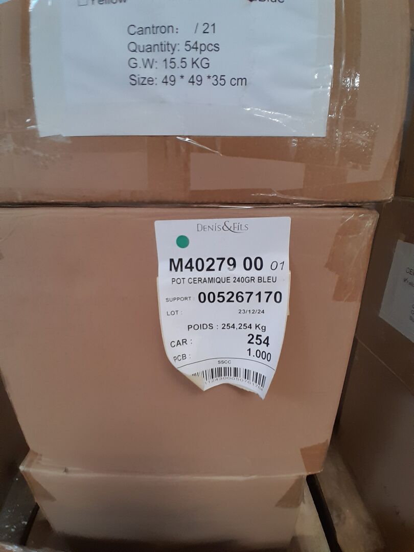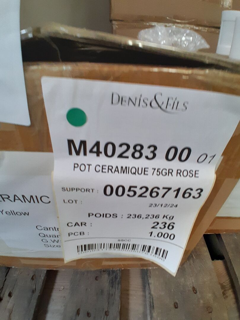 Dans le couloir principal, sur 3 palettes : environ 1300 pots en céramique 2 tailles différentes 3 coloris : bleu-jaune -rose (frais de mise à disposition 30 € TTC)