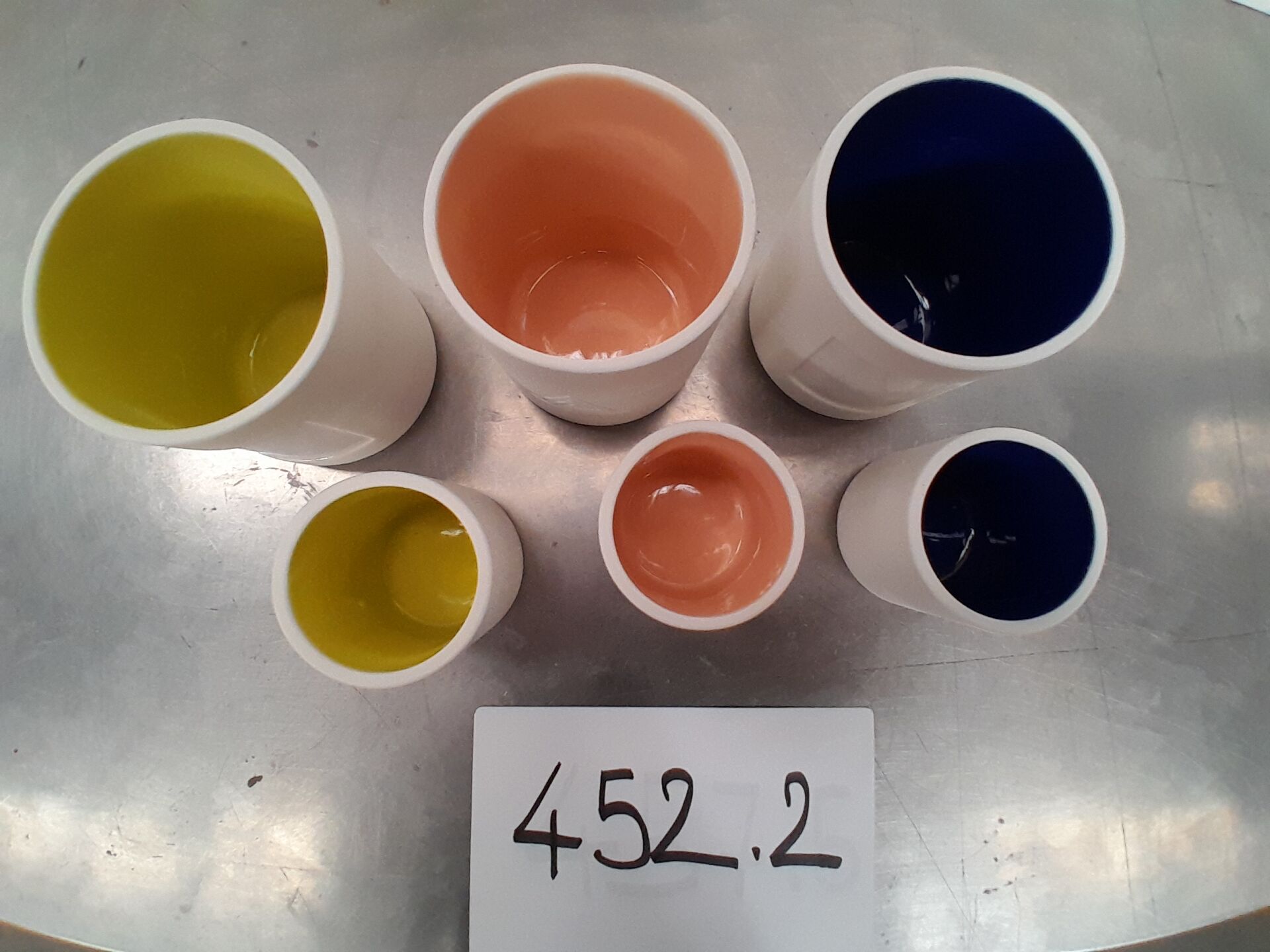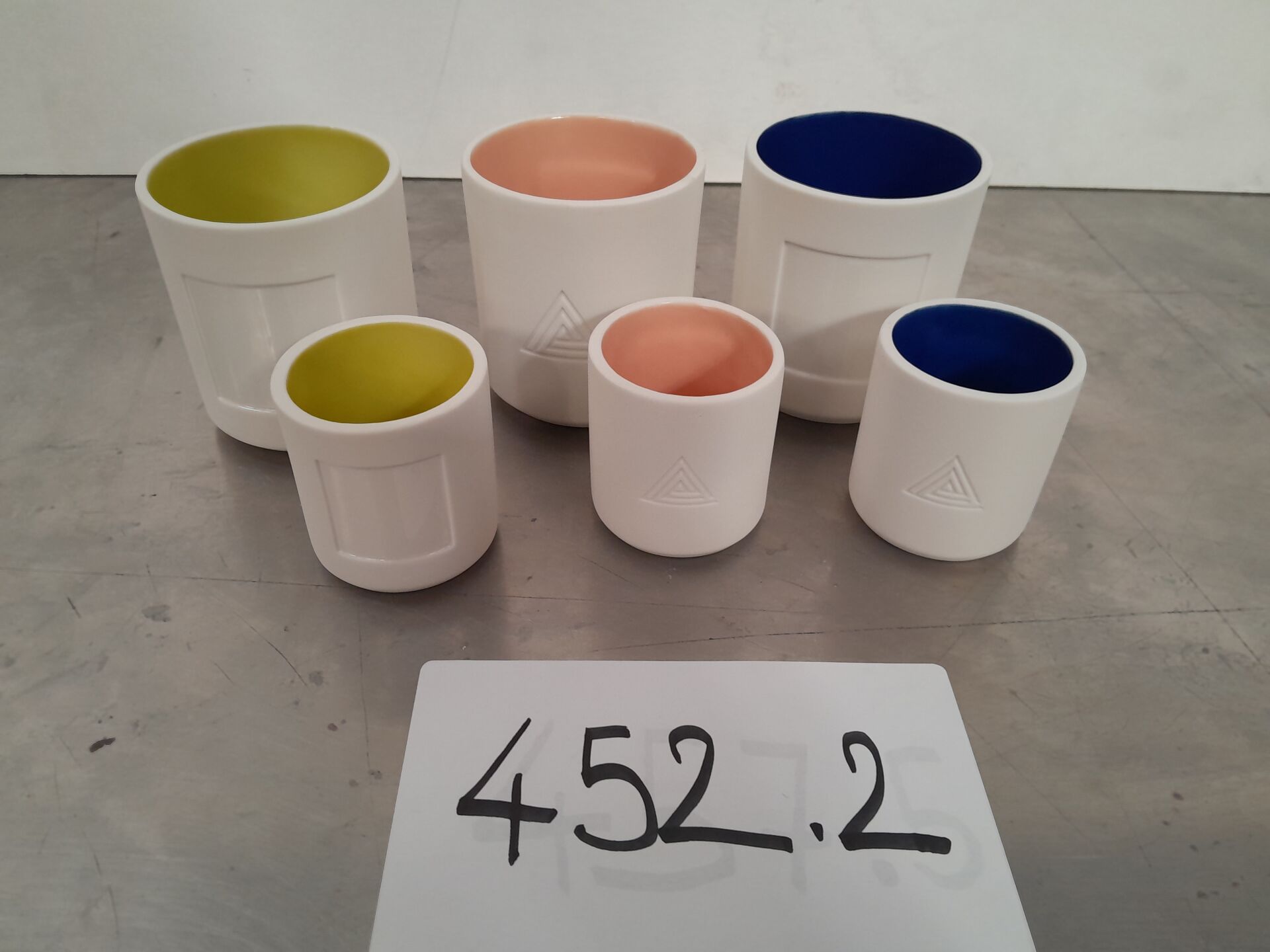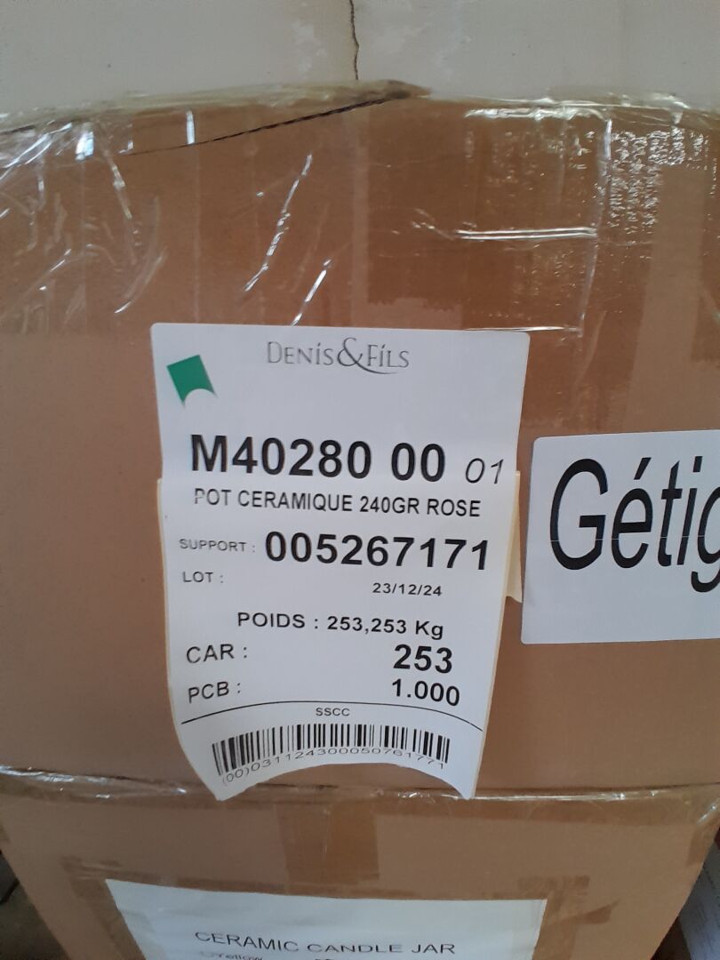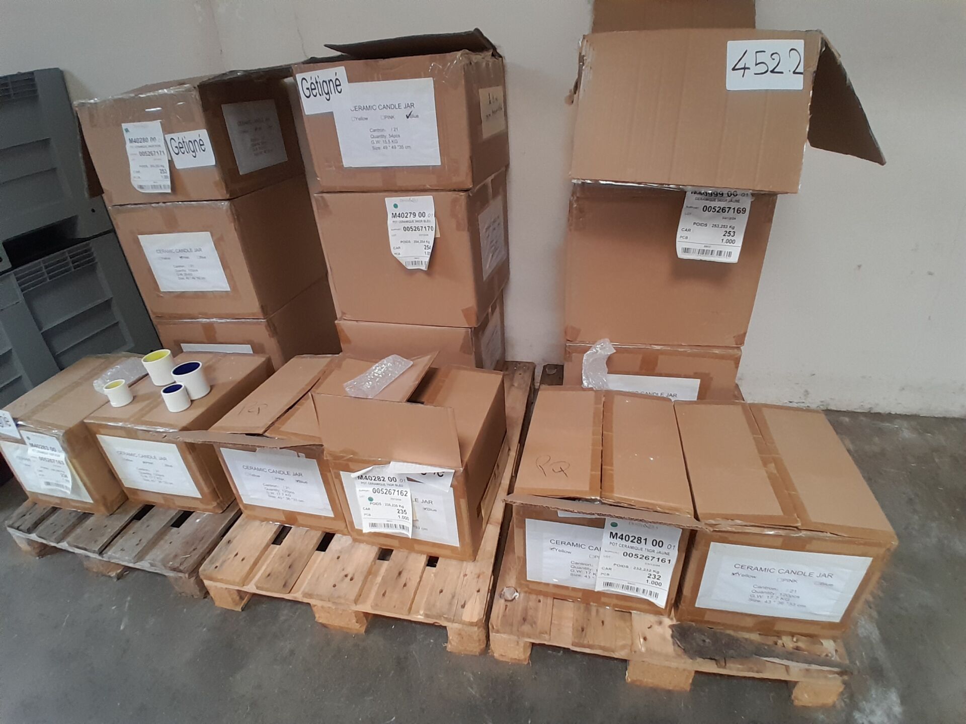 Dans le couloir principal, sur 3 palettes : environ 1300 pots en céramique 2 tailles différentes 3 coloris : bleu-jaune -rose (frais de mise à disposition 30 € TTC)