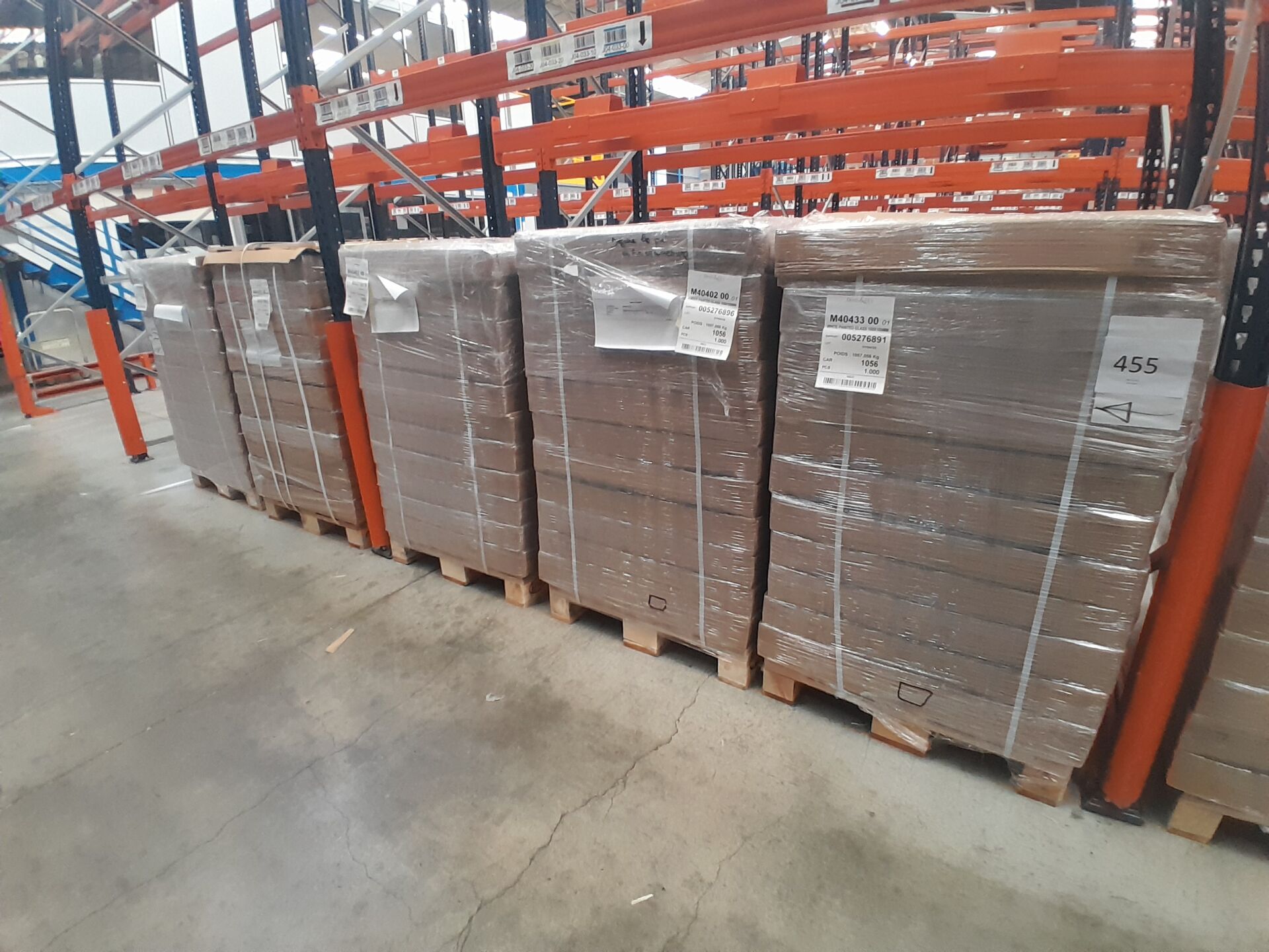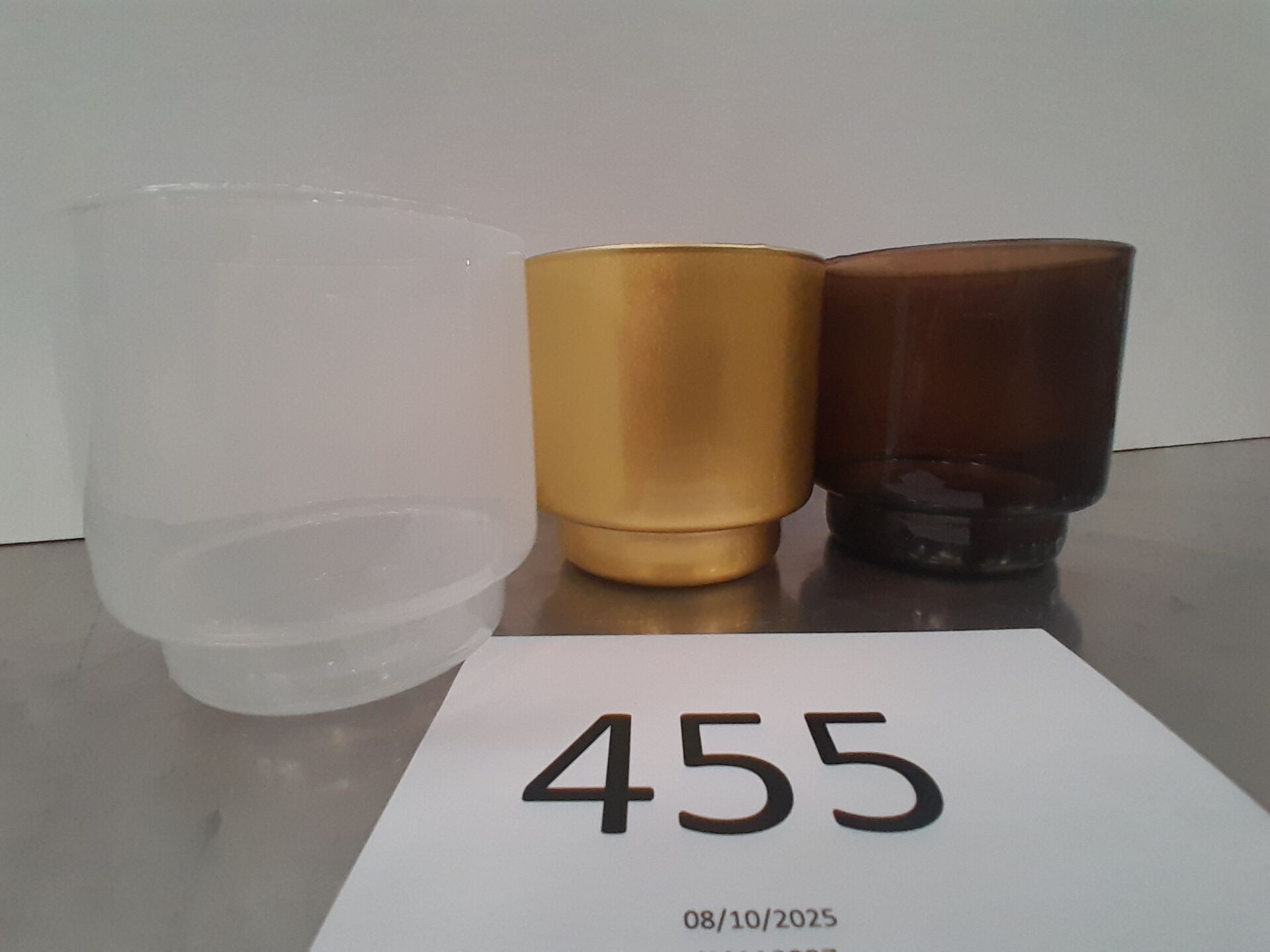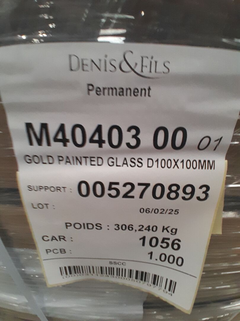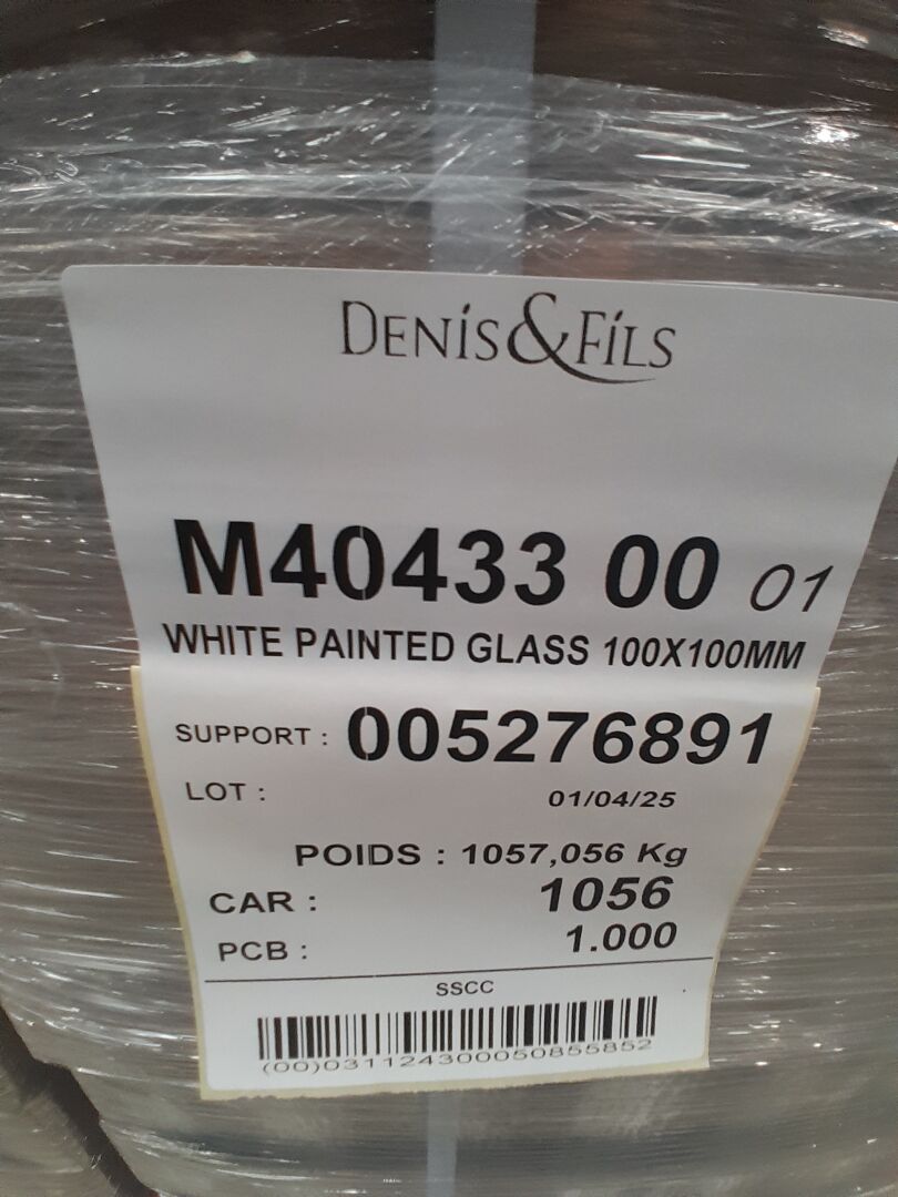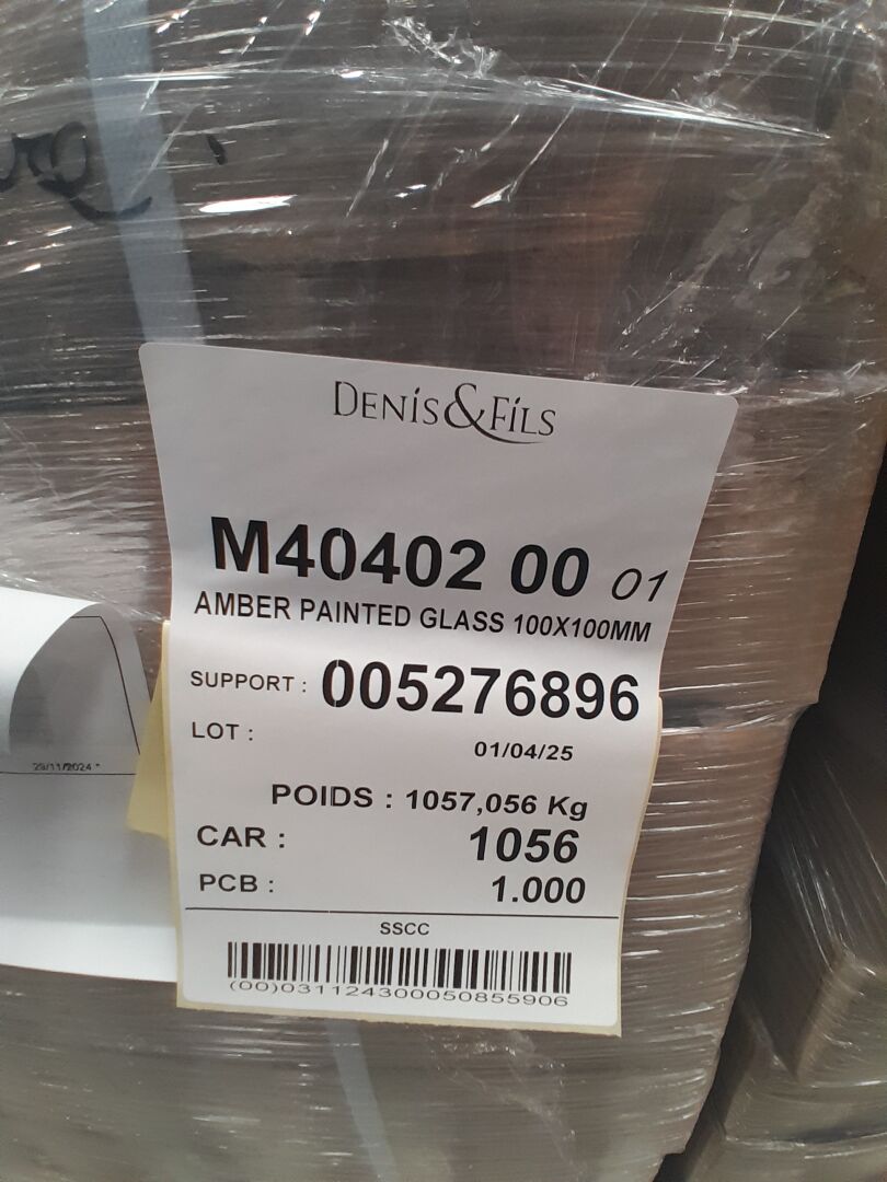Dans l'allée J04, sur 5 palettes un lot d'environ 5250 verres peints dont : 2100 verres peints couleur ambre 100X100, 2100 verres peints blancs 100X100, 1050 verres peints or 100X100 (frais de mise à disposition 30 € TTC)