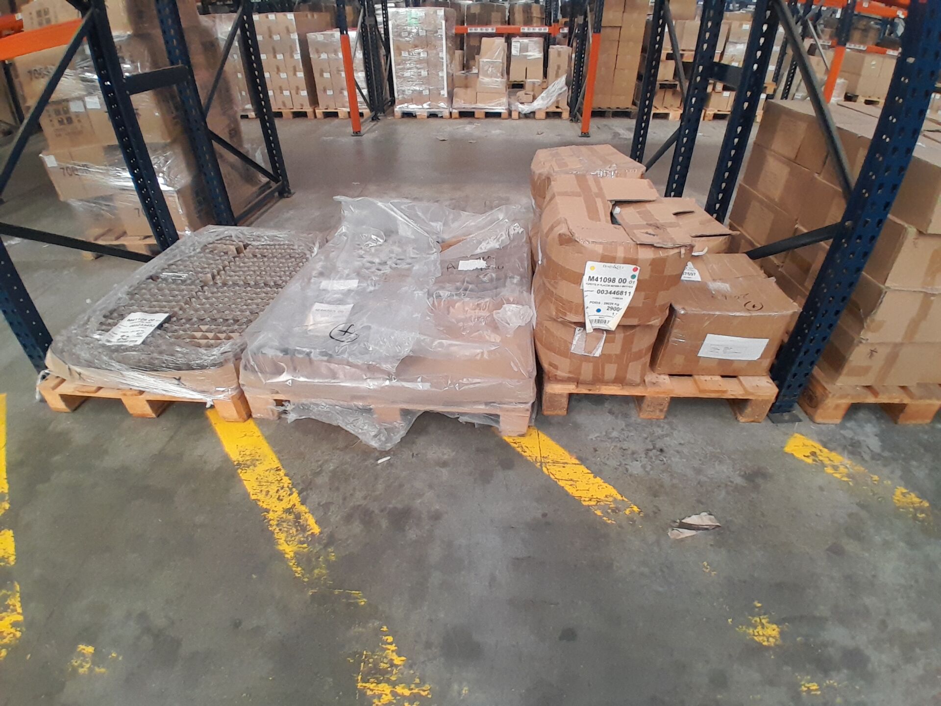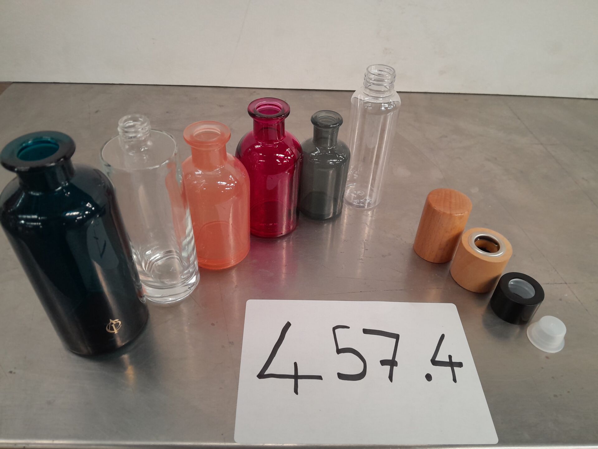 Dans l'allée J09 , sur 12 palettes : 1 ensemble d'environ 65 000 flacons et capuchons de différentes tailles, formes et matériaux dont : 27 000 capuchons ouverts en aluminium, 2300 flacons rose 100 ml, 300 flacons en verre transparent 100 ml, 100 flacons Antica Pharmacia bleus, 10 000 topettes plastique pour flacons, 5500 flacons gris 50 ml, 6000 capots pour flacons en bois, 1500 flacons en plastique, 2500 flacons framboise 100 ml, 9000 bagues en bois pour flacons etc... (frais de mise à disposition 30 € TTC)