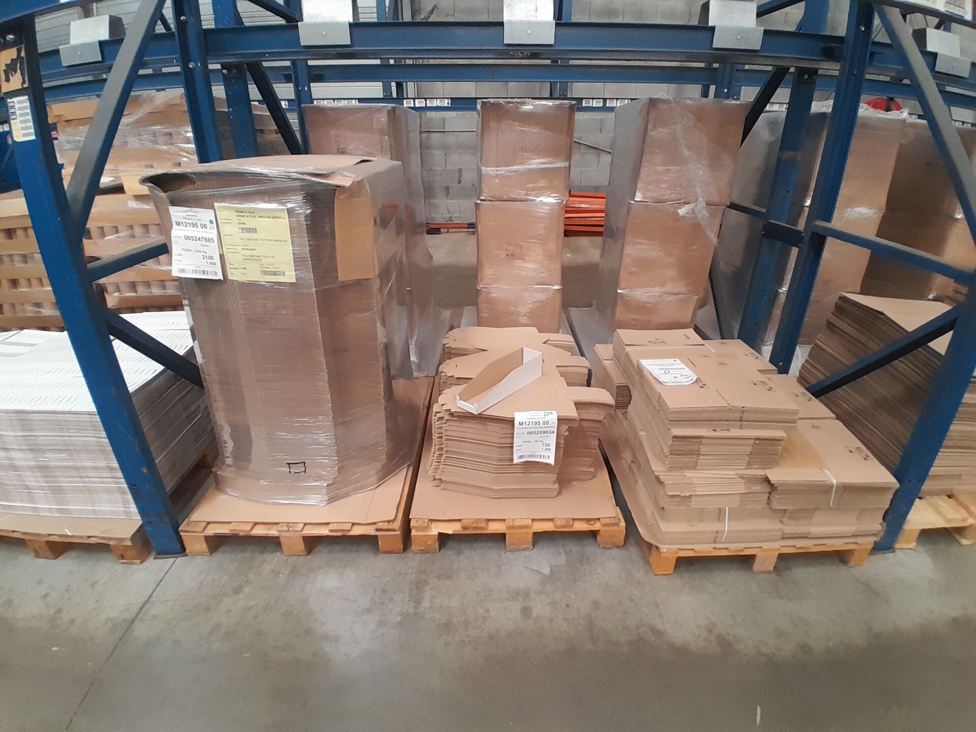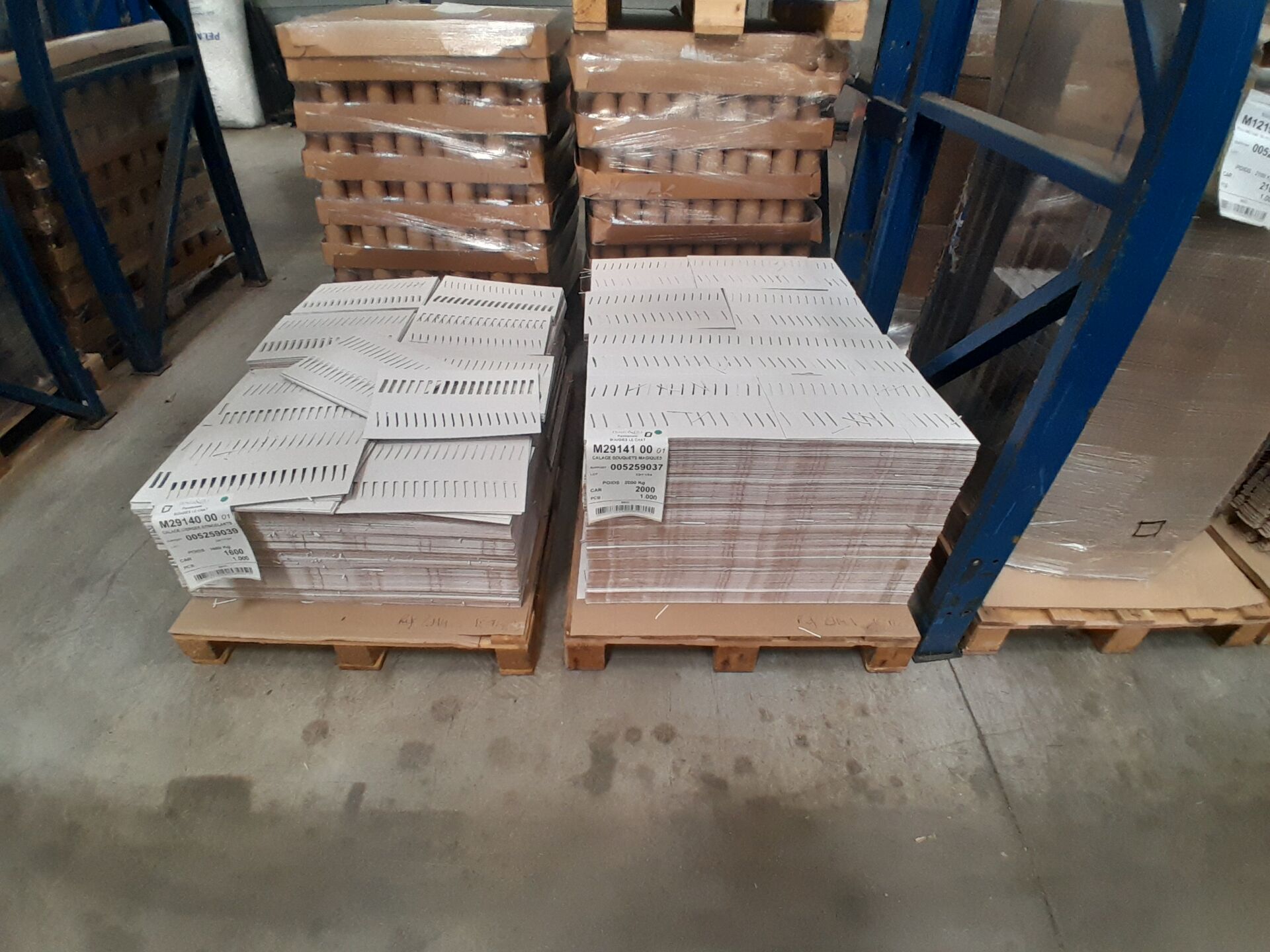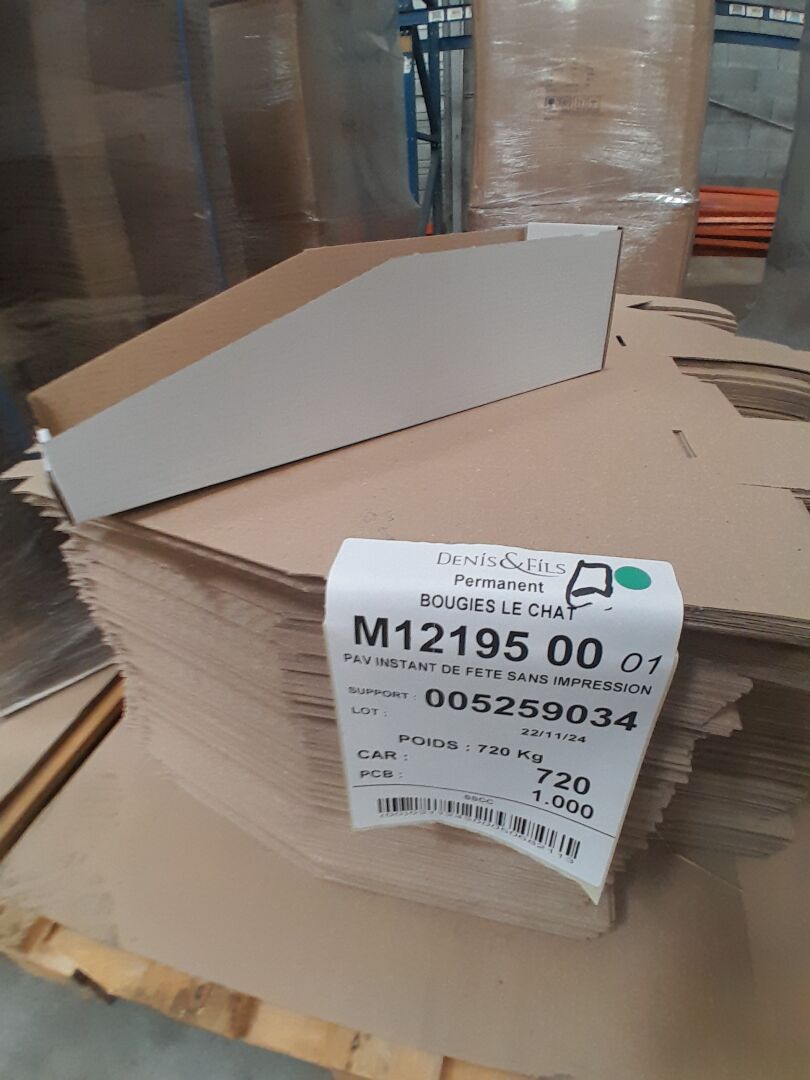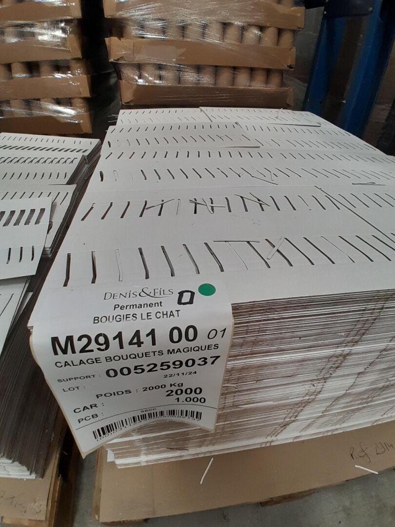 Dans l'allée J03 sur 7 palettes un lot d'environ 6400 cartons et éléments cartonnés dont : 3500 calages pour bouquets magiques, 2800 PAV instant de fête sans impression, 400 cartons 240X196X170, 60 box en cartons 580X340X350, 250 cartons 390X128X164 MM (frais de mise à disposition 30 € TTC)