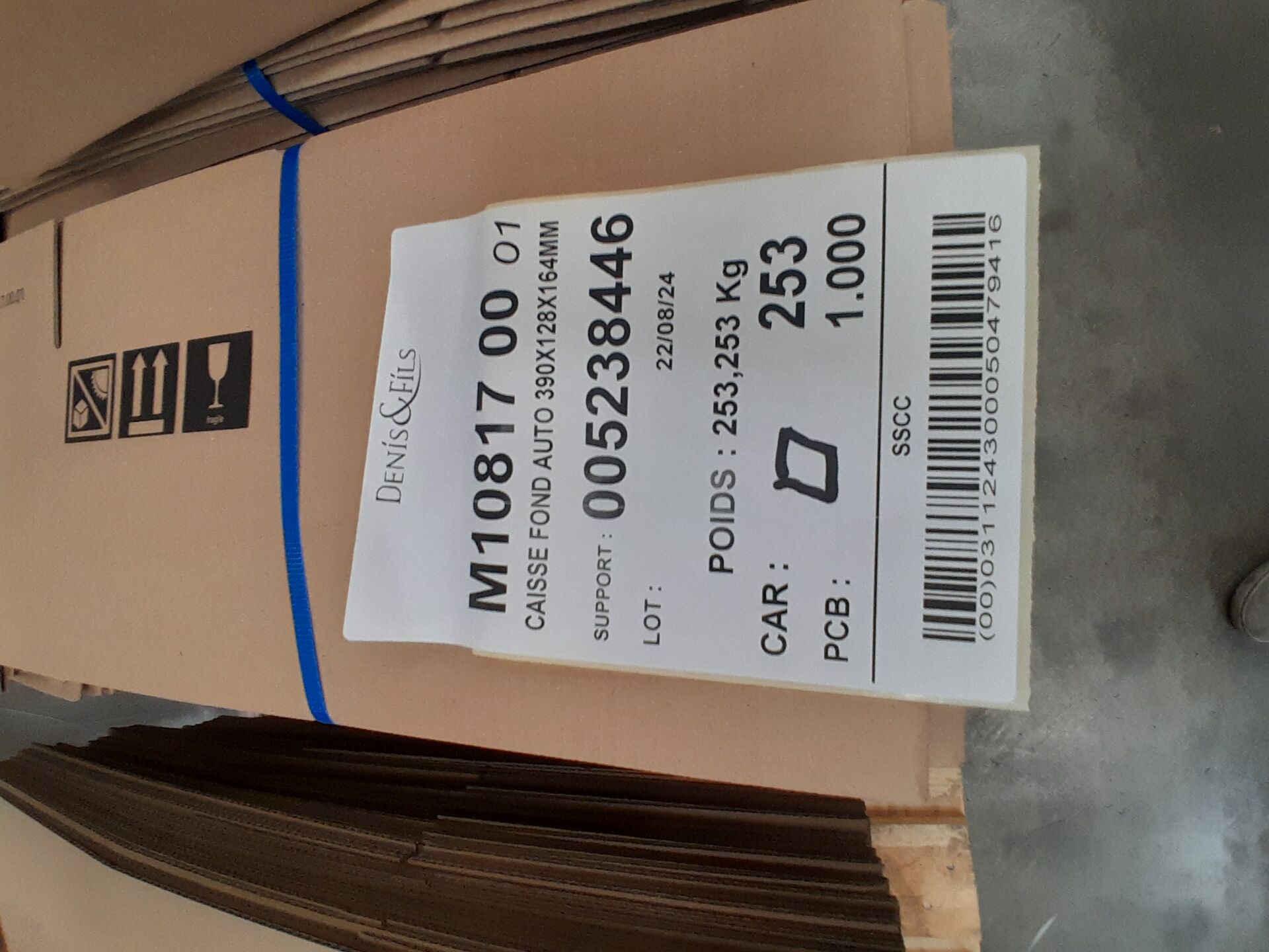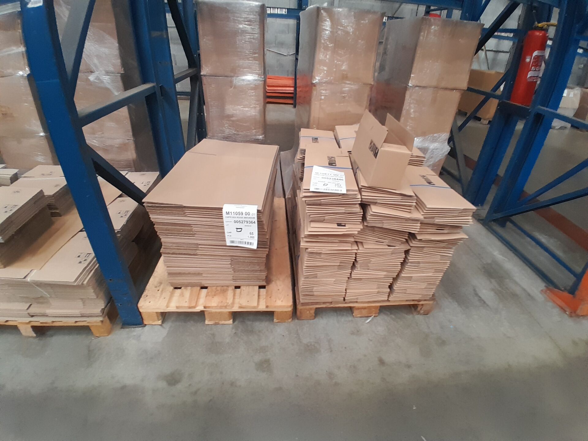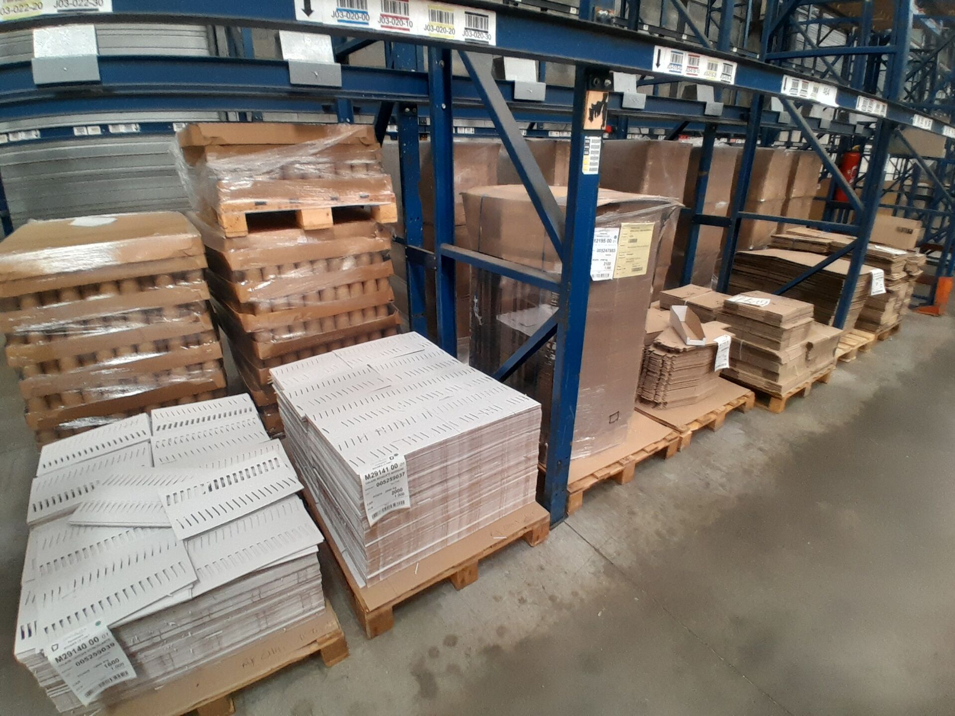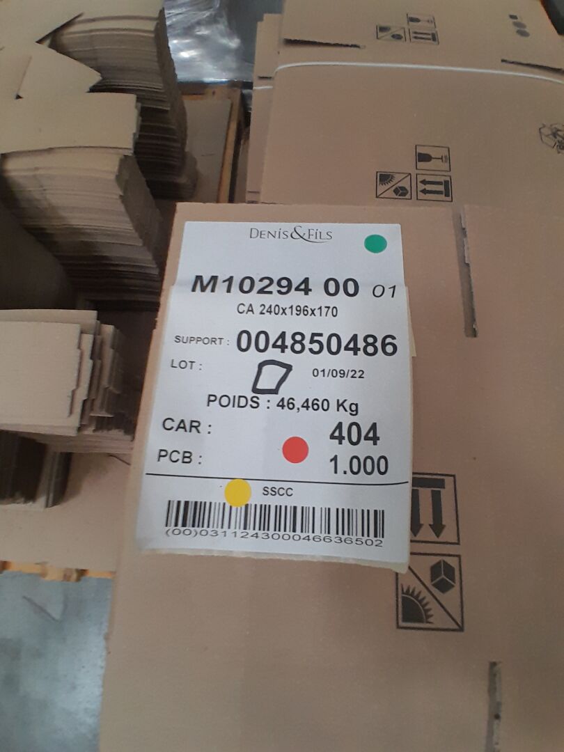 Dans l'allée J03 sur 7 palettes un lot d'environ 6400 cartons et éléments cartonnés dont : 3500 calages pour bouquets magiques, 2800 PAV instant de fête sans impression, 400 cartons 240X196X170, 60 box en cartons 580X340X350, 250 cartons 390X128X164 MM (frais de mise à disposition 30 € TTC)