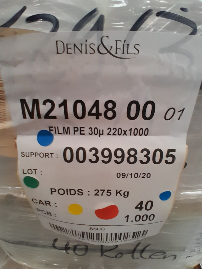 Dans l'allée J12, sur 6 palettes un lot constitué de 205 films PE 30U 220X1000 ainsi que 16 cellophanes pour emballage SAMEC référence 32COS- PCDC EXT (frais de mise à disposition 30 € TTC)