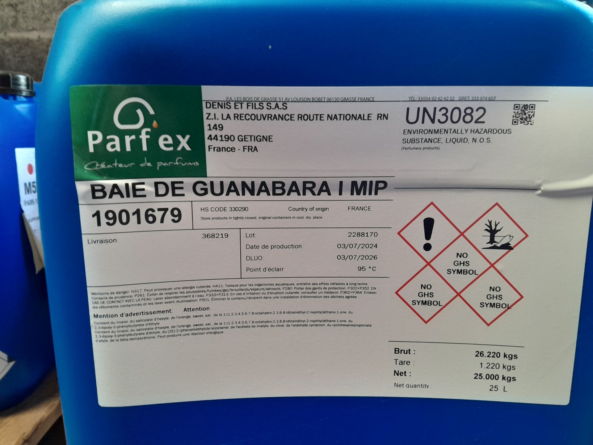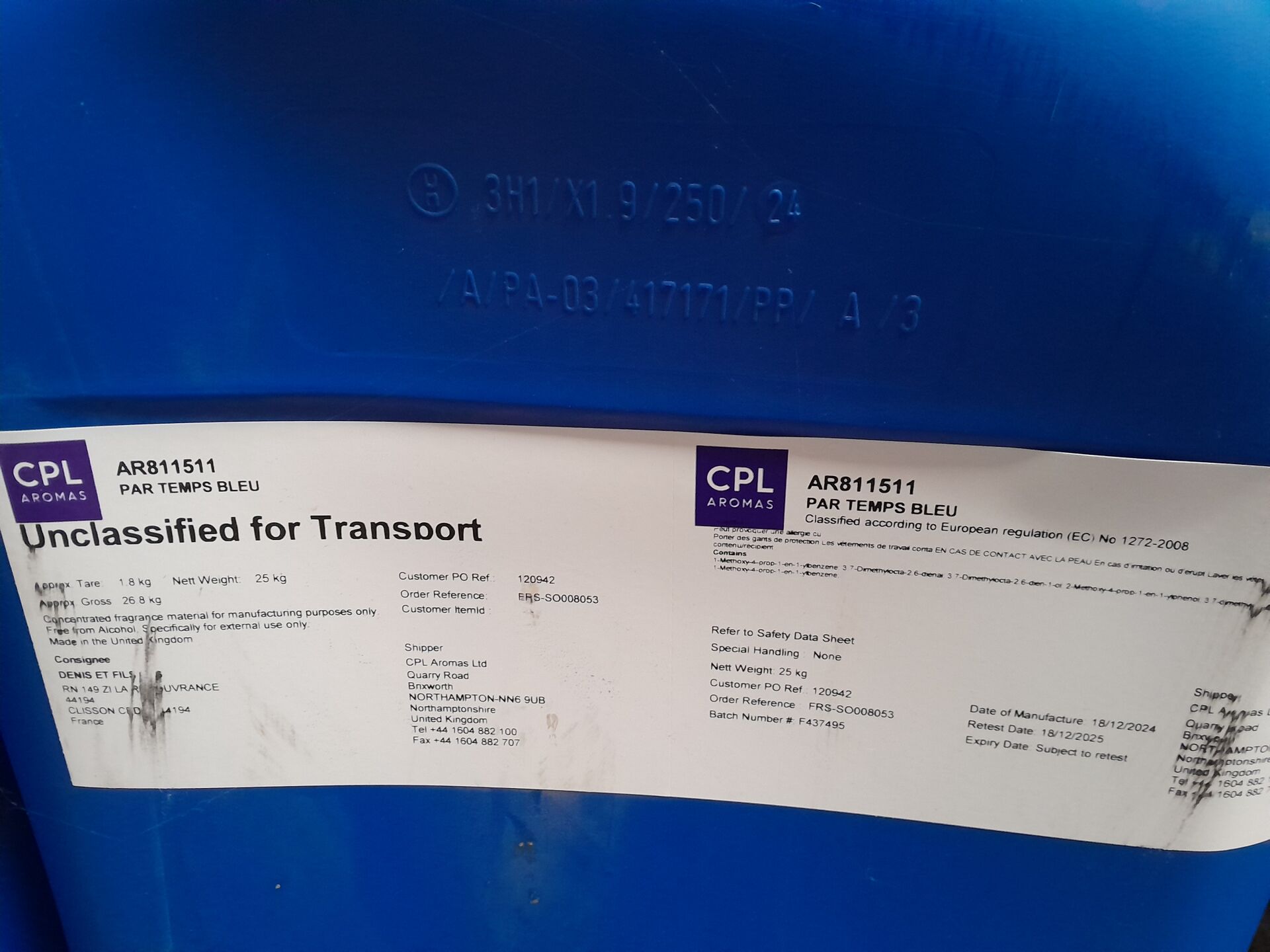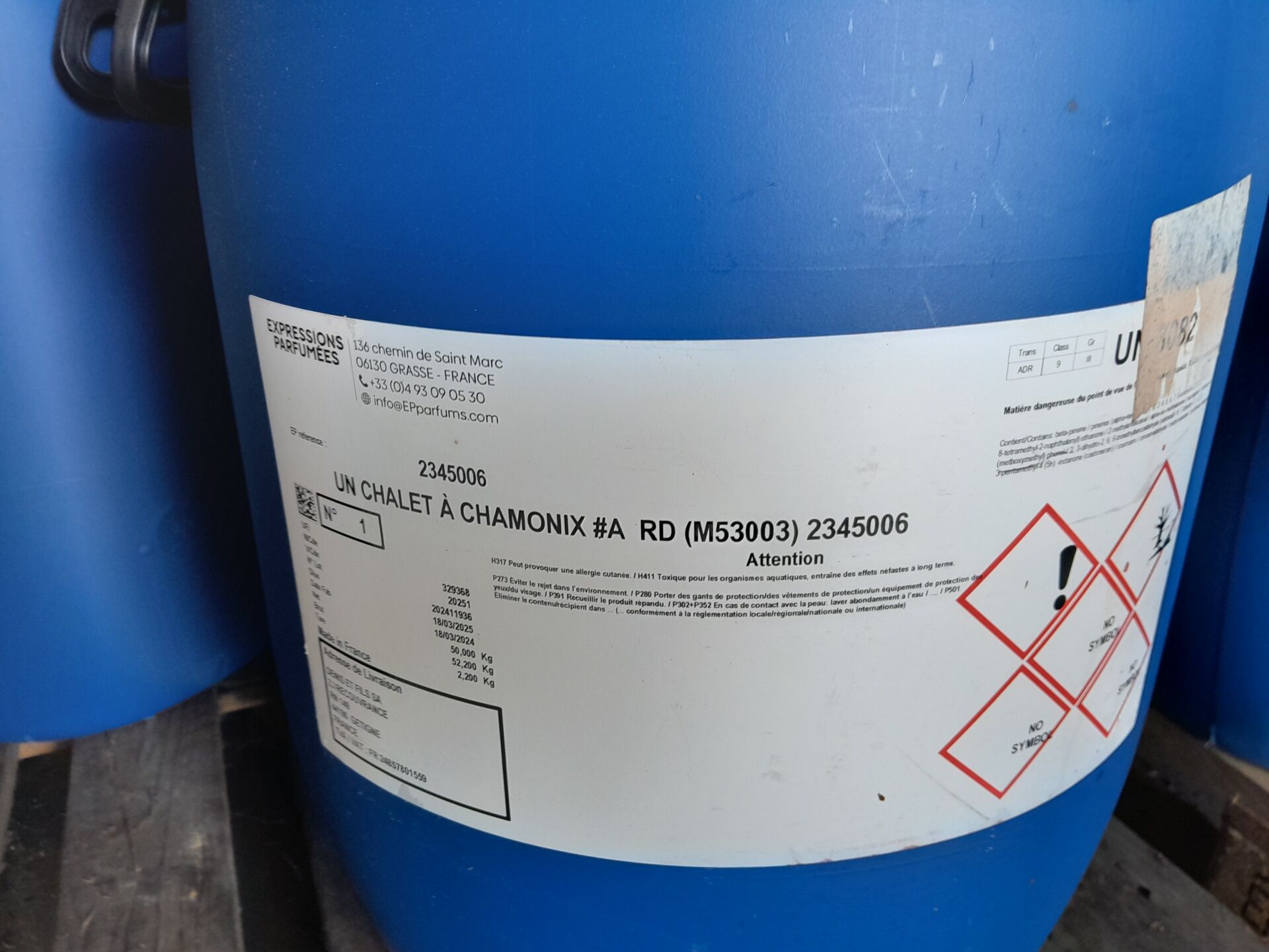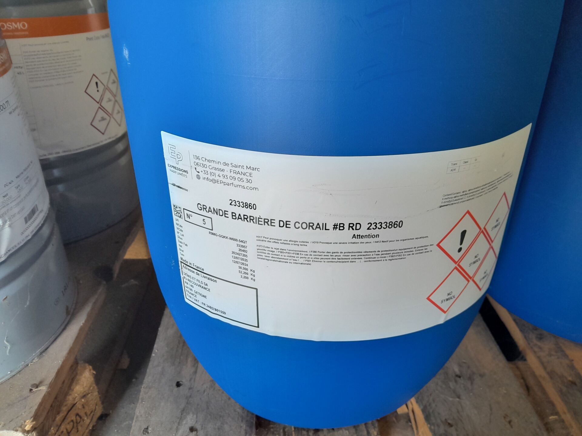 Lot constitué d'environs 200 bidons de parfums à usage professionnel de différentes senteurs et de différentes marques dont : EXPRESSIONS PARFUMEES, PARFEX, IBERCHEM ETC … (frais de mise à disposition 10 € TTC)