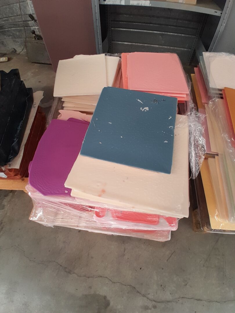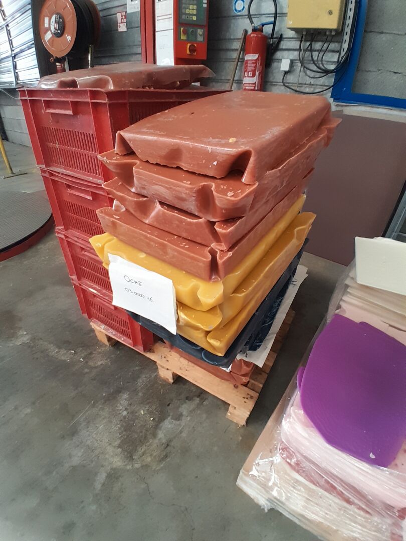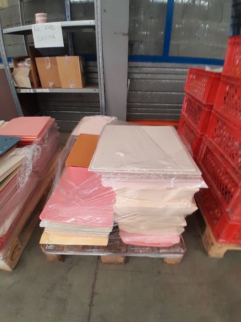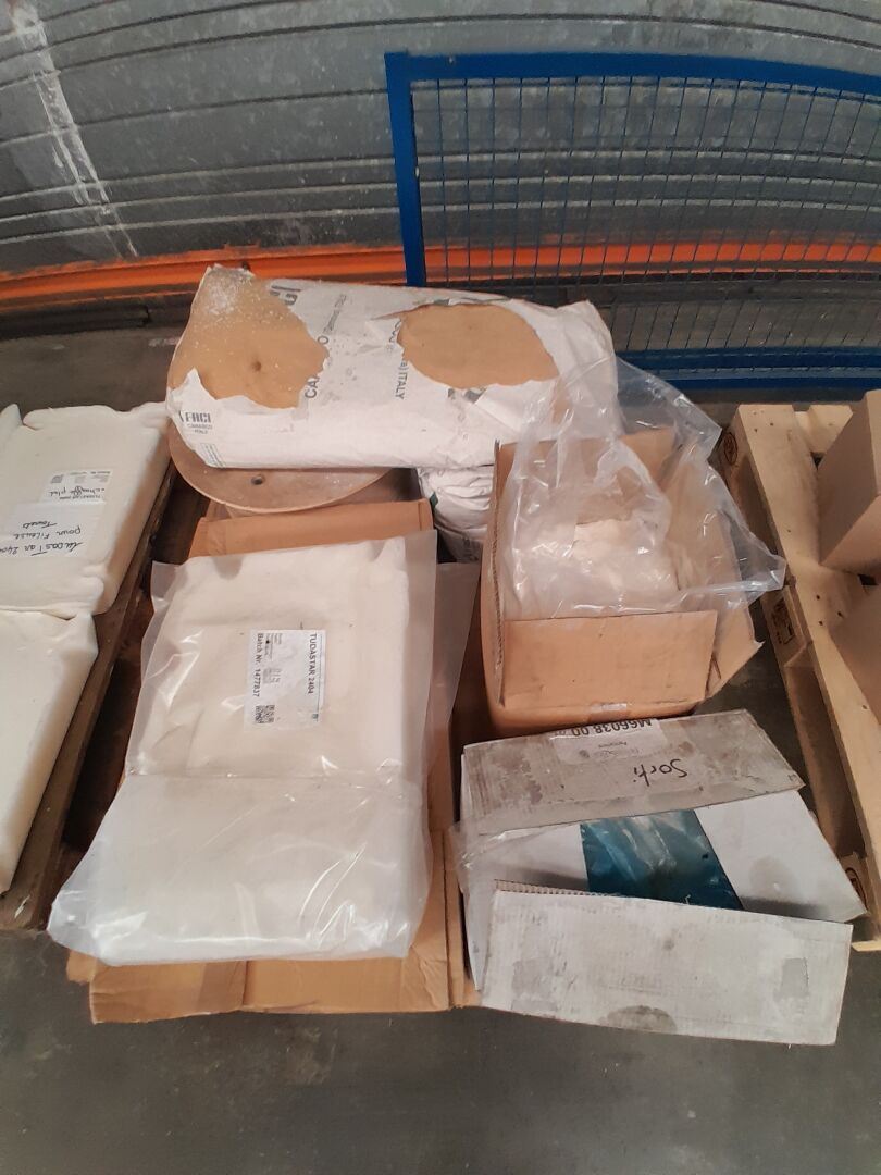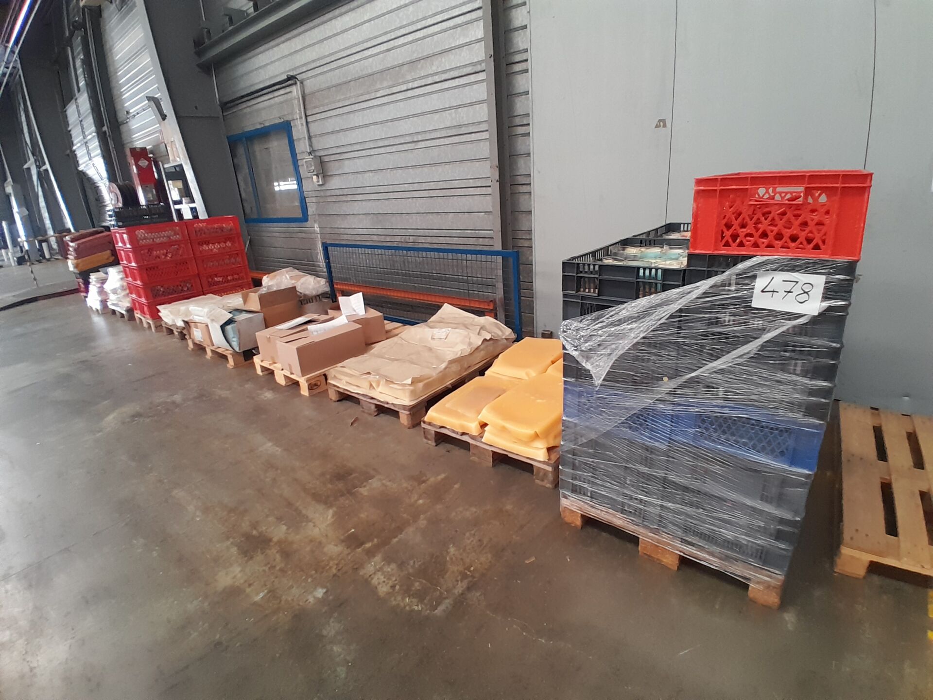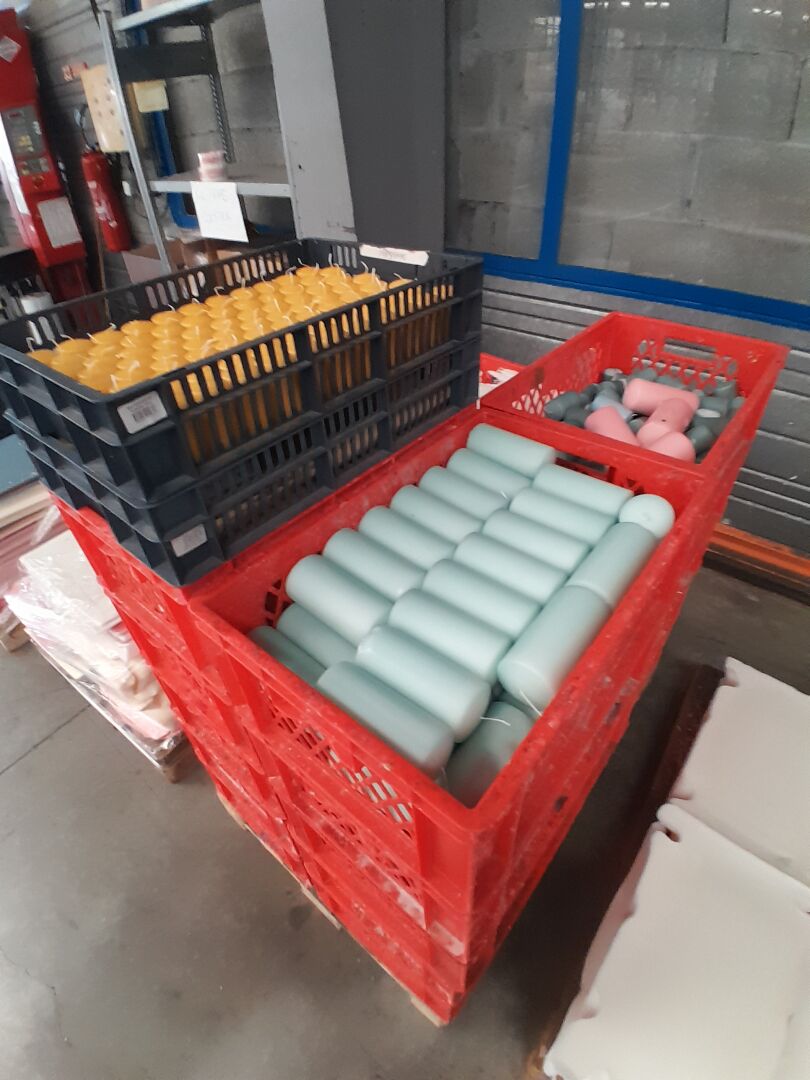 Sur 10 palettes : 1 ensemble de matières premières dont environ 50 plaques de cire colorée, environ 1000 bougies à refondre (certaines dans contenants verre) etc ... on y ajoute environ 60 cagettes en plastique