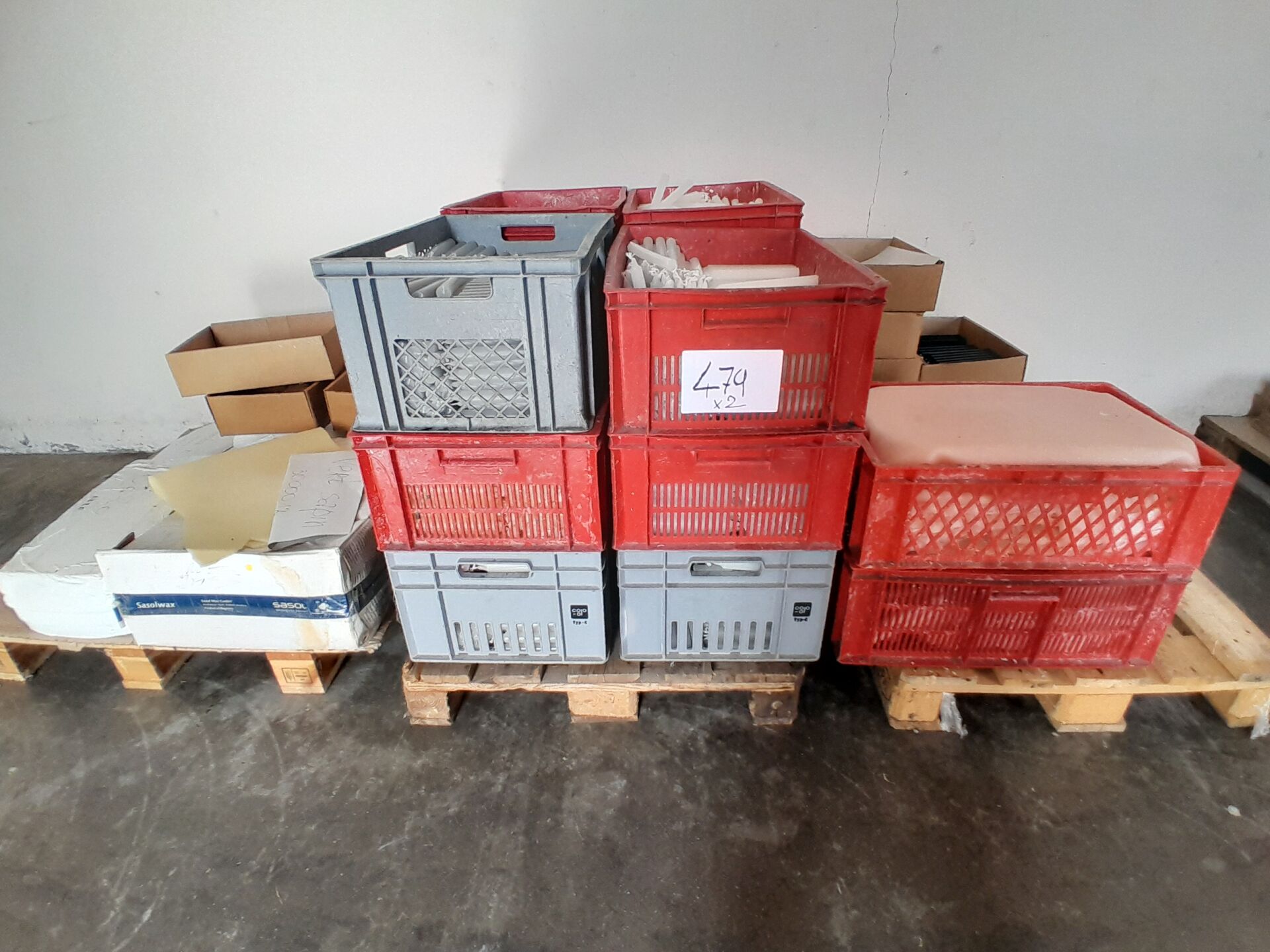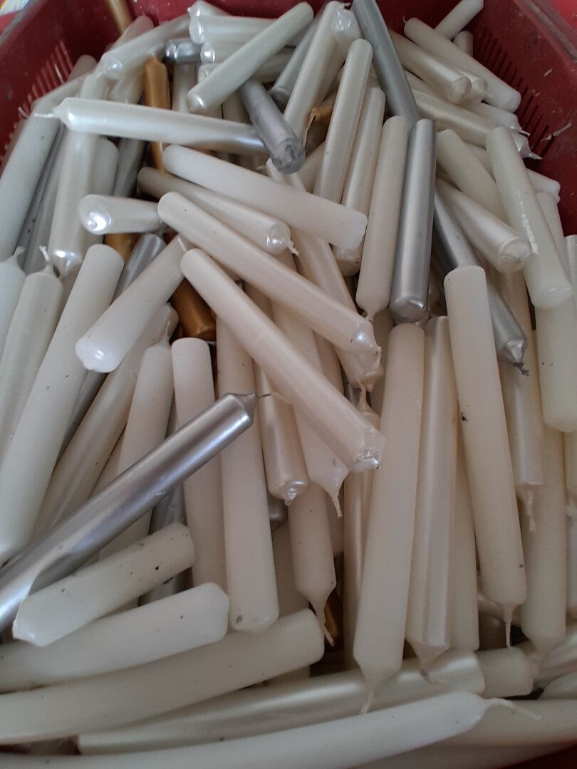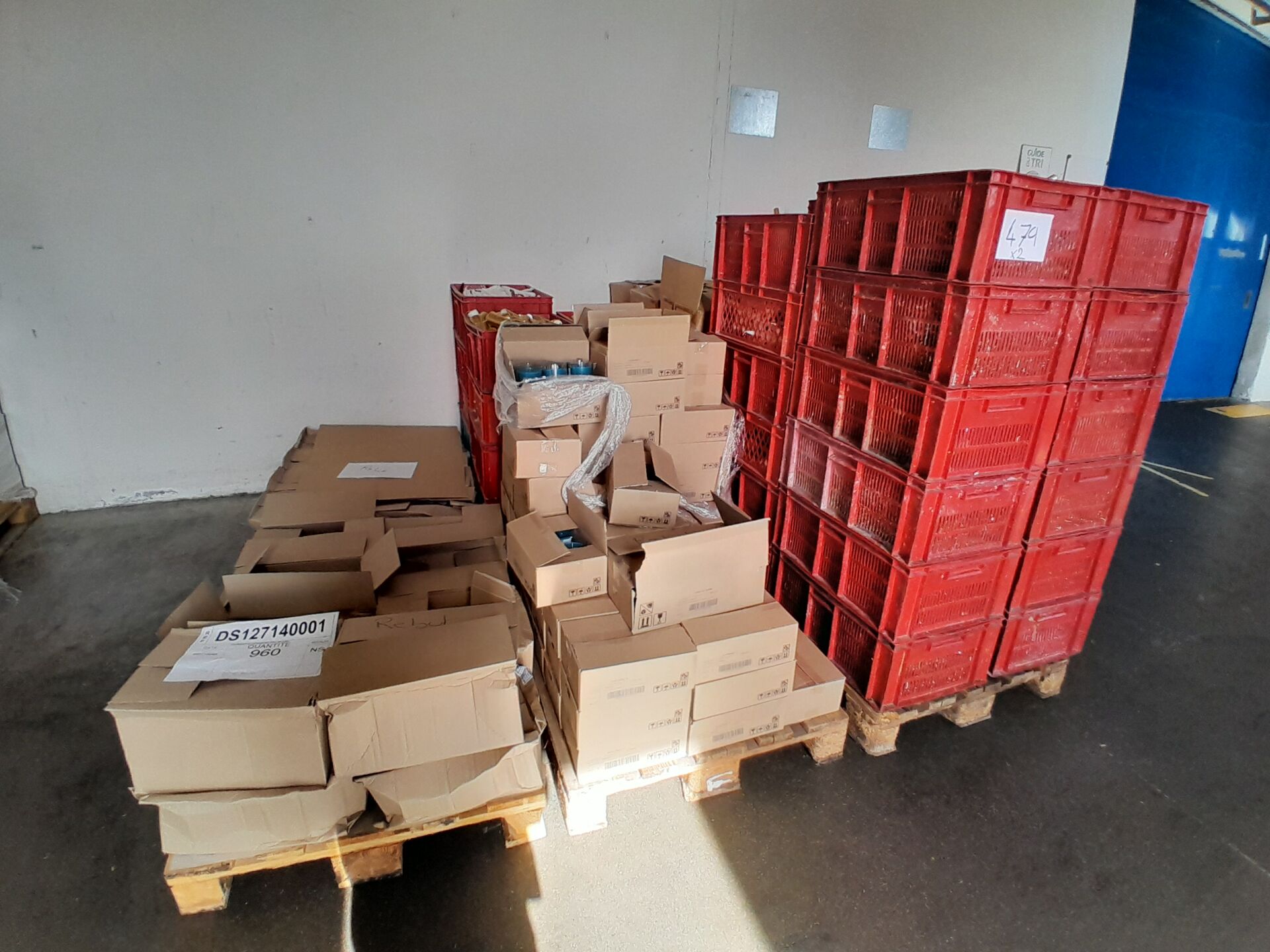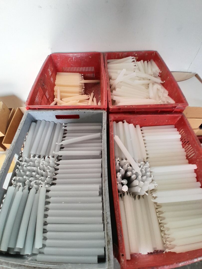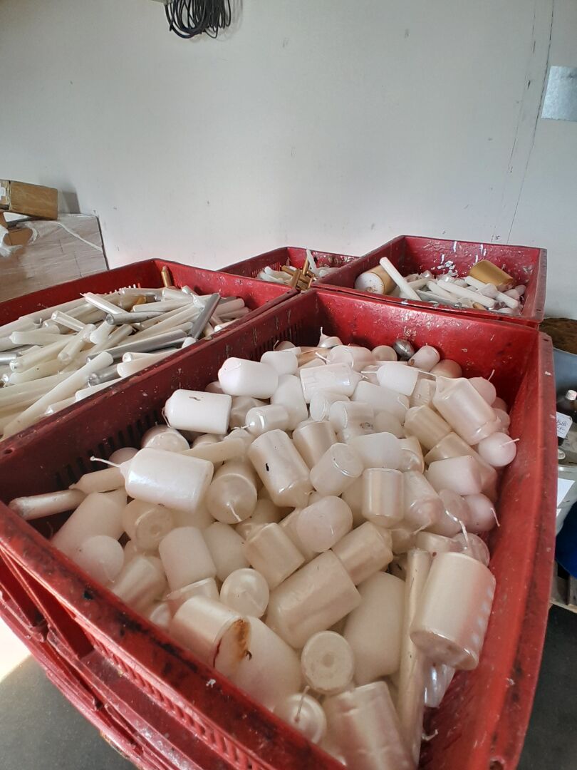 Dans le couloir principal, sur 9 palettes : environ 4000 bougies pour refonte, on y ajoute environ 40 caisses en plastique