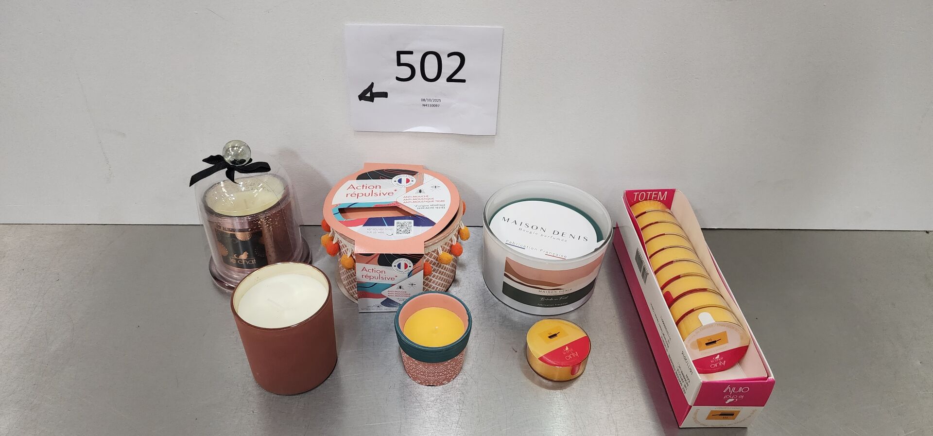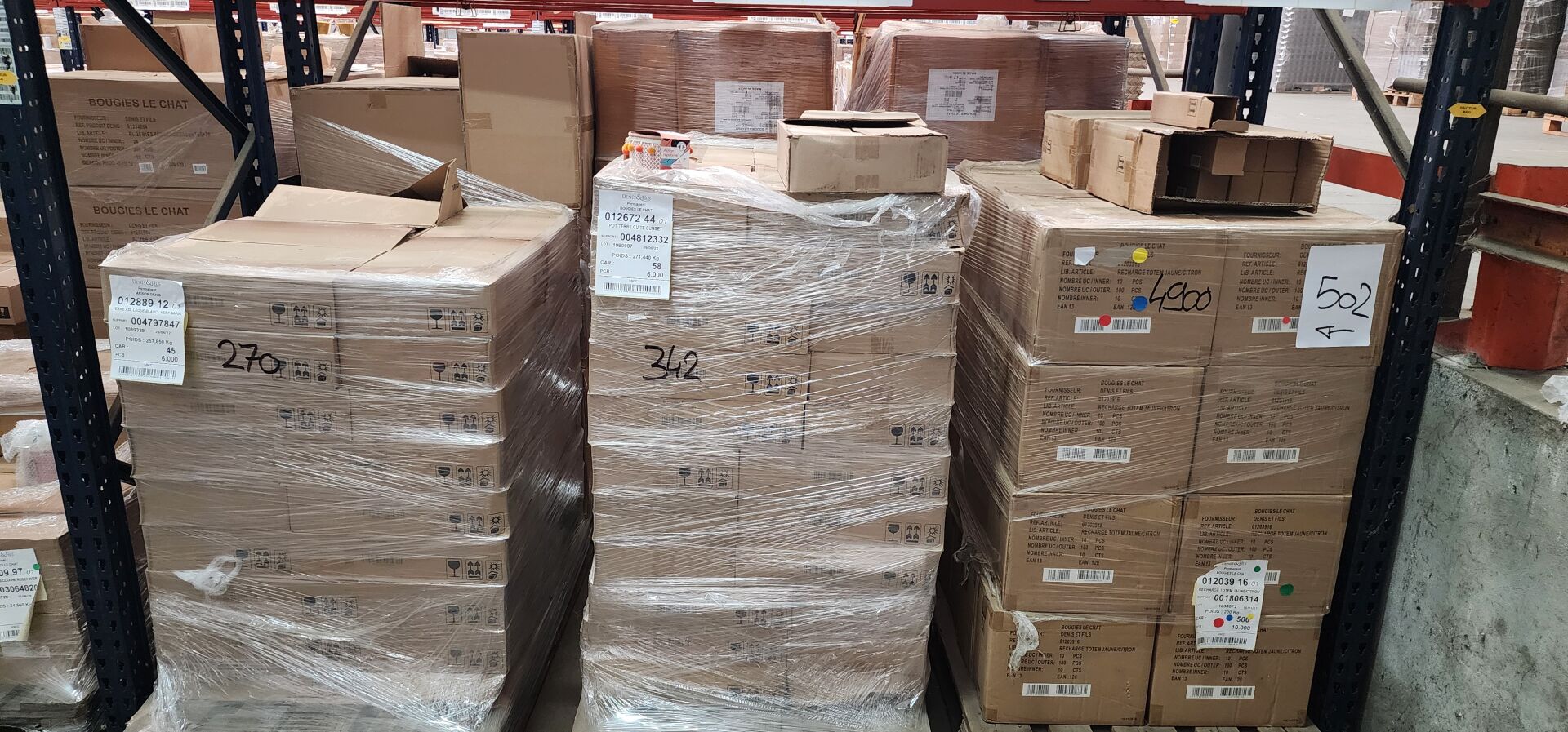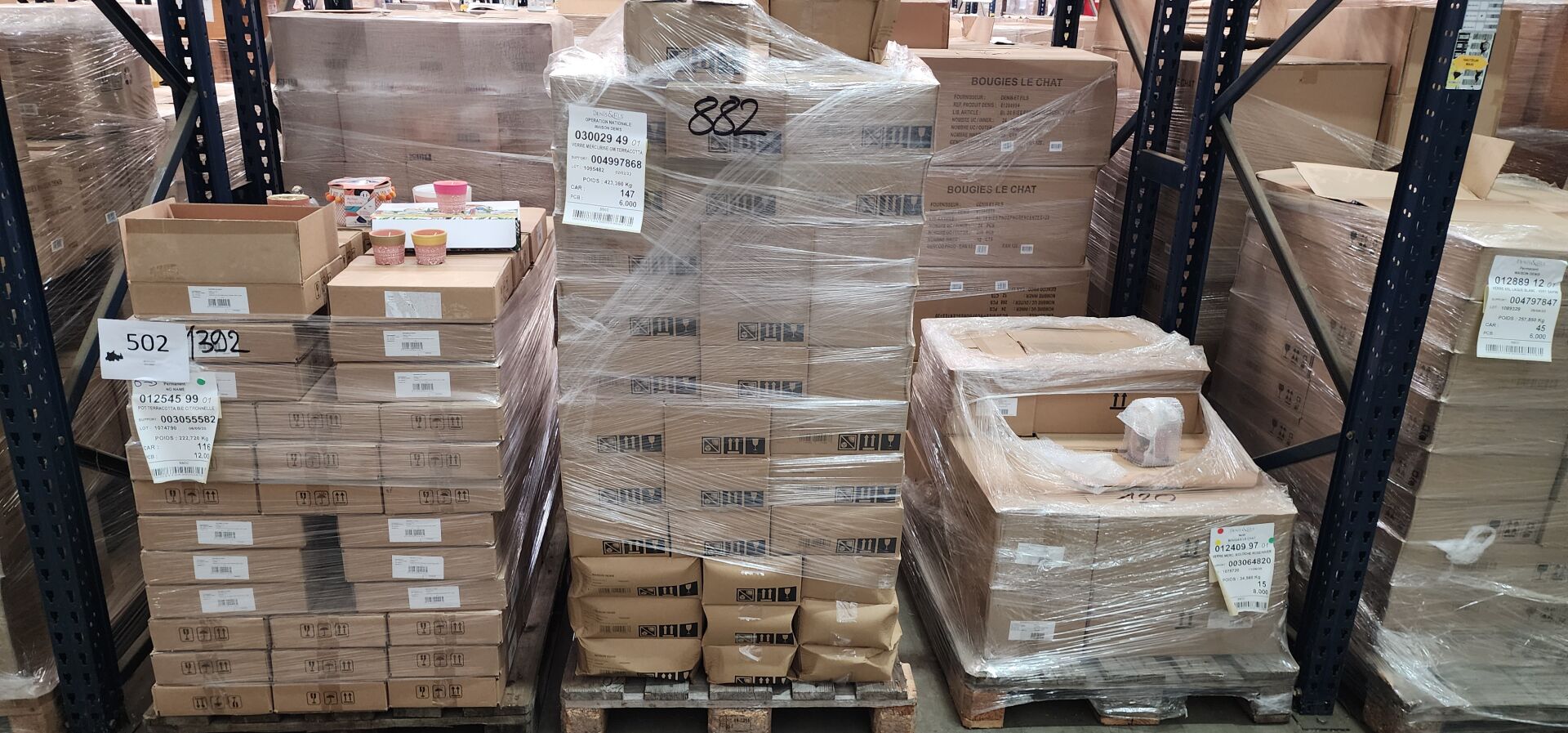 Dans l'allée G, sur 6 palettes un lot d'environ 7906 bougies, contenants et accessoires senteurs dont : environ 1392 bougies en forme de pot terracotta citronnelle, environ 882 bougies en verre mercurisé terracotta, environ 120 bougies en verre mercurisé sous cloche rose/hiver, environ 270 bougies en verre XXL laqué blanc, environ 342 bougies en pot de terre cuite sunset, environ 4900 packs de dix recharges totem jaune/citron. (frais de mise à disposition 30 € TTC)