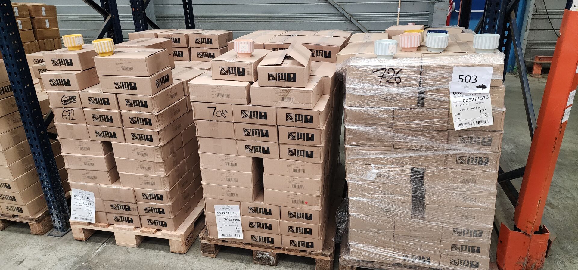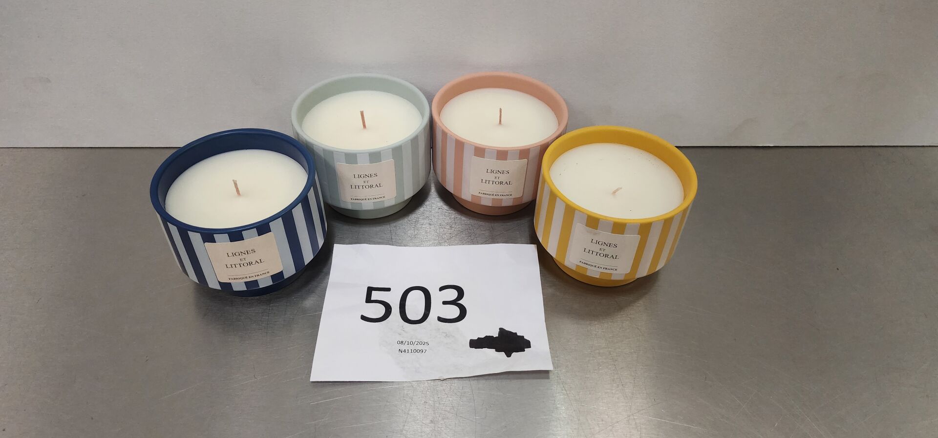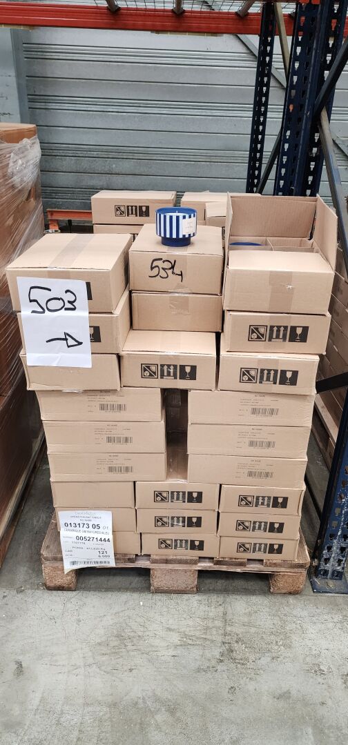 Dans l'allée G, sur 4 palettes un lot d'environ 2640 bougies dont : environ 726 bougies en céramique rayures vert d'eau, environ 708 bougies en céramique rayures rose, environ 672 bougies en céramique rayures jaune, environ 534 bougies en céramique rayures bleu (frais de mise à disposition 30 € TTC)