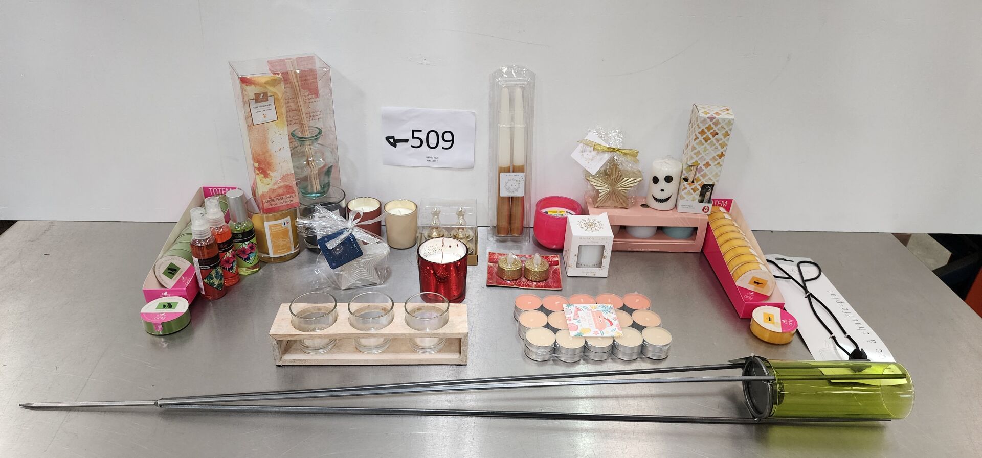 Dans l'allée H, sur 19 palettes un lot d'environ 9981 bougies (dont bougies de noel), contenants et accessoires senteurs dont : environ 550 set de trois luminaires supports manguier, environ 96 torches de jardin LE CHAT , environ 80 protections bougies en verre transparent vert ou jaune, environ 180 barquettes de quatre bougies vertes, environ 120 boites LE CHAT métal d'action répulsive à la citronnade, environ 270 bougies bijou vanille nuit divine, environ 120 bougies en verre parfumées fleurs de coton, environ 90 arbres parfum tulipe flamboyante, environ 80 packs de trente chauffe-plats degrade corail, environ 900 arbres parfum 35ML bois d'orient, environ 450 bougies en verre mercurisé motif rouge avec des étoiles, environ 1150 bougies en verre forme de bulles rose parfum citronnade, environ 80 bougies verre mercurisé ivoire, environ 45 bougies en verre mercurisé terracota, environ 240 bougies en forme d'étoile dorée, environ 75 coffrets de trois verres parfumés, environ 400 packs de deux bougies baroque blanc et or, environ 430 spray ambiance corail/lychee, environ 240 spray ambiance anis/zest de citron, environ 950 spray ambiance terracotta/pomme, environ 750 bougies en forme d'étoile argentée, environ 160 cartons de dix bougies recharges totem jaune/citron, environ 40 cartons de dix bougies recharge totem vert/pomme, environ 200 bougies en verre ocre/ambré, environ 30 barquettes de quatre bougies en forme de sapin couleur or, environ 210 coupelles en métal 10x10, environ 640 bougies cylindriques en forme de fantômes blancs, environ 860 packs de deux bougies, environ 45 pinces à chauffe plat. (frais de mise à disposition 30 € TTC)