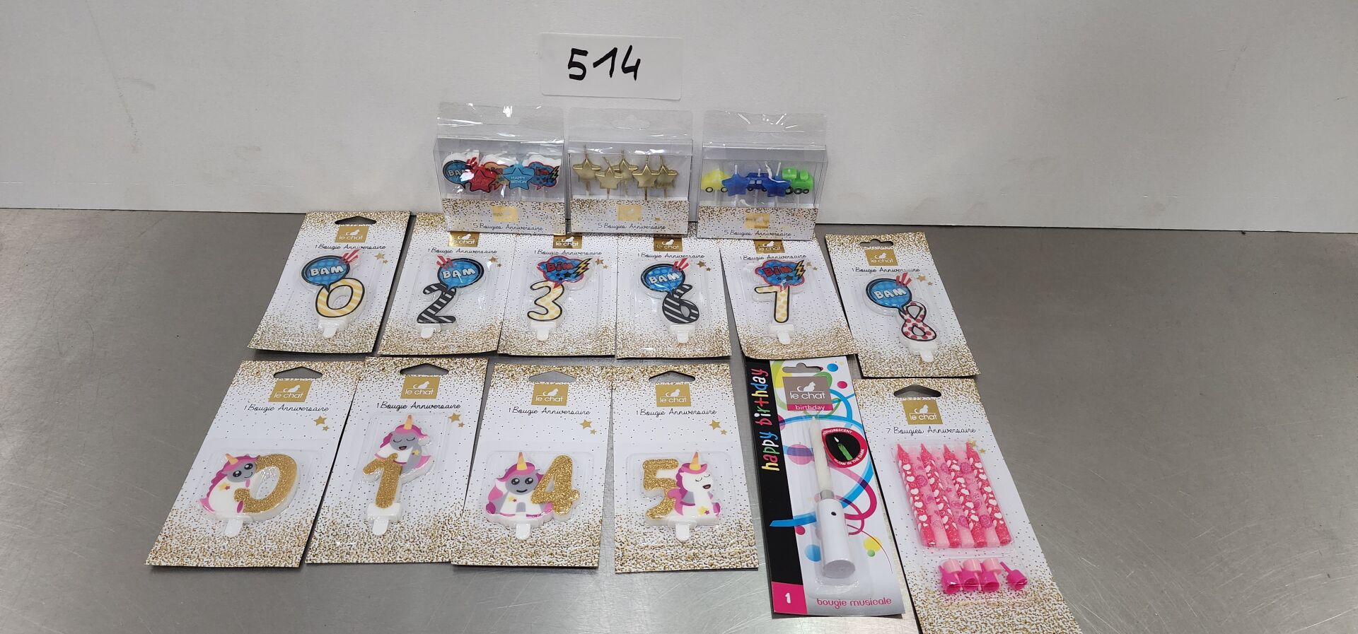 Dans l'allée I, sur 17 palettes un lot d'environ 36850 bougies, (essentiellement bougies d'anniversaire) contenants et accessoires senteurs dont : environ 3500 bougies LE CHAT nombre d'anniversaire comics N°7 , environ 3200 bougies LE CHAT nombre d'anniversaire licorne N°0, environ 600 bougies LE CHAT nombre d'anniversaire licorne N°5, environ 3000 bougies LE CHAT nombre d'anniversaire comics N°3, environ 2500 bougies LE CHAT nombre d'anniversaire comics N°2, environ 2500 bougies LE CHAT nombre d'anniversaire comics N°0, environ 2700 bougies LE CHAT nombre d'anniversaire comics N°8, environ 2600 bougies LE CHAT nombre d'anniversaire comics N°6, environ 2600 bougies LE CHAT nombre d'anniversaire licorne N°1, environ 2400 bougies LE CHAT nombre d'anniversaire licorne N°4, environ 2400 bougies musicales LECHAT phosphorescente, environ 1600 packs de cinq bougies voiture/étoile/locomotive, environ 850 packs de cinq bougies comics, environ 650 packs de sept bougies motif coeur paillettes, environ 660 packs de cinq bougies en forme d'étoile dorée, environ 1590 boites plaque "happy birthday", environ 3500 boites de cinq voitures course sur pic. (frais de mise à disposition 30 € TTC)