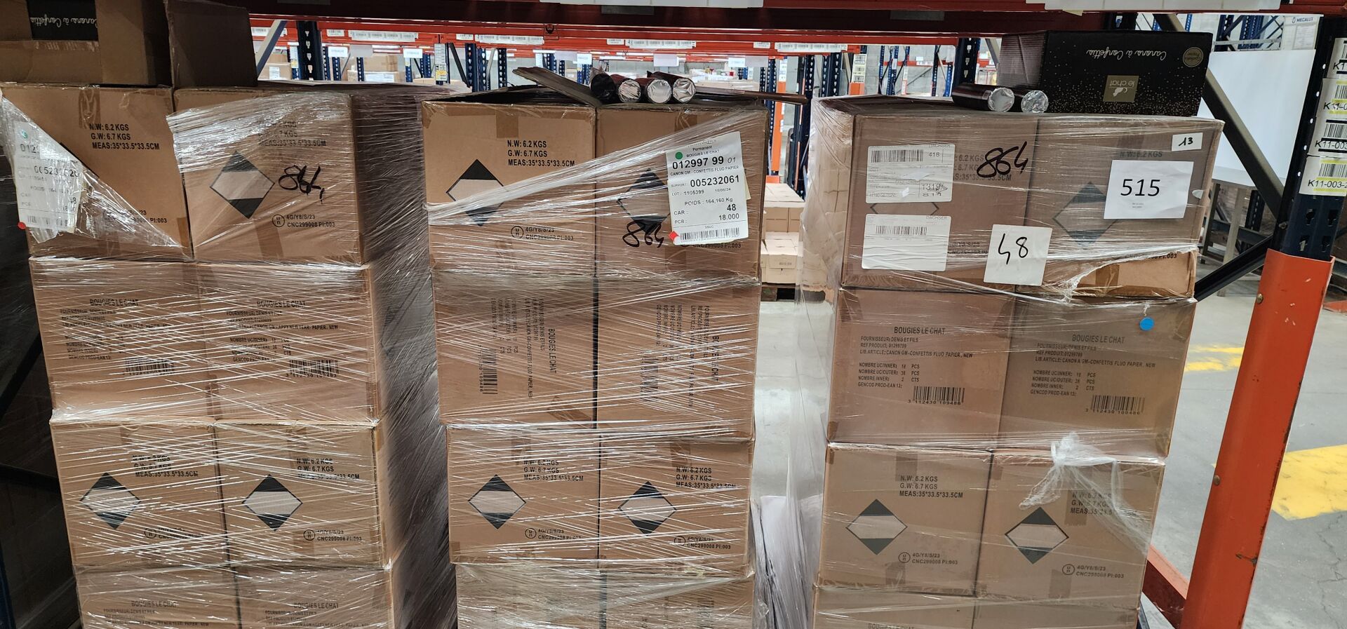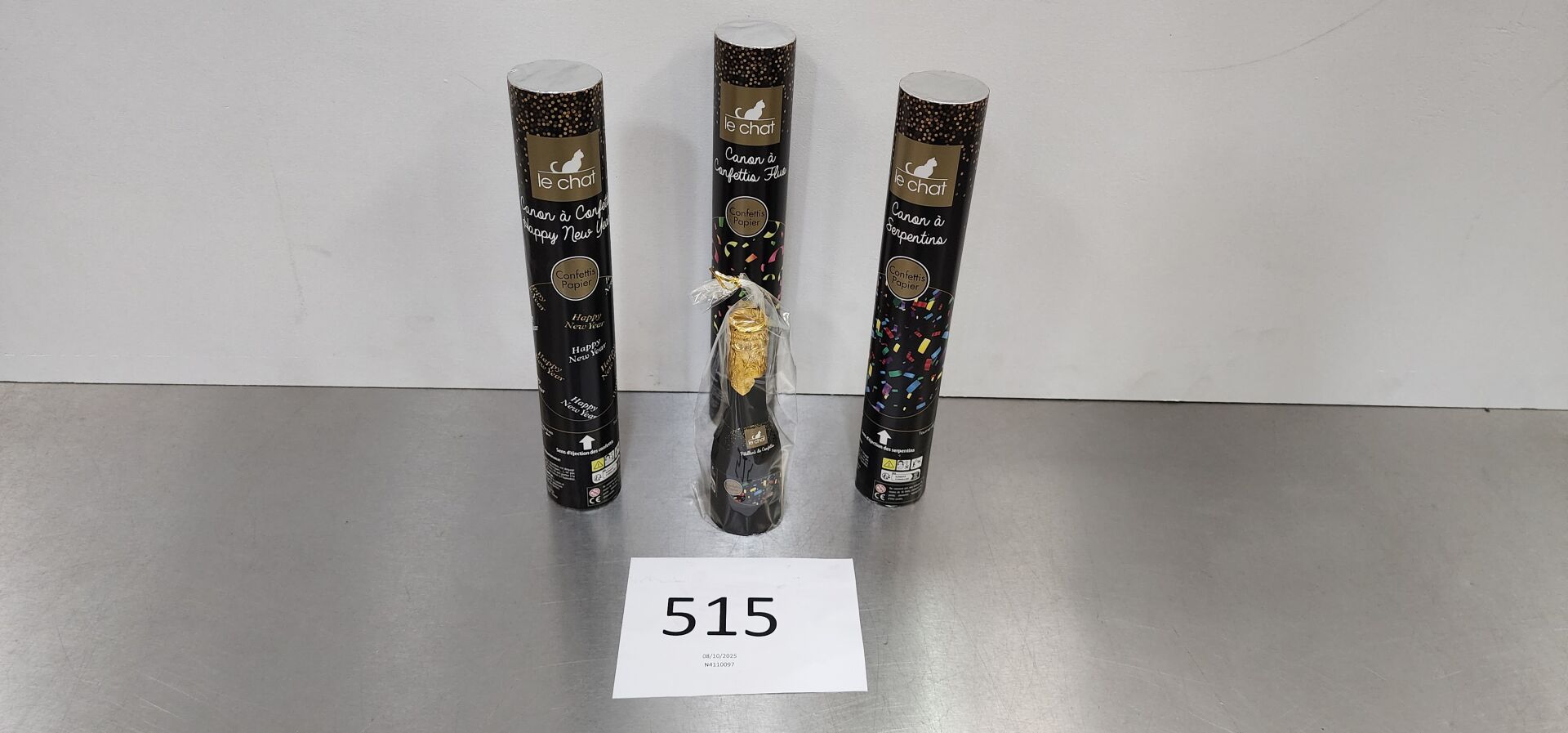 Dans l'allée I, sur 6 palettes un lot d'environ 5520 confettis et serpentins dont : deux palettes d'environ 1728 de confettis fluo papier, dont deux palettes d'environ 1728 confettis happy new year, environ 768 canon à serpentins papier, environ 1296 pétillants confettis en papier en forme de bouteilles. (frais de mise à disposition 30 € TTC)