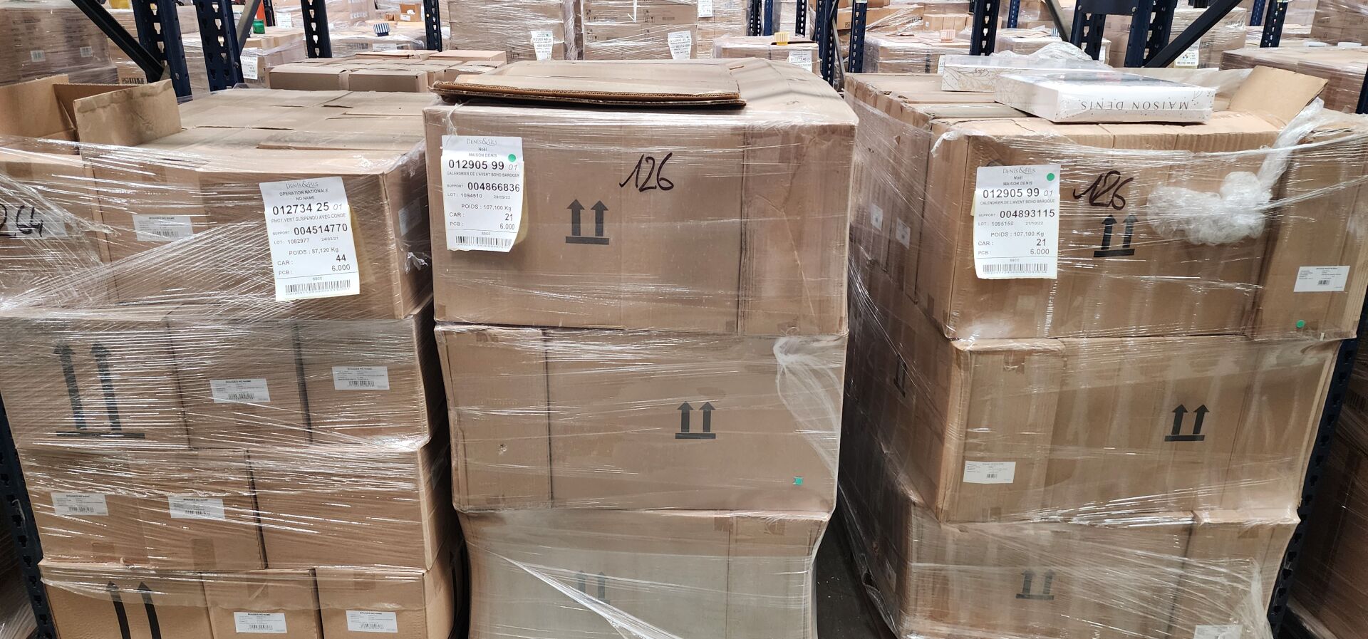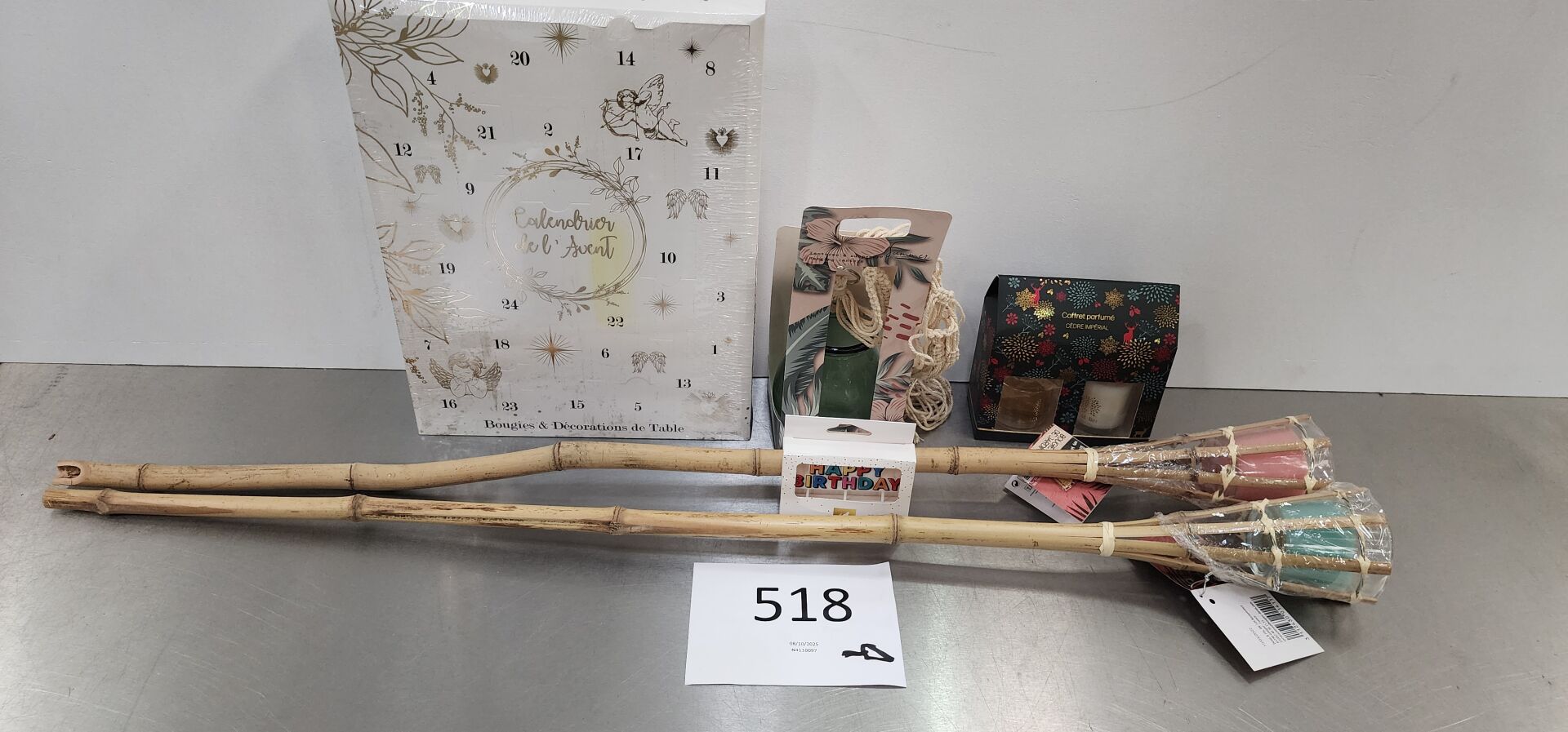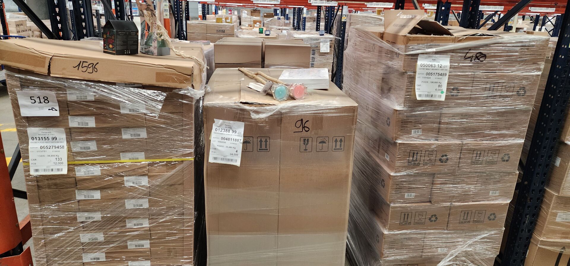 Dans l'allée F, sur 6 palettes un lot d'environ 2688 bougies, contenants et accessoires senteurs dont : environ 1596 boîtes de bougies plaque "happy birthday", environ 96 torches bambou bougies en verre citronnelle colorées, environ 480 coffrets bougies et diffuseurs minuit enchanté, environ 264 photophores vert suspendu avec corde, dont deux palettes d'environ 252 calendriers de l'avent boho baroque. (frais de mise à disposition 30 € TTC)