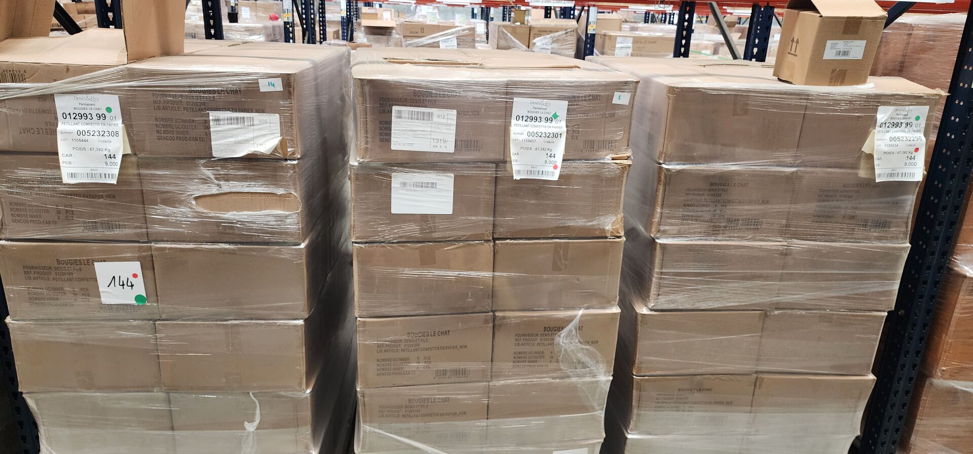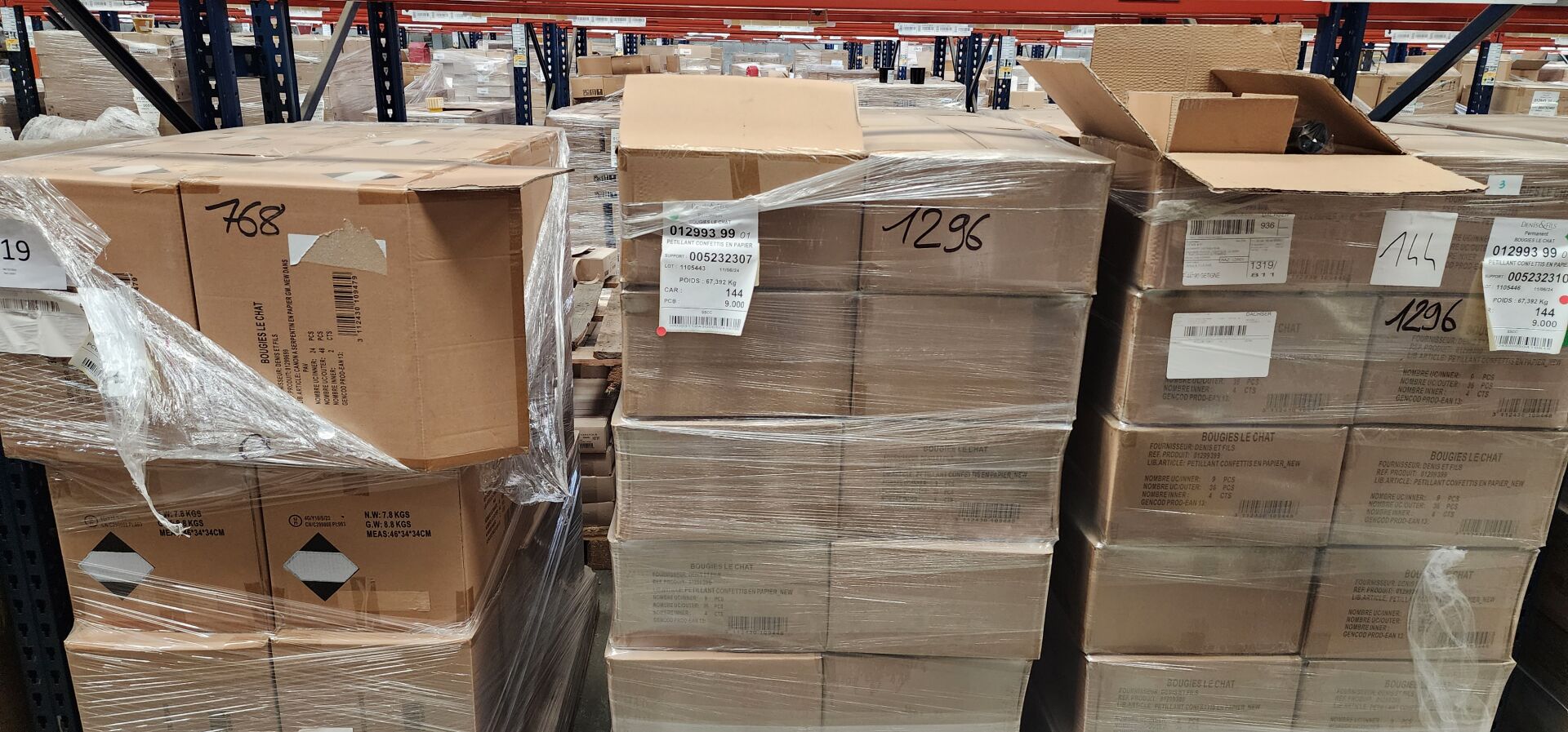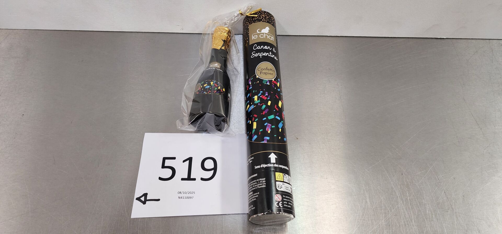 Dans l'allée F, sur 6 palettes un lot d'environ 7248 confettis et serpentins dont : environ 768 canons à serpentins, dont cinq palettes d'environ 6480 pétillants confettis papier en forme de bouteille. (frais de mise à disposition 30 € TTC)