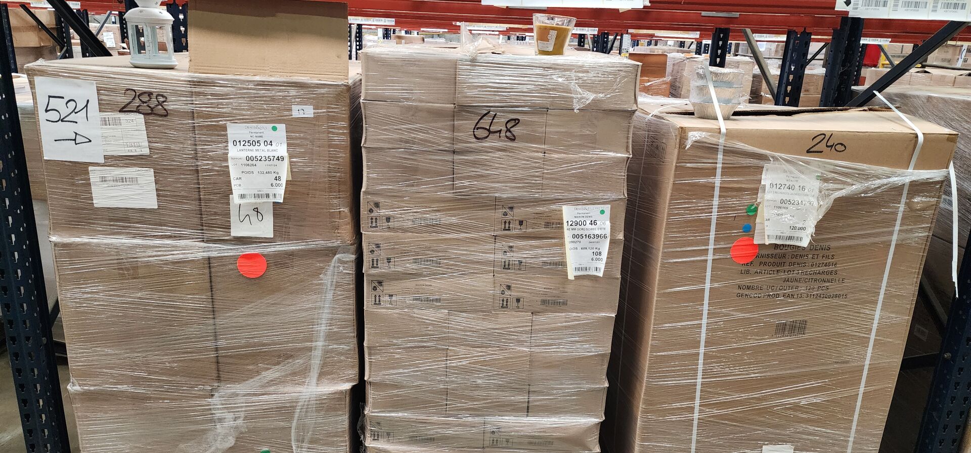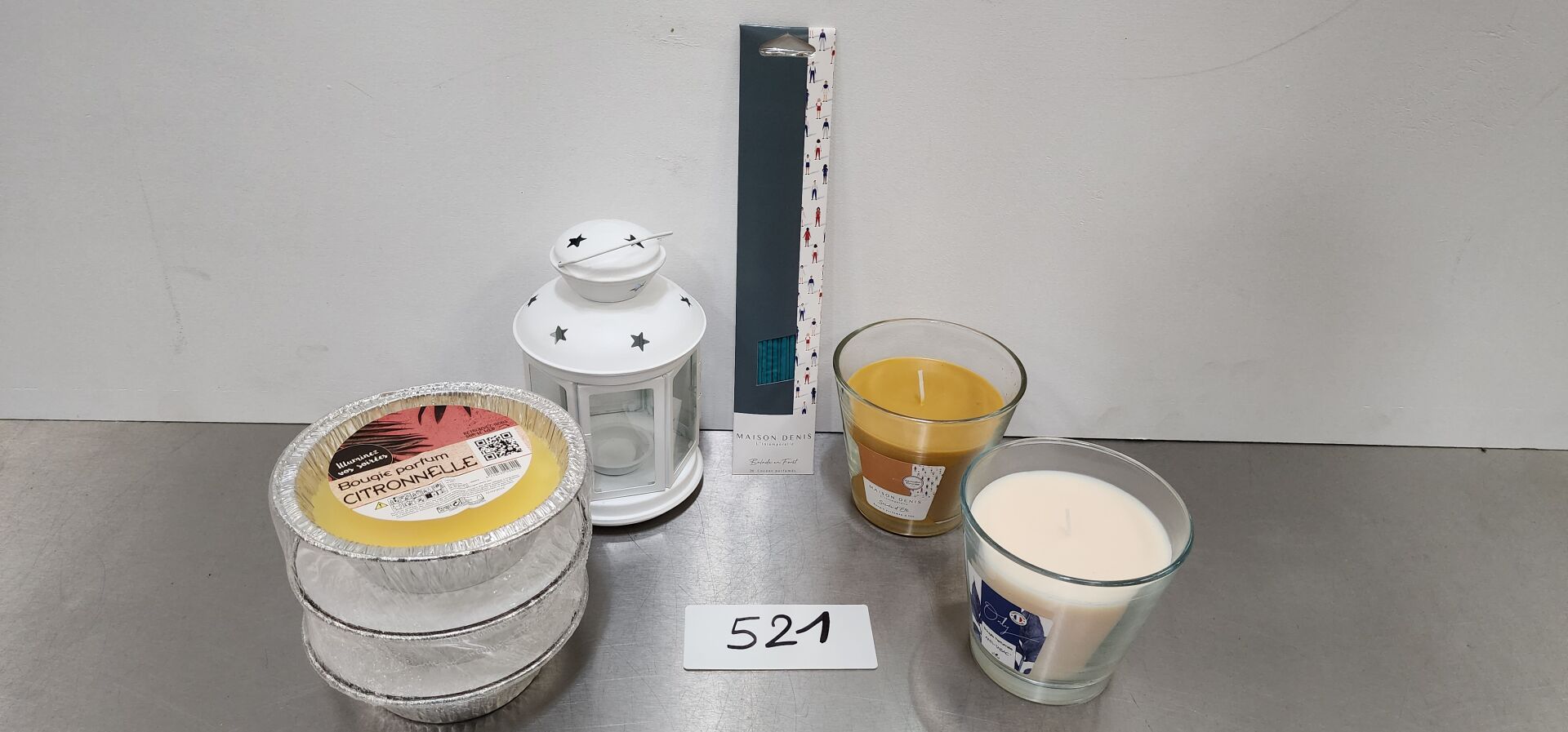 Dans l'allée F, sur 6 palettes un lot de bougies, contenants et accessoires senteurs dont (environ 5680 articles) : environ 288 lanternes métal blanc, environ 648 bougies en verre ocre/soirée d'été, environ 240 recharges jaune/citronnelle, environ 288 lanternes métal blanc, environ 384 bougies en verre anti-tabac, environ 3840 packs de vingt bâtonnets d'encens vert sapin. (frais de mise à disposition 30 € TTC)