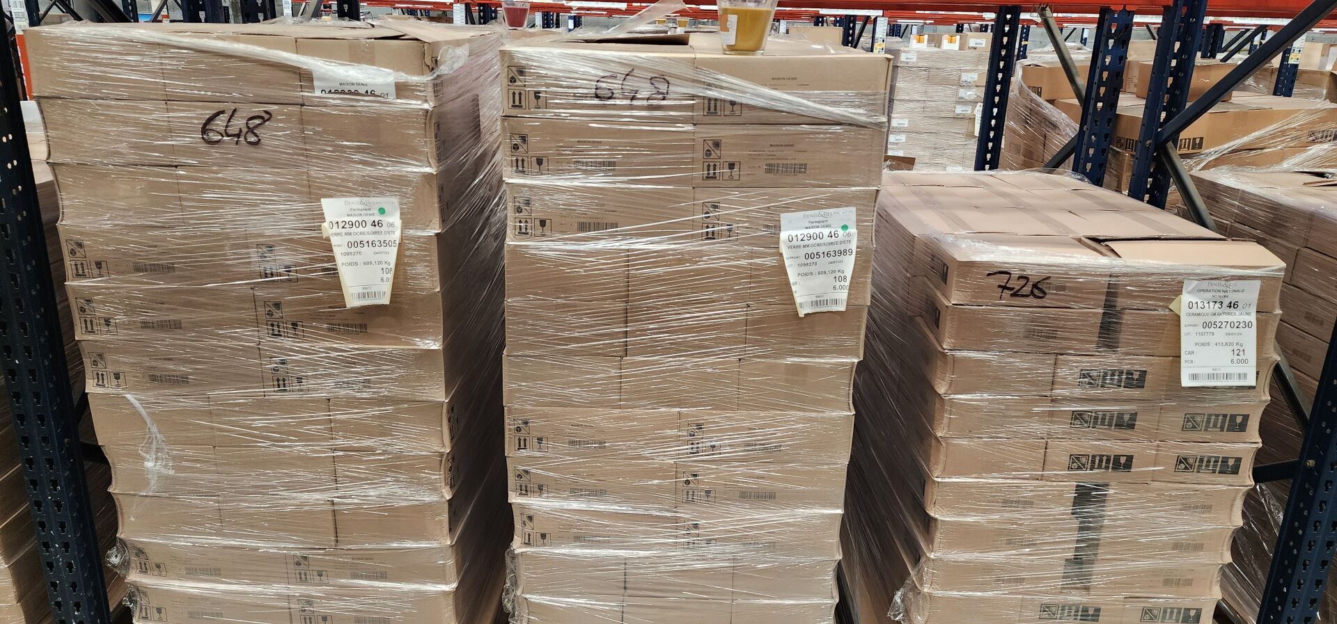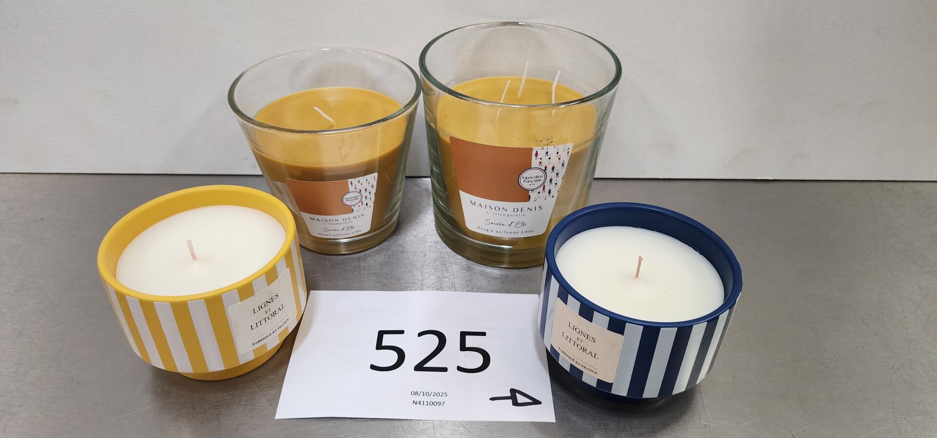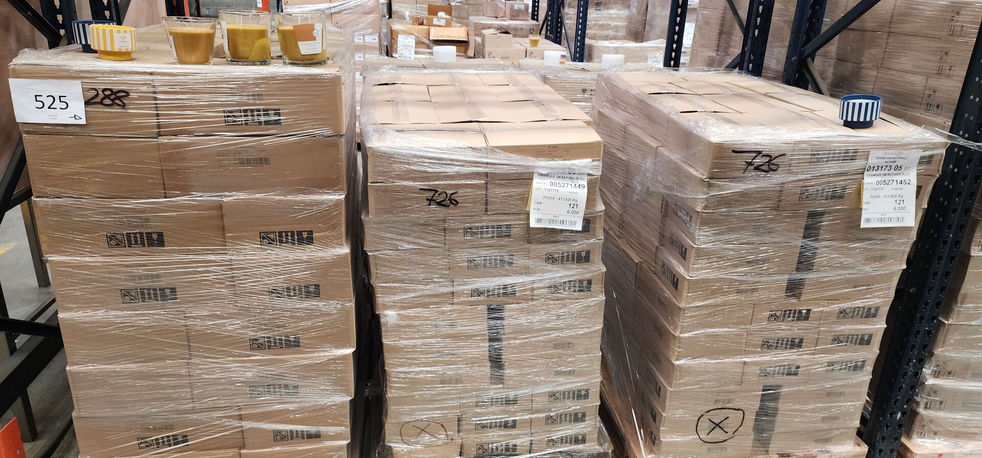 Dans l'allée E, sur 6 palettes un lot d'environ 3762 bougies dont : environ 288 bougies en verre XXL ocre/soirée d'été, dont environ 726 bougies en céramique rayures bleu, dont deux palettes d'environ 1296 bougies en verre évasé ocre/soirée d'été, environ 726 bougies en céramique rayures jaune. (frais de mise à disposition 30 € TTC)