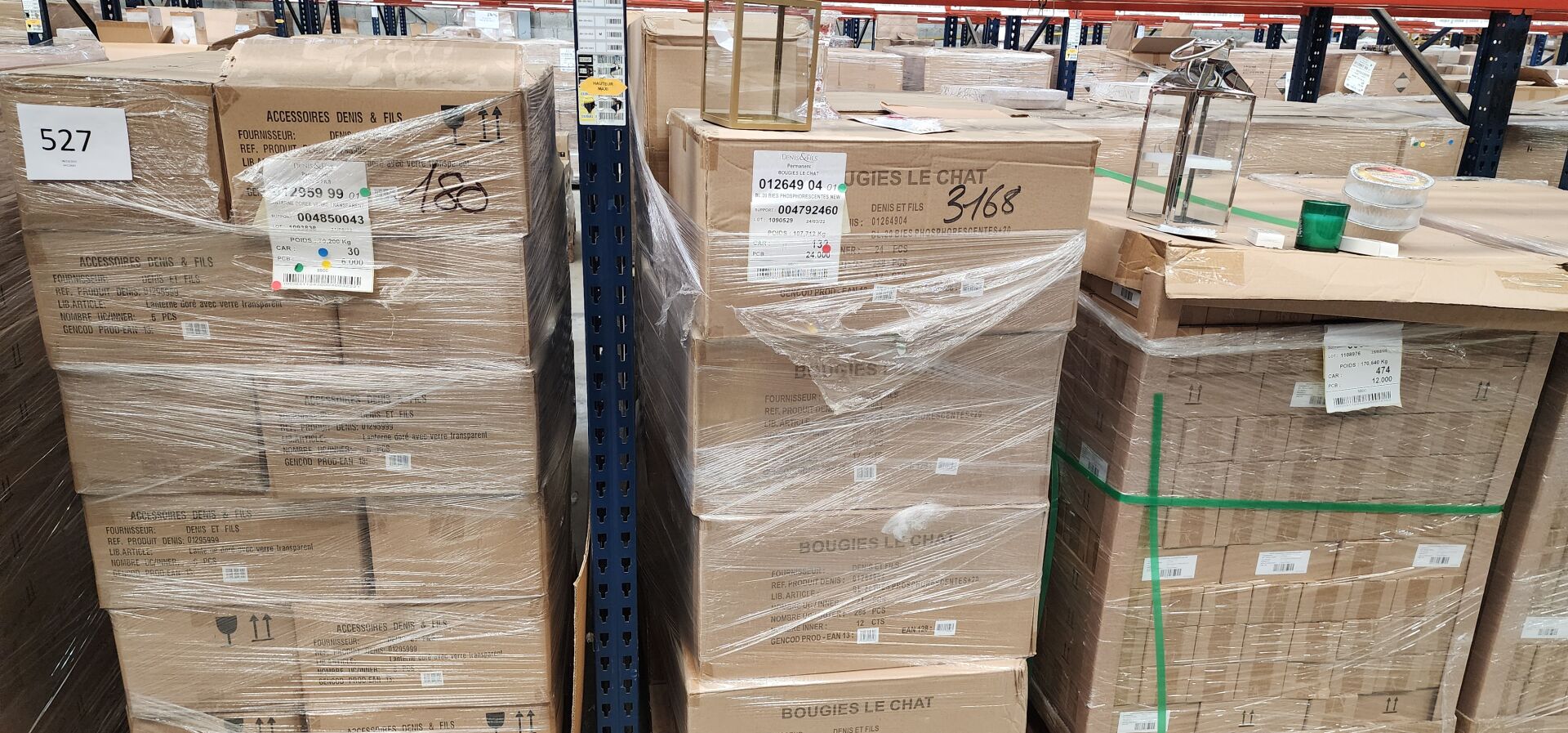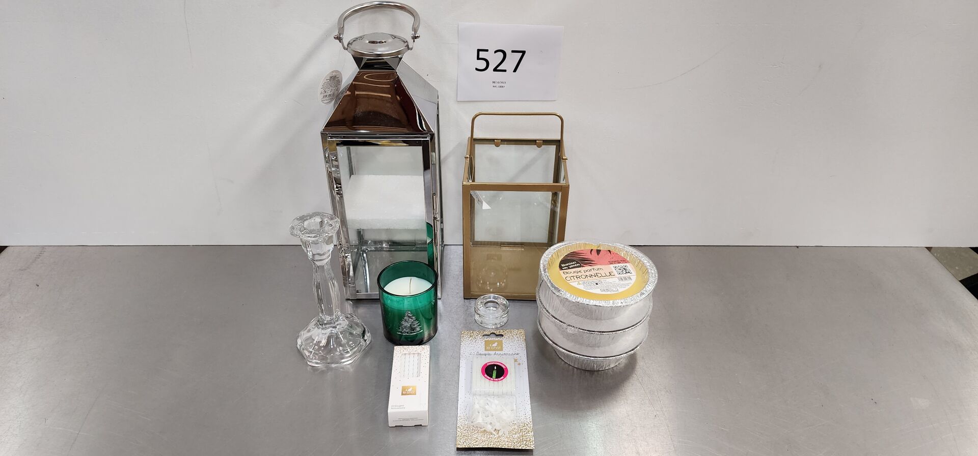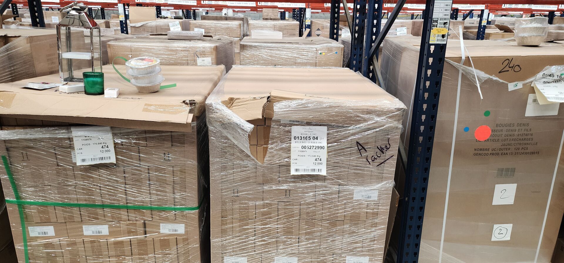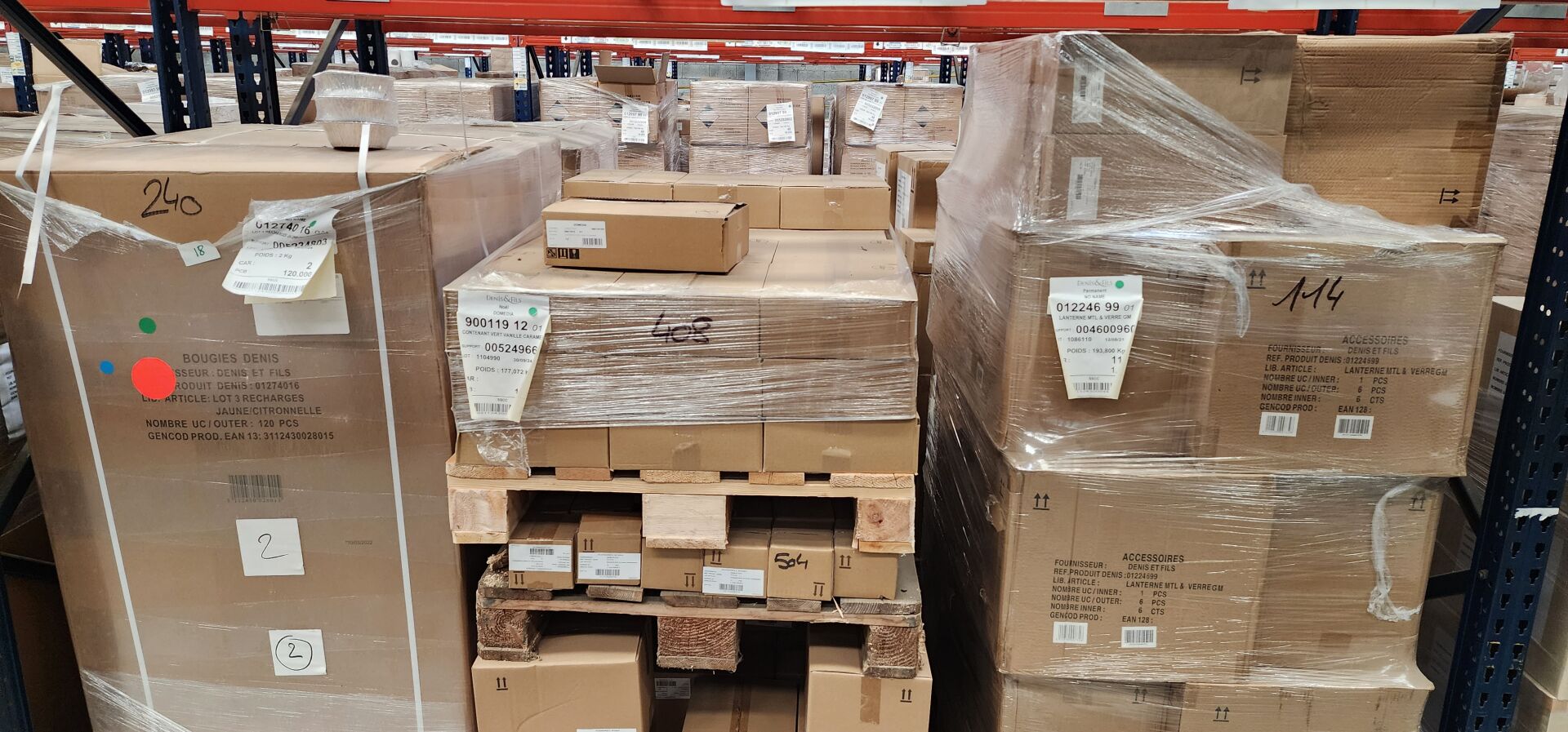 Dans l'allée E, sur 9 palettes un lot d'environ 16130 bougies, contenants et accessoires senteurs dont : environ 180 lanternes dorées en verre transparent, environ 3168 boîtes de vingt bougies anniversaire phosphorescentes, dont deux palettes d'environ 11376 boites de vingt bougies anniversaire torsadées blanches, environ 240 recharges jaune/citronnelle, environ 408 bougies contenant vert vanille caramel, environ 504 bougeoirs rond en verre transparent, environ 120 bougeoirs en verre pour flambeau environ 114 lanternes gris métallique en verre. (frais de mise à disposition 30 € TTC)