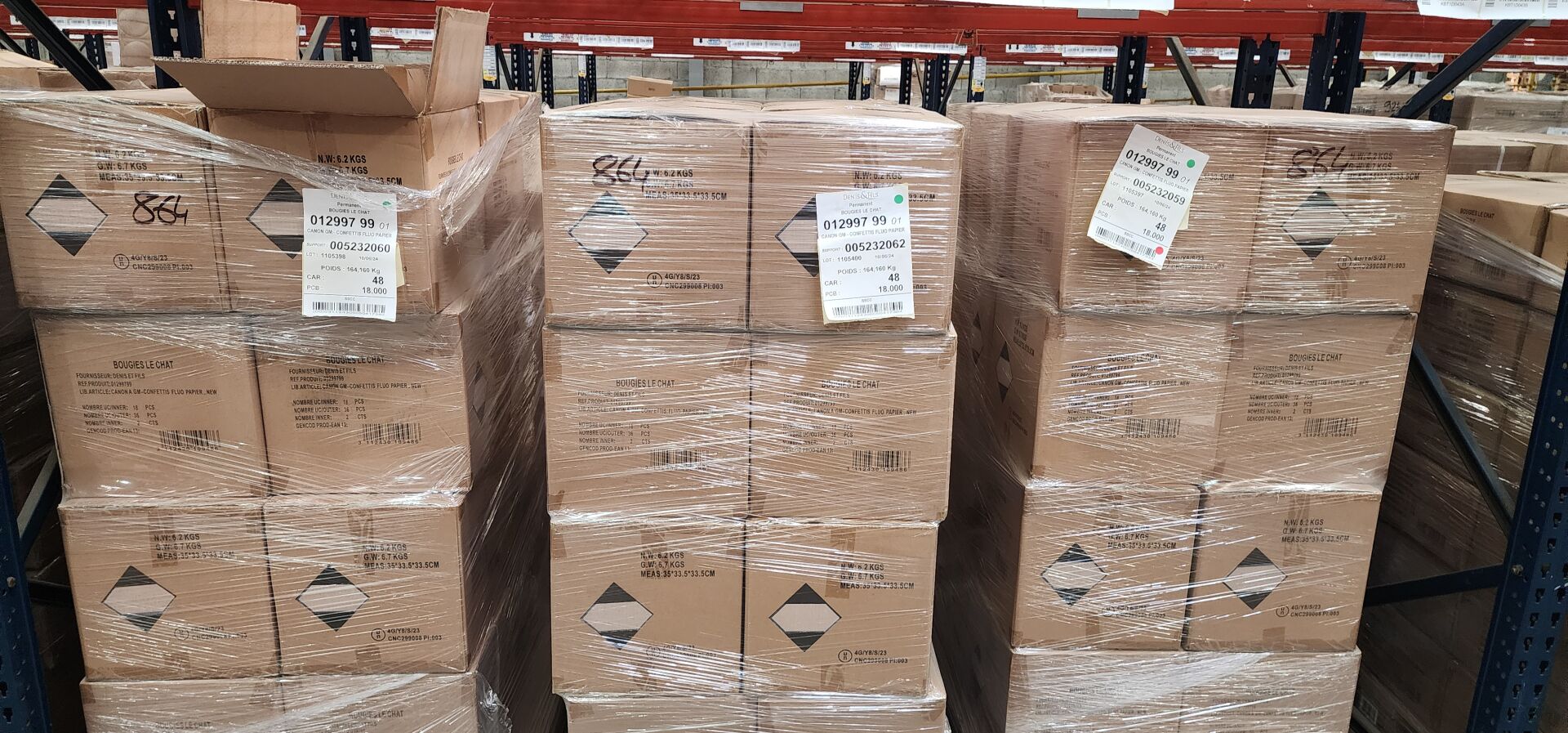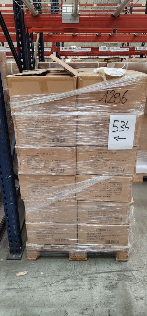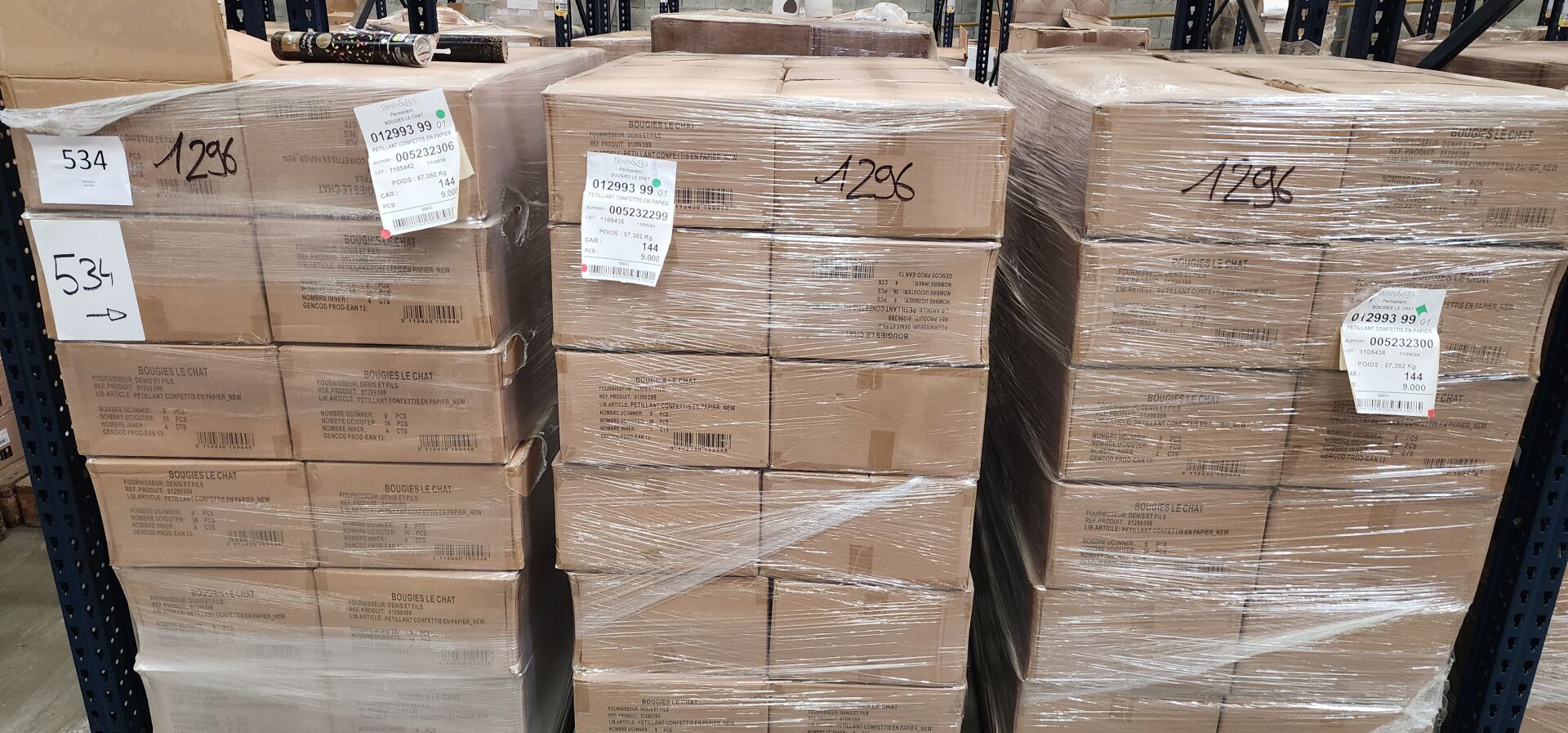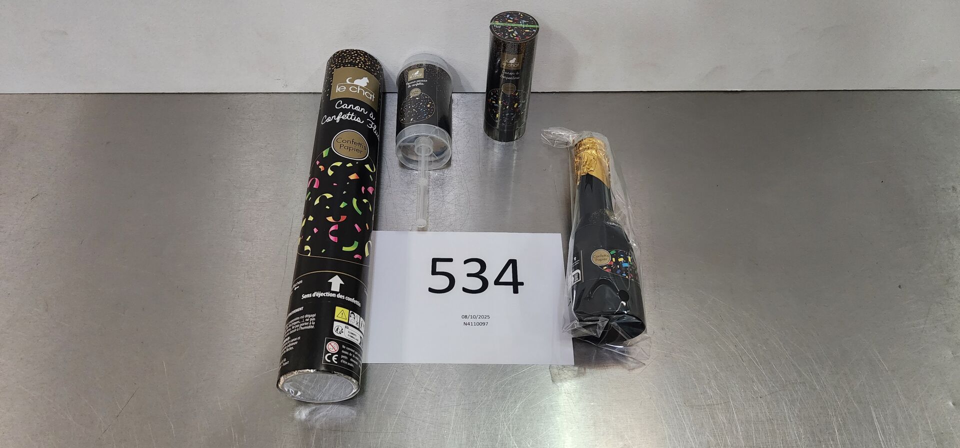 Dans l'allée D , sur 7 palettes un lot d'environ 7776 confettis dont : trois palettes d'environ 3888 pétillants confettis papier en forme de bouteilles, deux palettes d'environ 2592 canons à confettis fluo papier, environ 1296 pousse-pousses confettis papier. (frais de mise à disposition 30 € TTC)