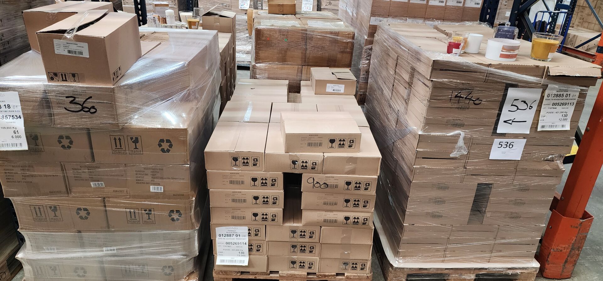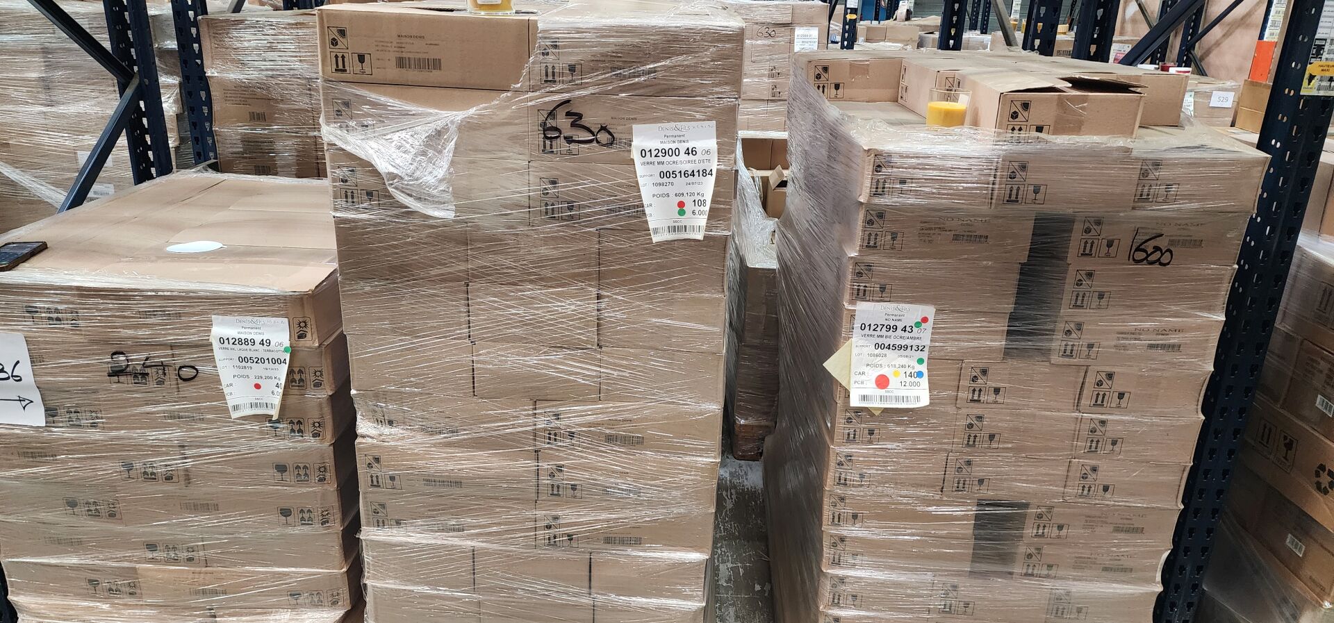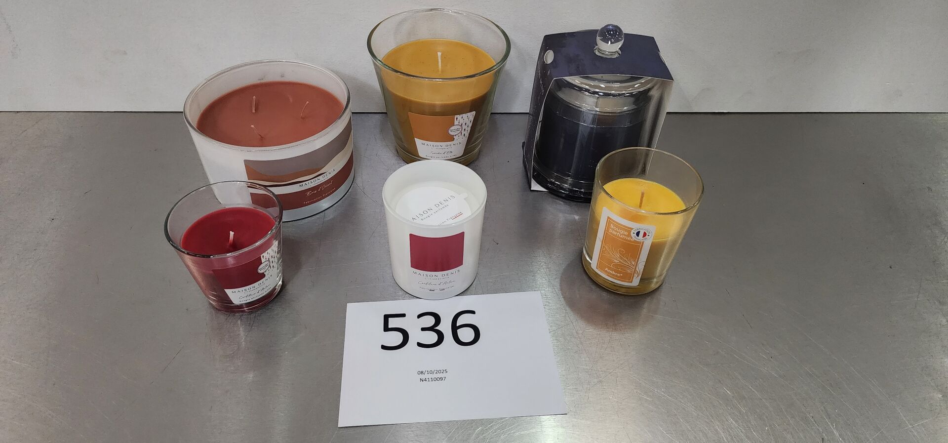 Dans l'allée D , sur 6 palettes un lot d'environ 5170 bougies : environ 1440 bougies en verre rouge/confiture d'antan, environ 900 bougies en verre laqué blanc, environ 360 bougies en verre sous cloche contemporain bleu, environ 1600 bougies en verre ocre/ambre, environ 630 bougies en verre ocre/soirée d'été, environ 240 bougies en verre XXL laqué blanc. (frais de mise à disposition 30 € TTC)