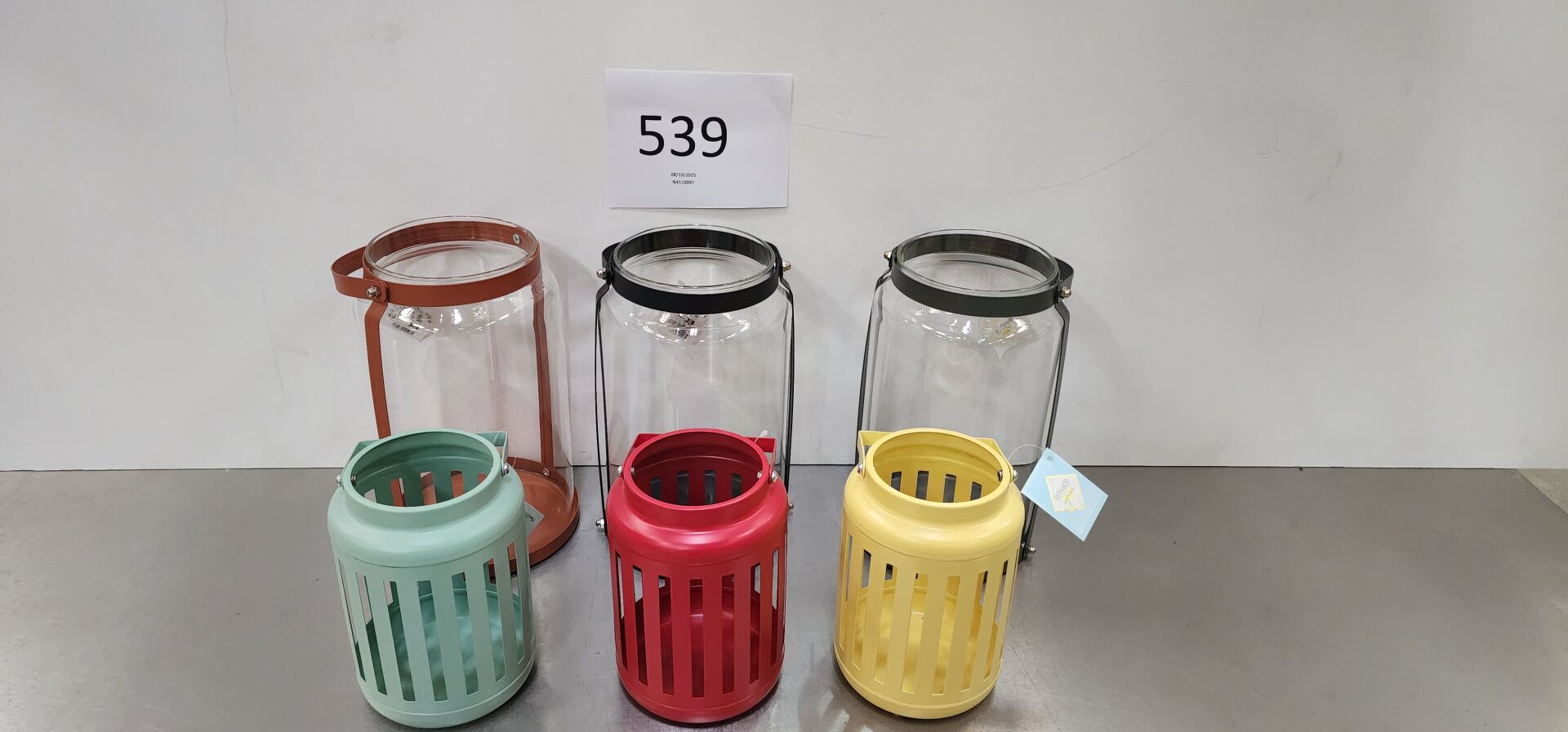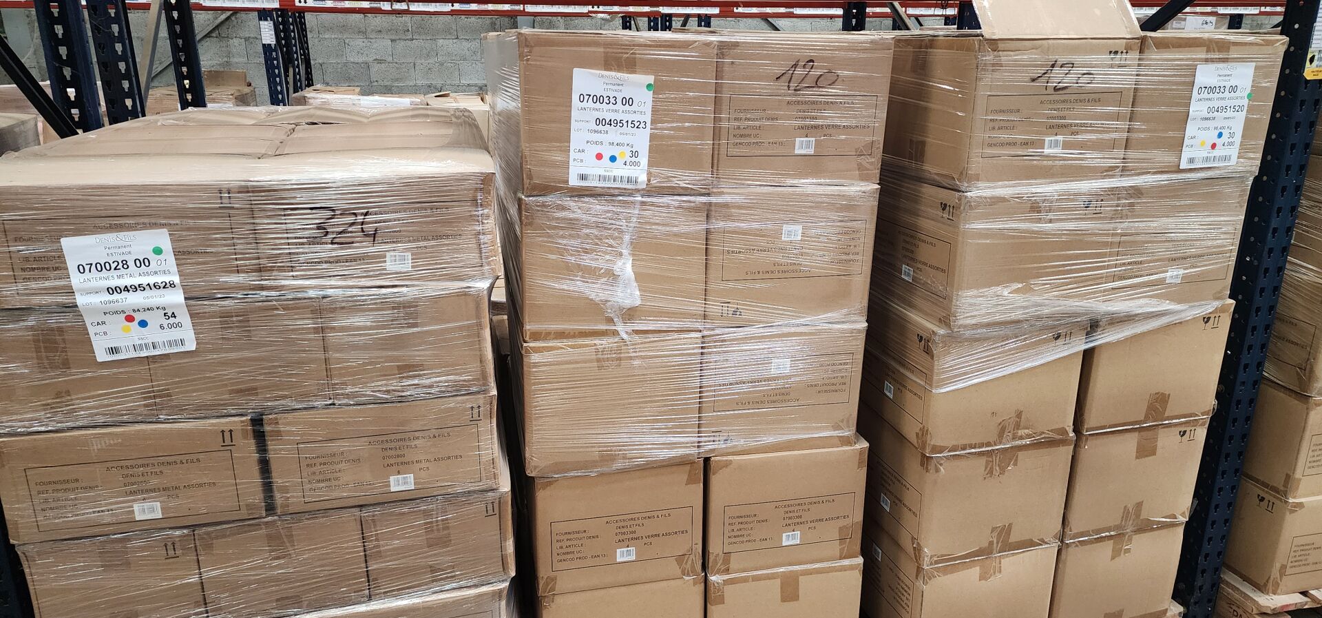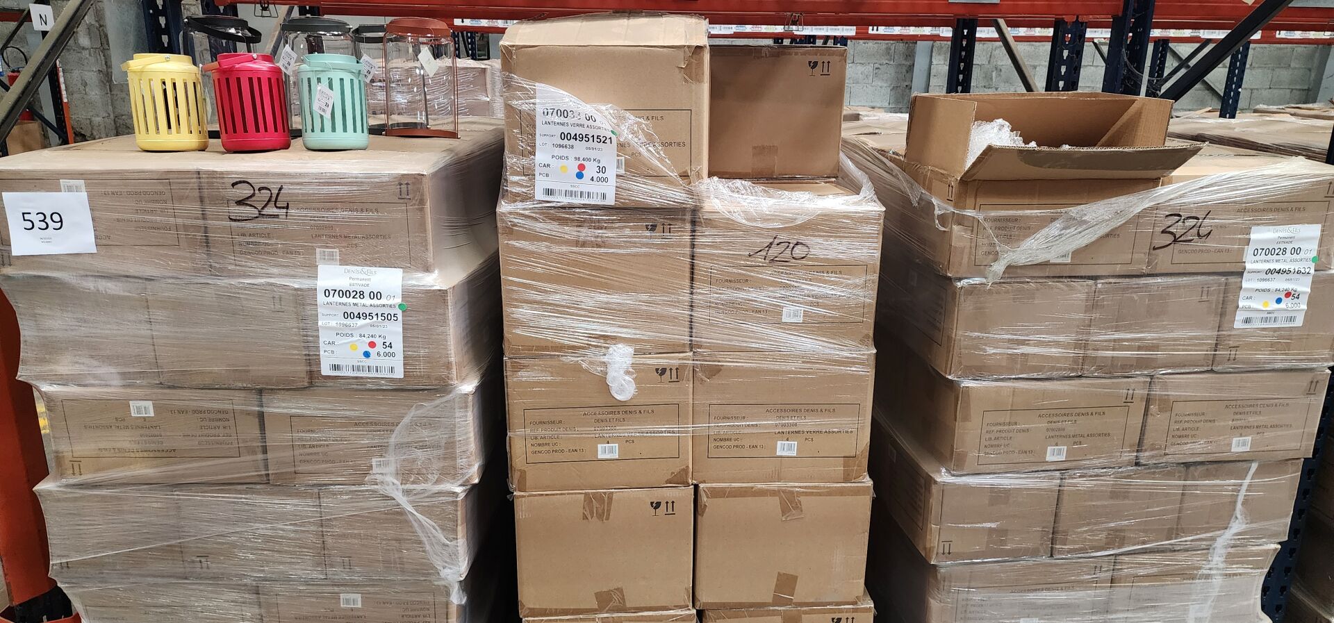 Dans l'allée C, sur 6 palettes un lot d'environ 1332 lanternes dont : trois palettes d'environ 972 lanternes en métal assorties jaune/vert/rouge, trois palettes d'environ 360 lanternes en verre assorties marron/noir/gris/gris (frais de mise à disposition 30 € TTC)
