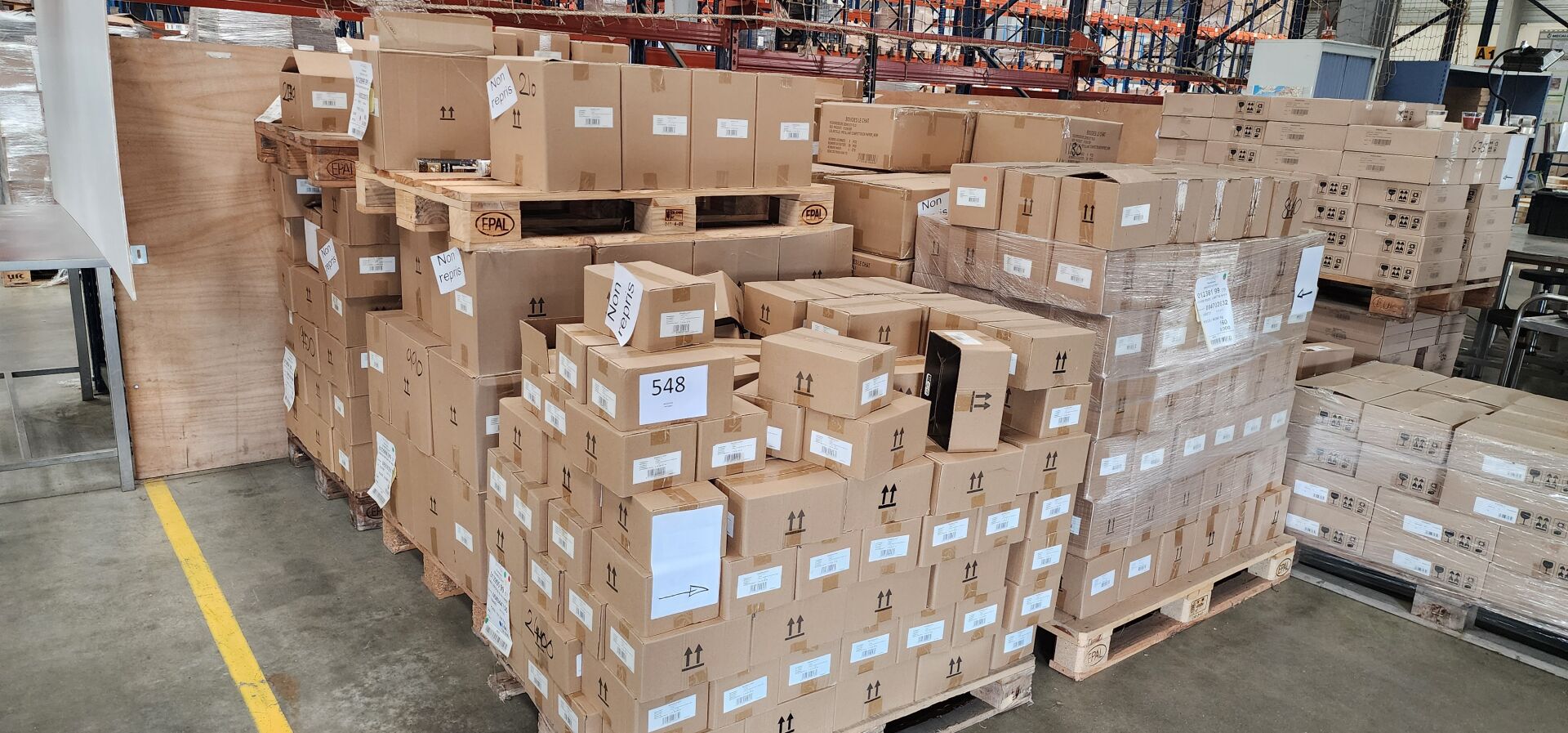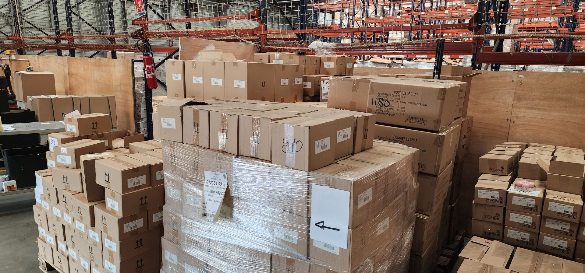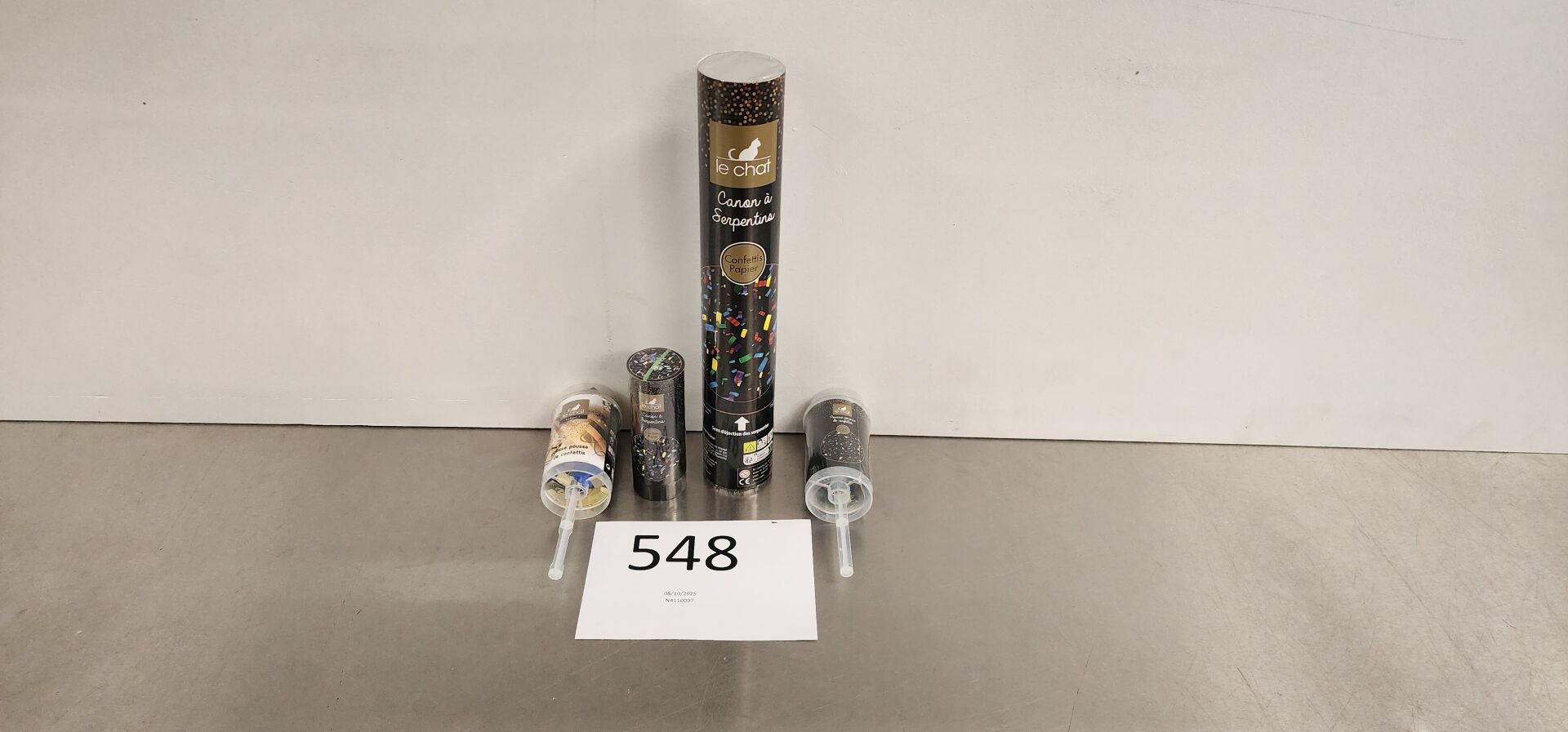 Sur 8 palettes un lot d'environ 9240 confettis, serpentins et lance-pétales de roses dont : environ 279 pousse-pousses confettis papier, environ 1900 lance-pétales de roses en papier, environ 2400 canons à serpentins H110 papier, environ 1431 pousse-pousses confettis papier, environ 210 canons à serpentins H300, environ 990 canons Happy New Year, environ 1180 pétillants confettis papier en forme de bouteille, environ 850 canons à confettis en papier (frais de mise à disposition 30 € TTC)