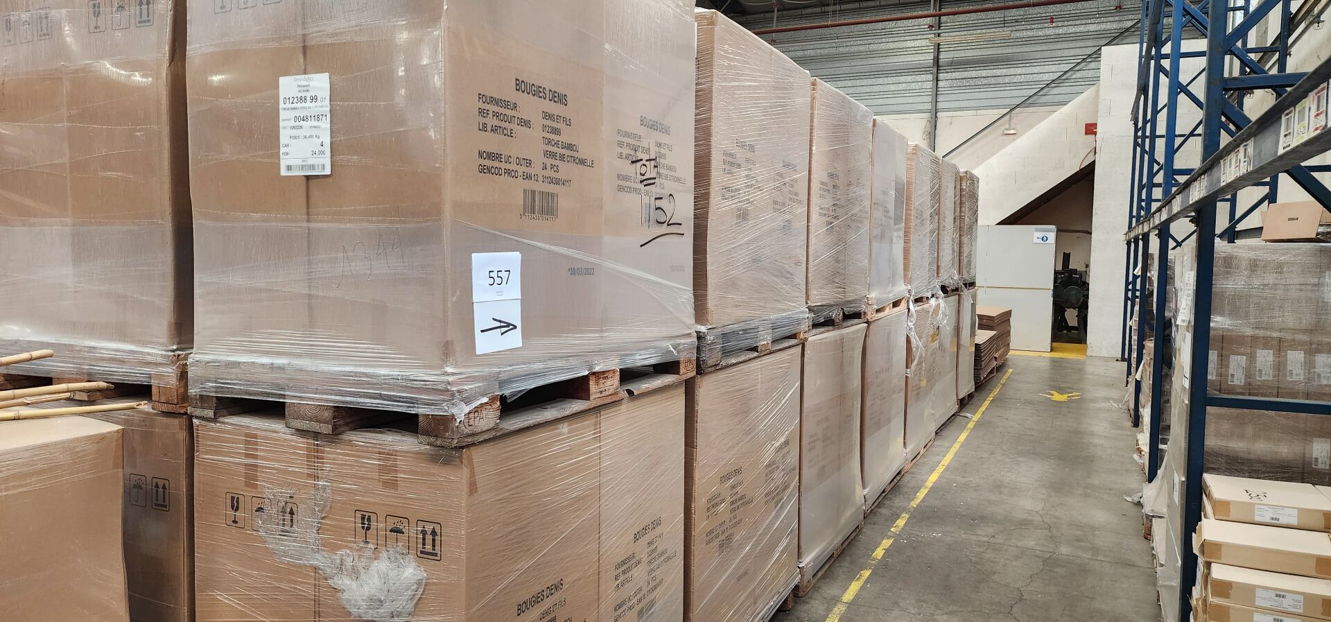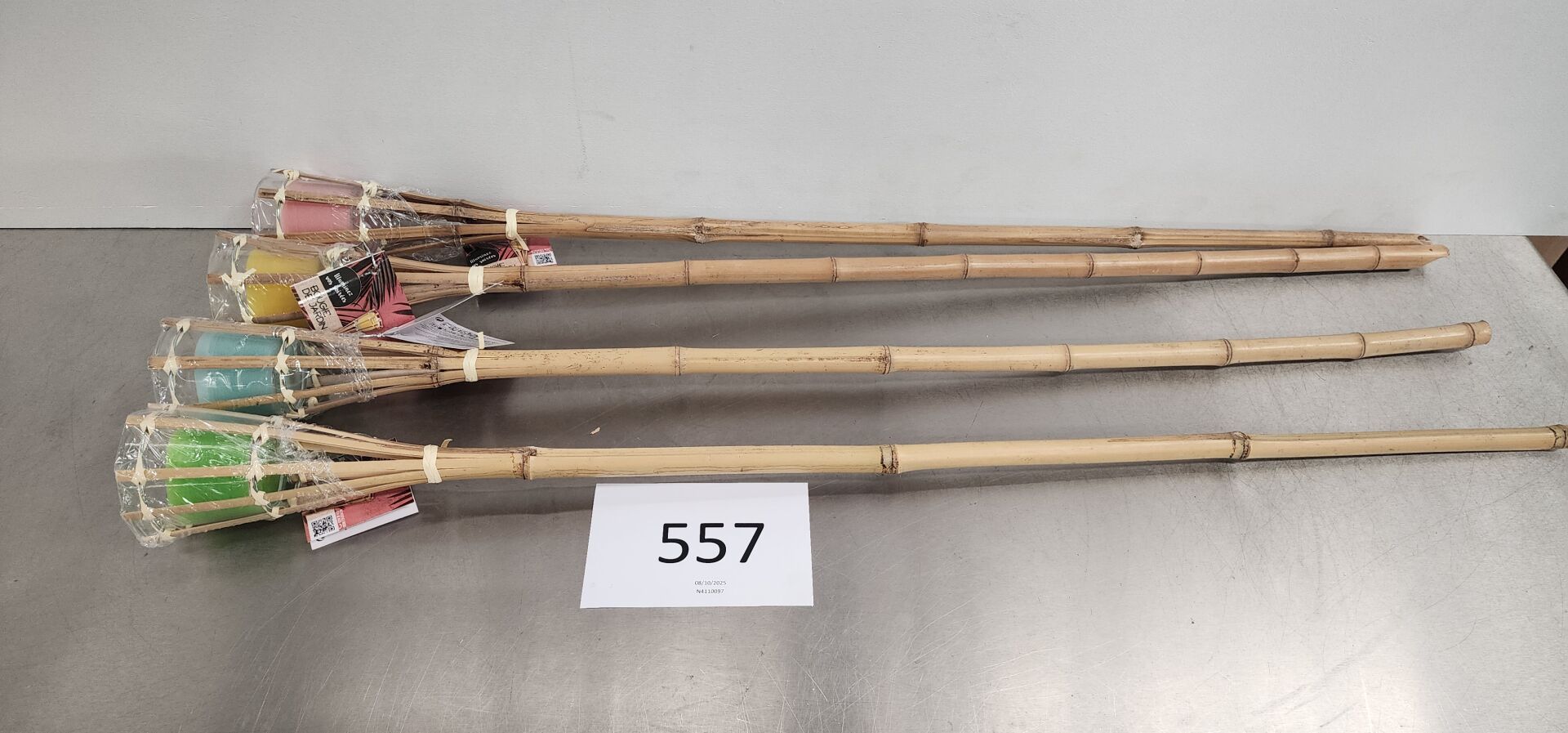 Sur 14 palettes un lot d'environ 1152 torches bambou bougies en verre coloré vert pomme/bleu turquoise/jaune citron/rose pastel. (frais de mise à disposition 30 € TTC)