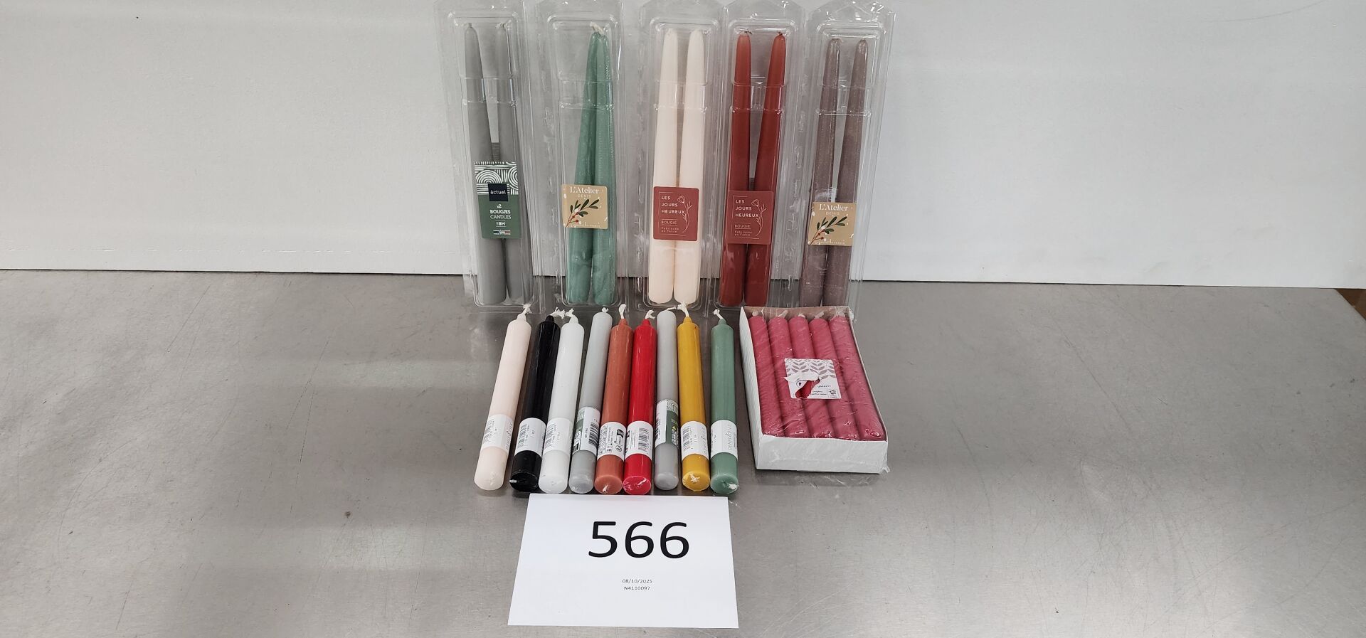 Dans l'allée J15, sur 18 palettes un lot d'environ 24464 bougies dont : environ 480 bougies 21H200 noires, environ 864 bougies 21H200 bleues, environ 2400 bougies 21H200 roses, environ 1248 bougies 21H200 vertes, environ 1560 bougies 21H200 vert sapin, environ 672 bougies 21H200 rouges, environ 804 bougies 21H200 Terracotta, environ 1308 bougies 21H200 ocres, environ 812 sets de deux flambeaux eucalyptus pailleté, environ 588 sets de deux flambeaux Terracotta, environ 624 sets de deux flambeaux lin pailleté, environ 204 sets de deux flambeaux ivoire, environ 738 cartons de dix bougies fourreau rouge, environ 2496 sets de deux flambeaux gris, environ 3700 bougies 21H200 gris, environ 6068 bougies 21H200 blanches. (frais de mise à disposition 30 € TTC)