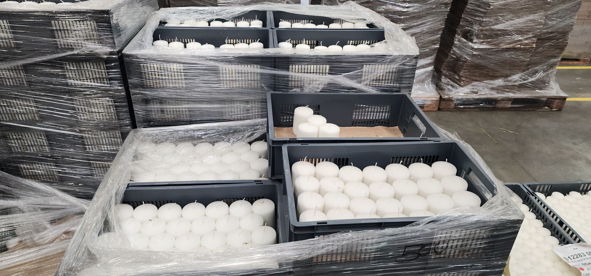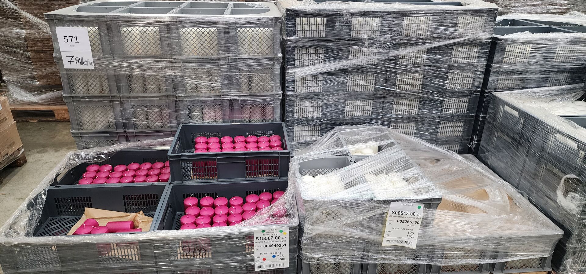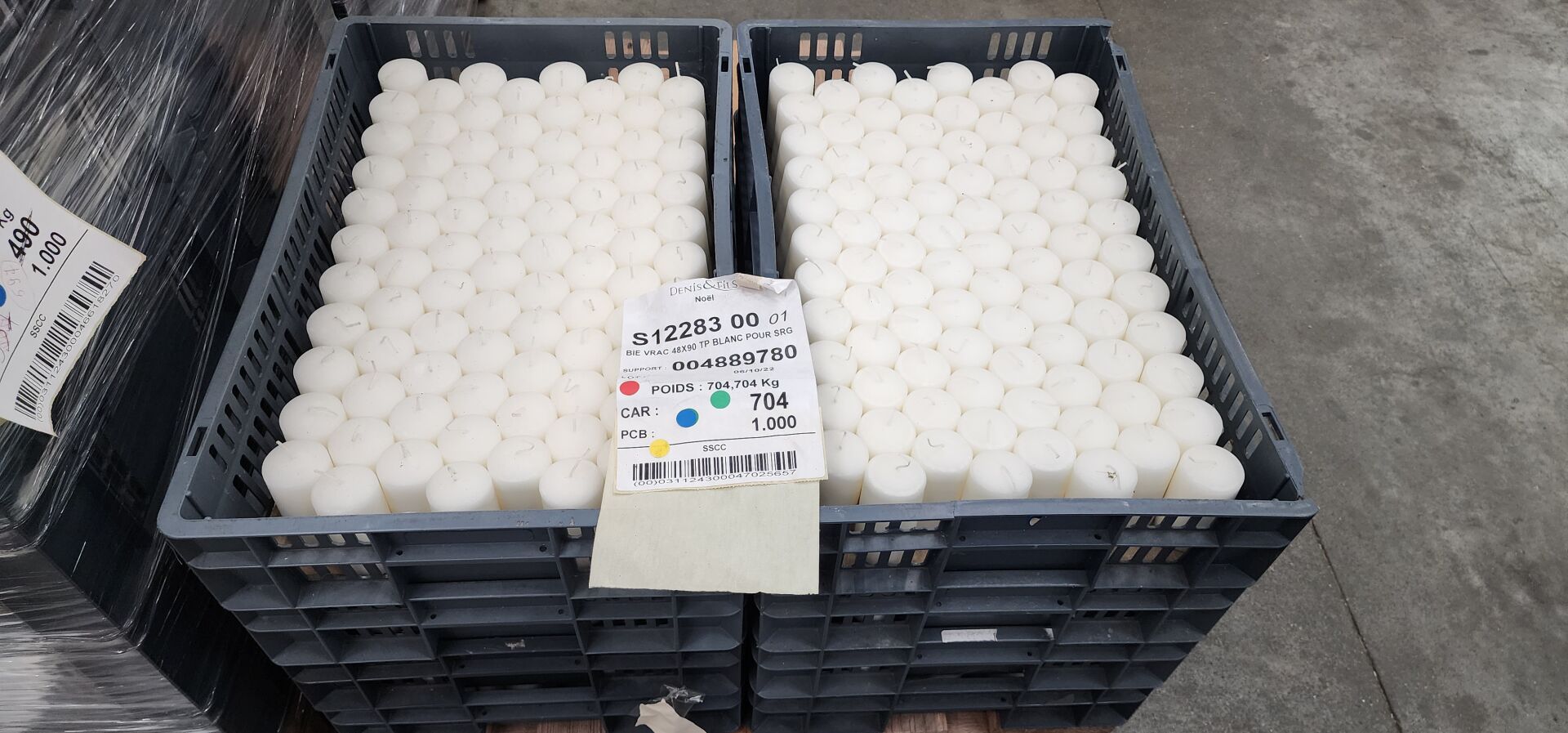 Sur 7 palettes un lot d'environ 2500 bougies dans des bacs dont : 200 bougies 68/115TP Prune/grenade, environ 100 bougies 68X145 blanc pour or, environ 500 bougies 48X90 blanc pour srg, environ 600 bougies 68/110TP blanc, environ 700 bougies 78X110 blanc/or sélectif, environ 400 bougies 68X145 blanc pour or. (frais de mise à disposition 30 € TTC)