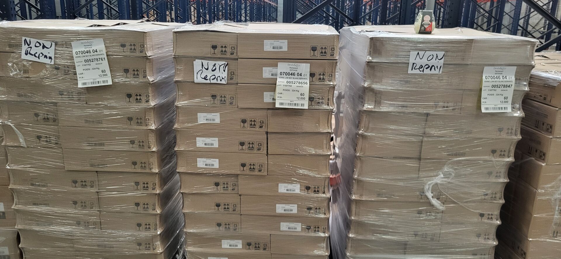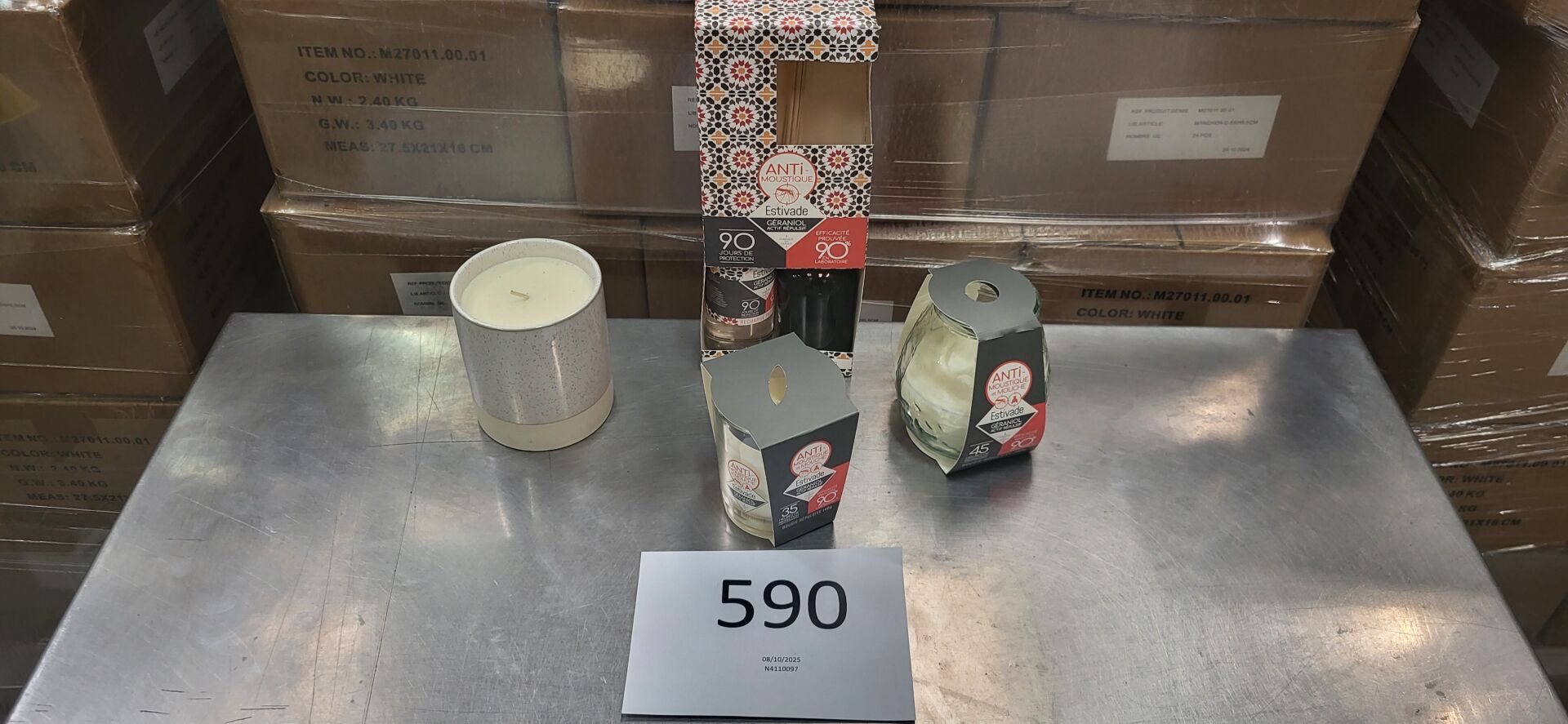 Sur 11 palettes un lot d'environ 7878 bougies, contenant et accessoires senteurs dont: environ 4320 bougies verre low boy blanc/geraniol, environ 2160 bougies verre 140g blanc/geraniol, environ 840 diffuseurs essaouira geraniol, environ 558 pots ceramique jardin de Kyoto (frais de mise à disposition 30 € TTC)